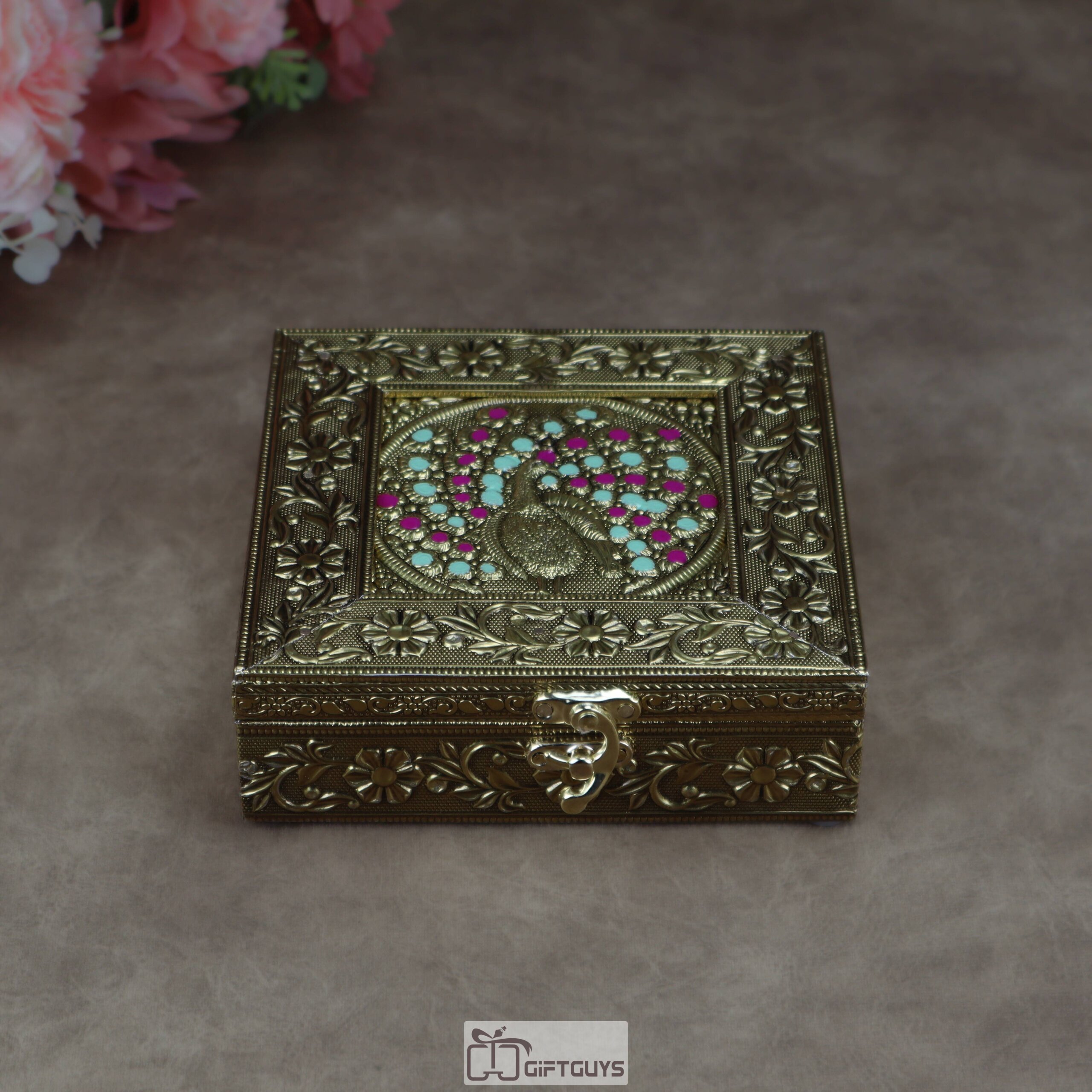 Intricate Artistry: The exterior features rich, embossed floral motifs and a central peacock motif adorned with vibrant teal and magenta enamel accents.