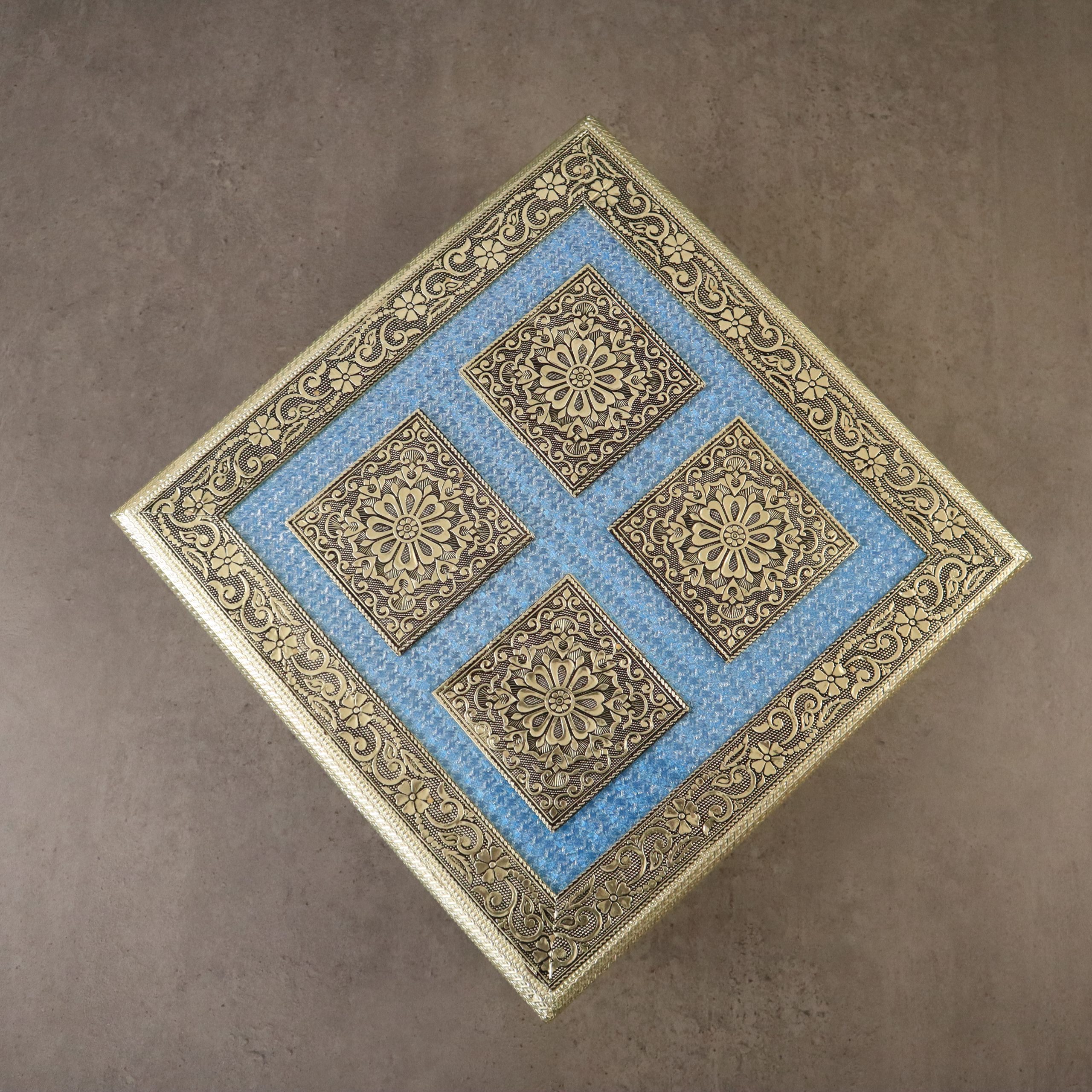 🔹 Elegant Lid: The top cover features blue textured inlays and antique floral motifs that add a royal touch.