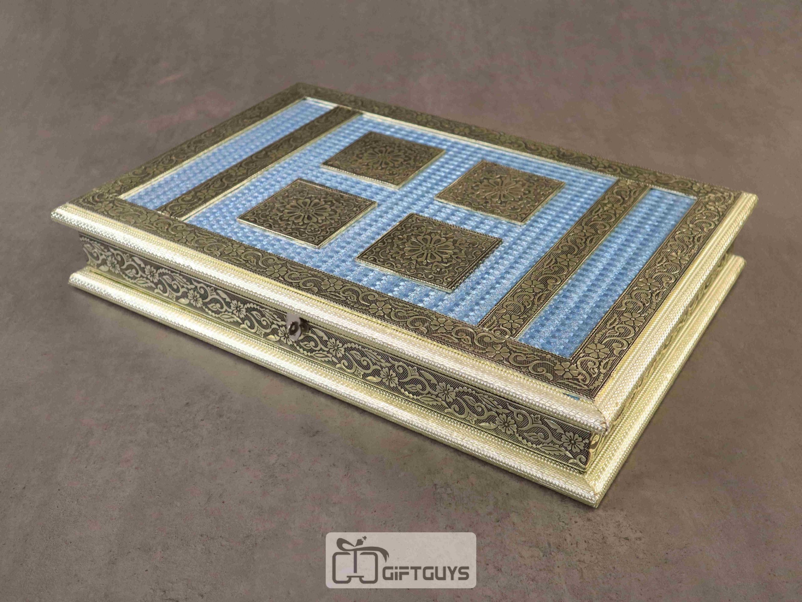 🔹 Elegant Lid: The top cover features blue textured inlays and antique floral motifs that add a royal touch.