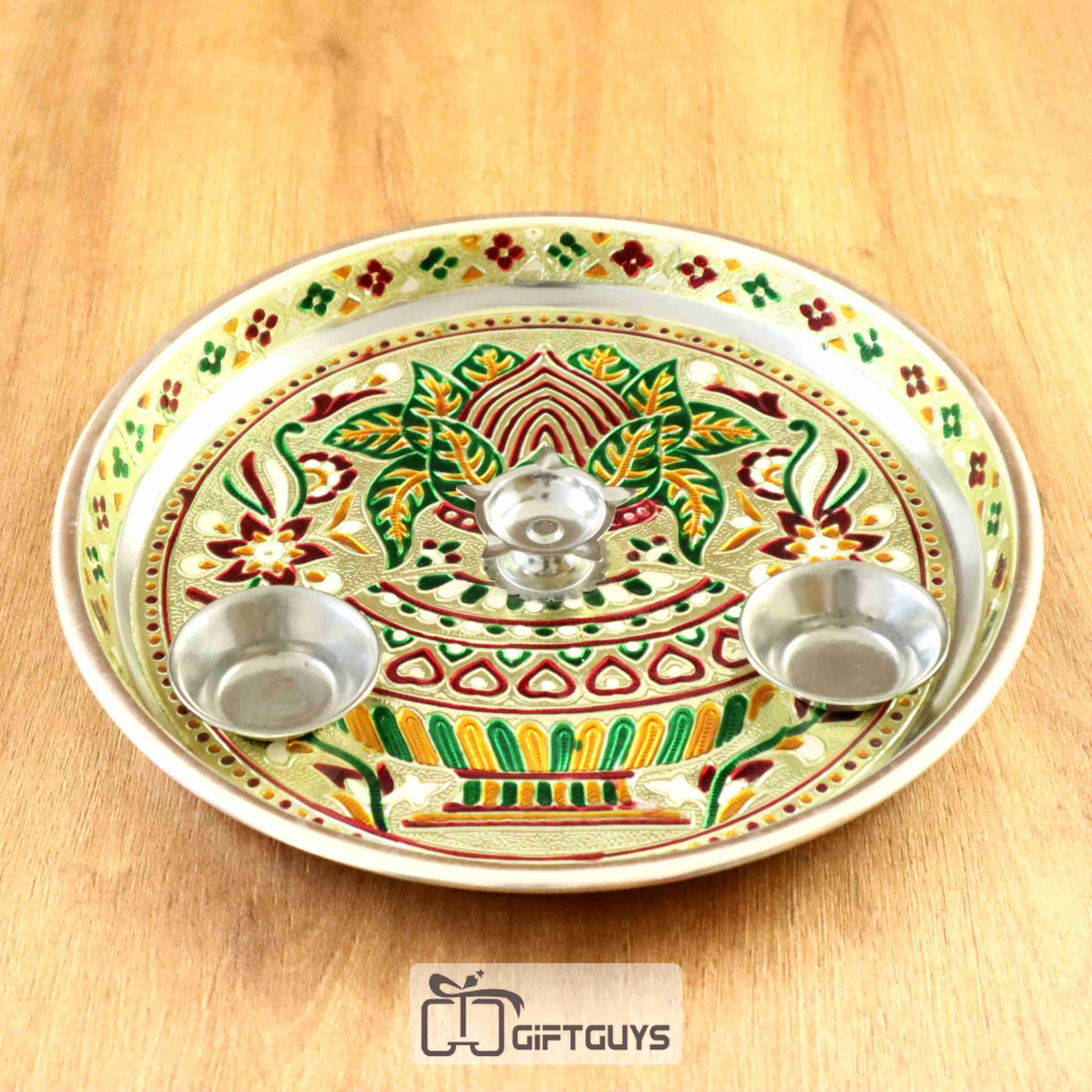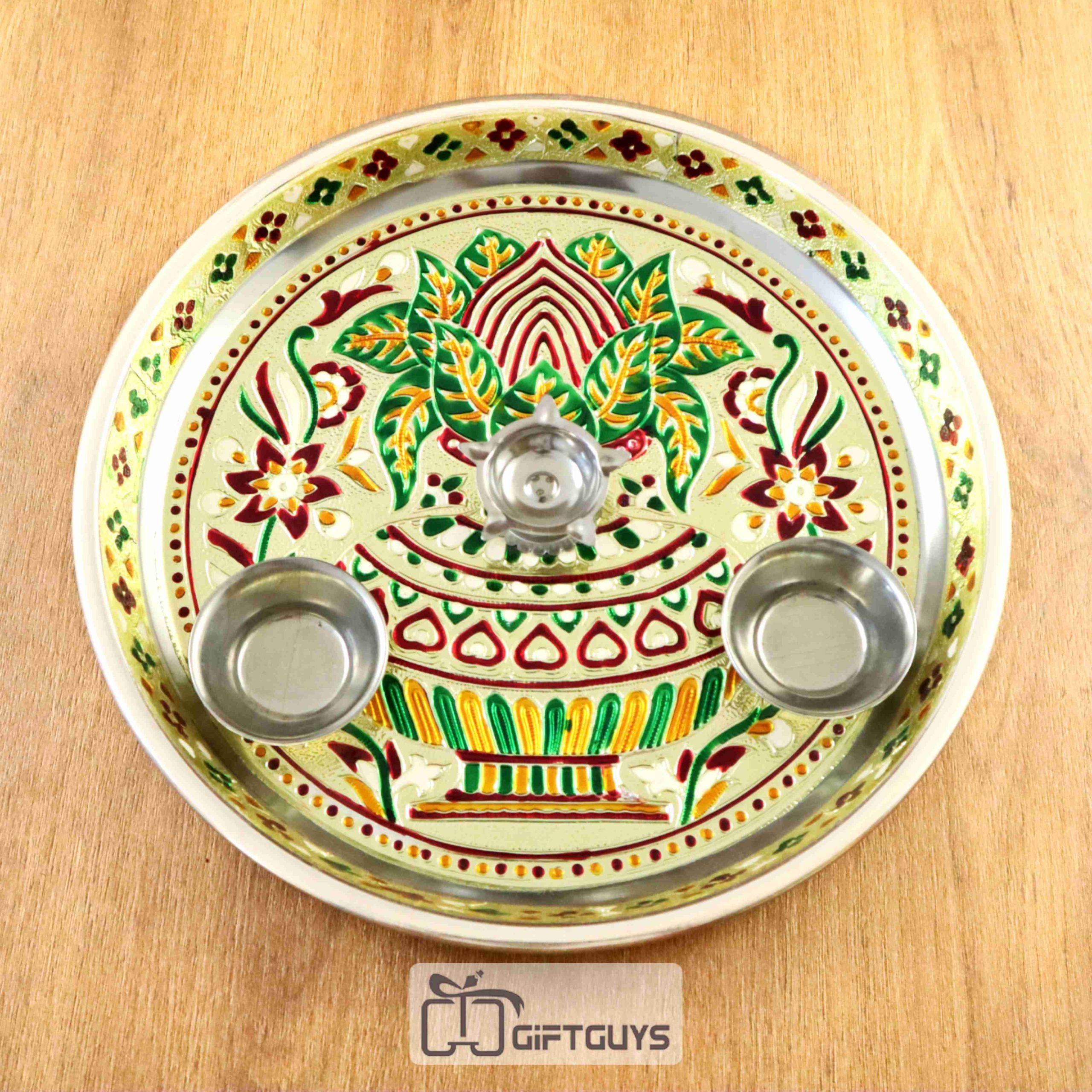 Invoke blessings with this radiant Golden Meenakari Steel Pooja Thali, adorned with vibrant Kalash art. Its reflective golden enamel and intricate detailing make it a perfect blend of tradition and elegance.