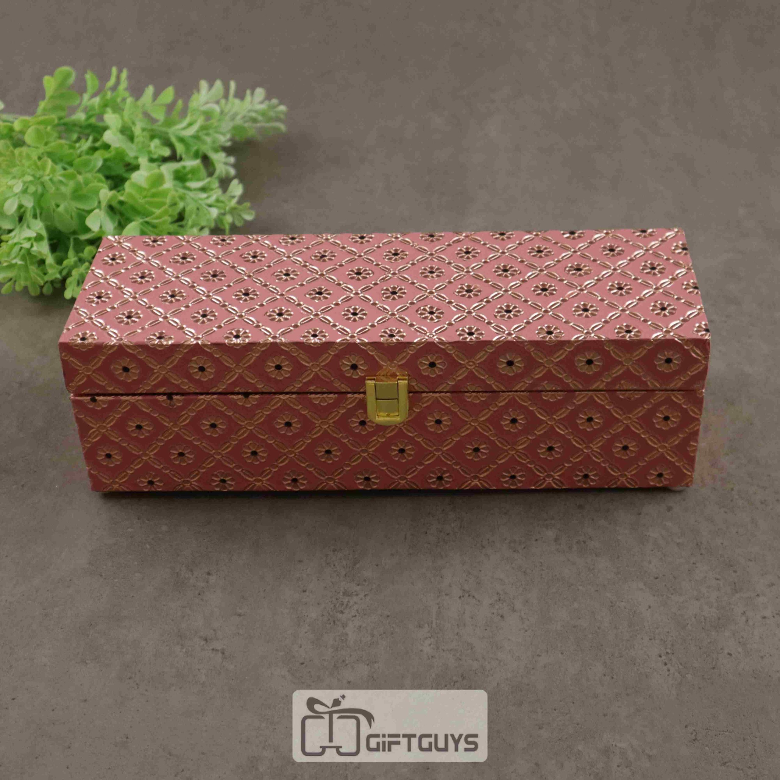 A Meenakari Worked Dryfruit Box is a beautifully crafted container, combining functionality with traditional Indian artistry. Made from wood or metal, the box is adorned with intricate meenakari work, a technique that involves applying vibrant enamel colors to create detailed patterns and designs. These designs often feature floral motifs, birds, or geometric shapes, adding a touch of elegance and charm. The box serves as a stylish storage solution for jewelry, keepsakes, or other valuable items. Its rich colors and exquisite craftsmanship make it not only a practical item but also a stunning decorative piece, perfect for home decor or gifting.