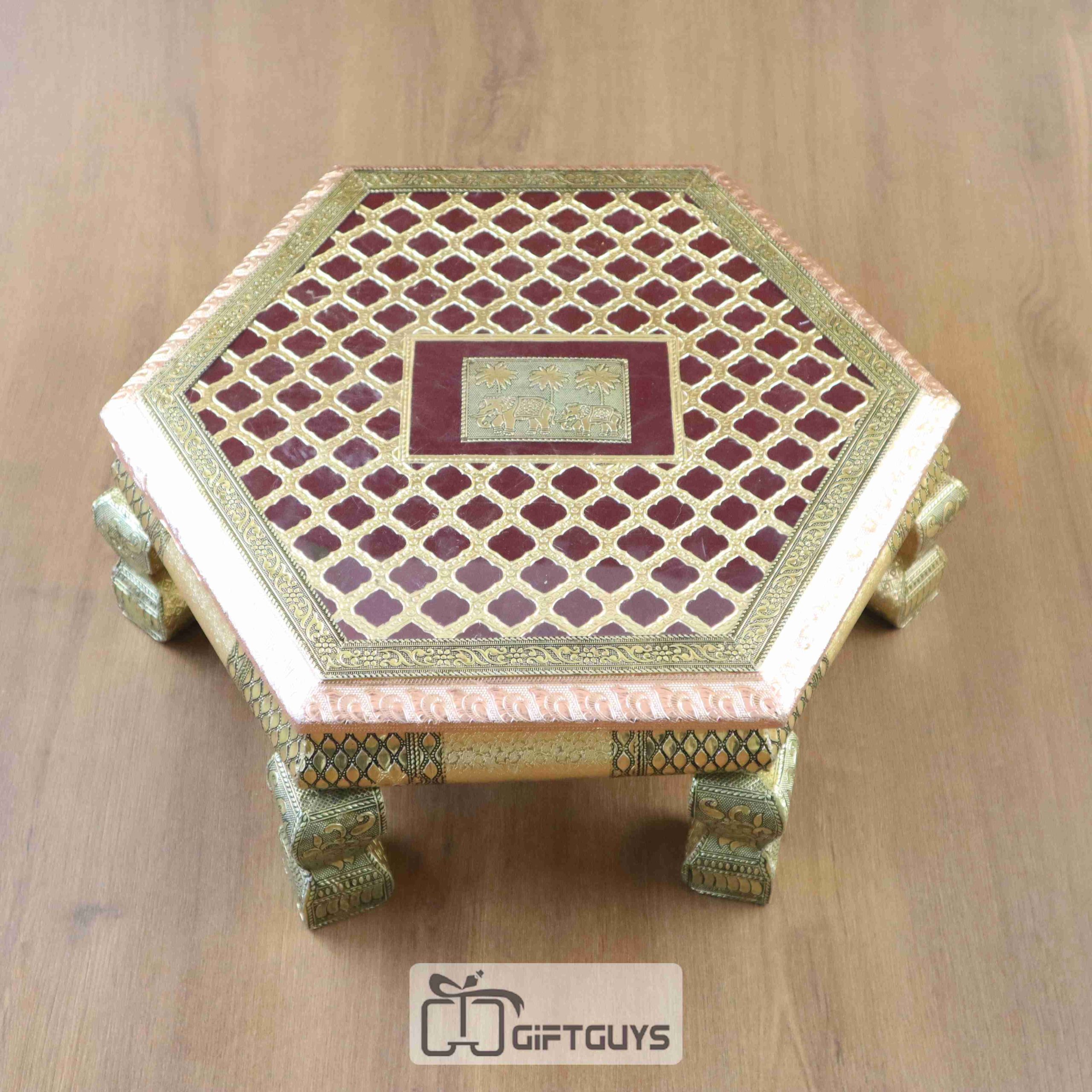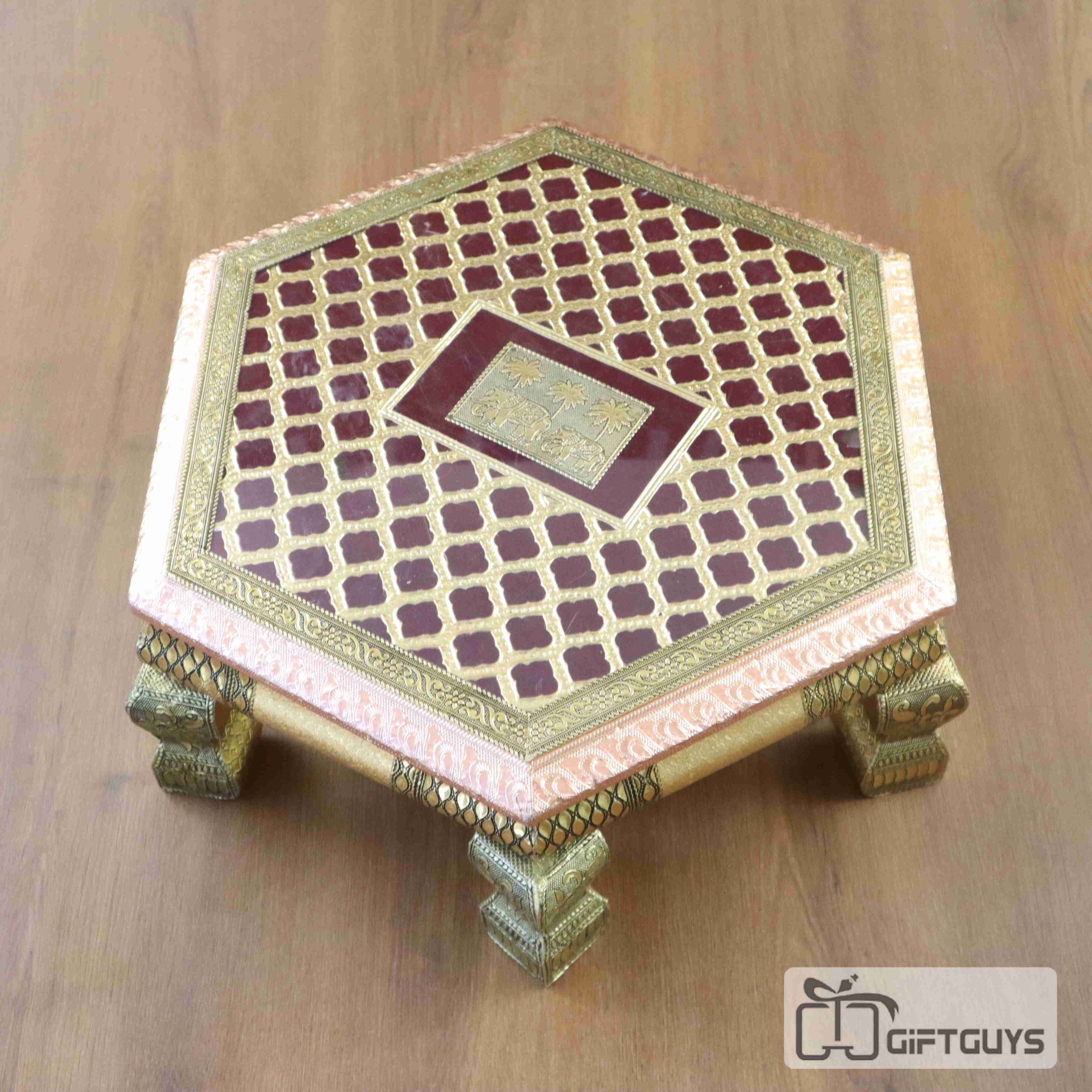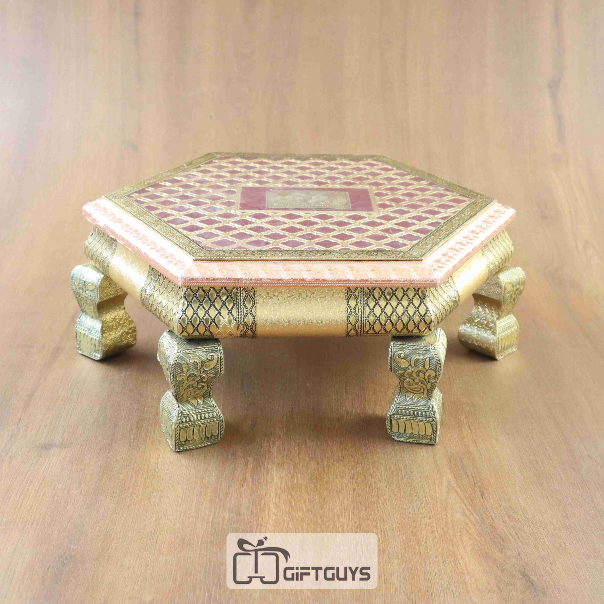 A wooden handcrafted oxidized Bajoth is a traditional Indian decorative piece, often used in spiritual or cultural settings. Made from high-quality wood, this piece is intricately carved by skilled artisans, showcasing fine craftsmanship. The oxidized finish gives the wood an antique appearance, enhancing its rustic charm and adding depth to its intricate designs. Bajoth, commonly used as a pedestal or base for idols, is adorned with detailed patterns and motifs, making it a focal point in any space. This combination of wood and oxidized detailing brings together artistry and function, making it a beautiful addition to homes or temples.
