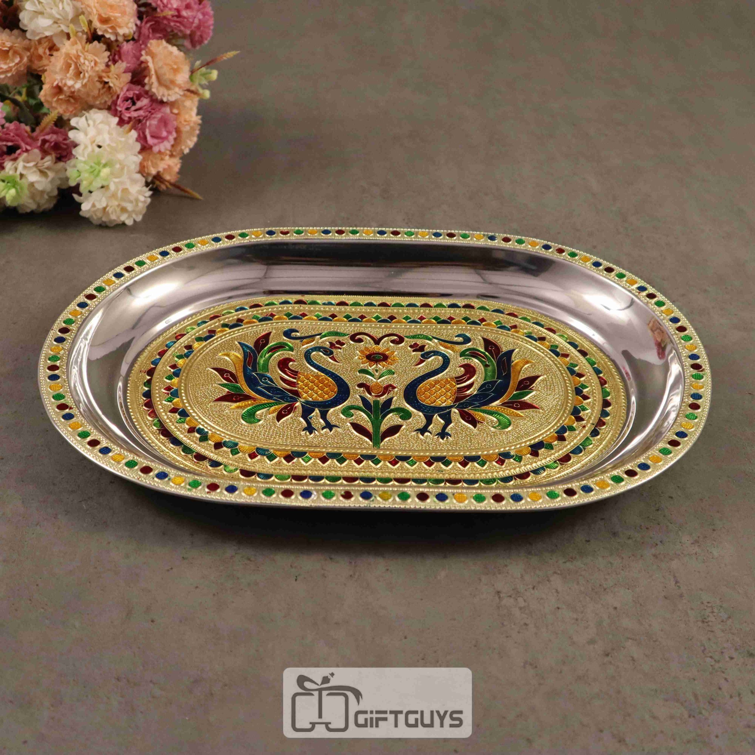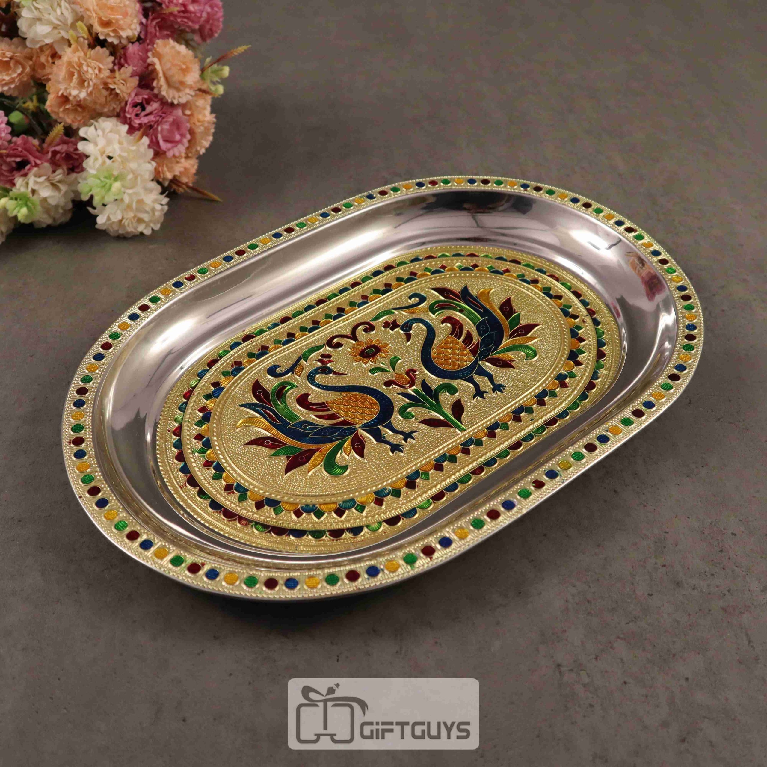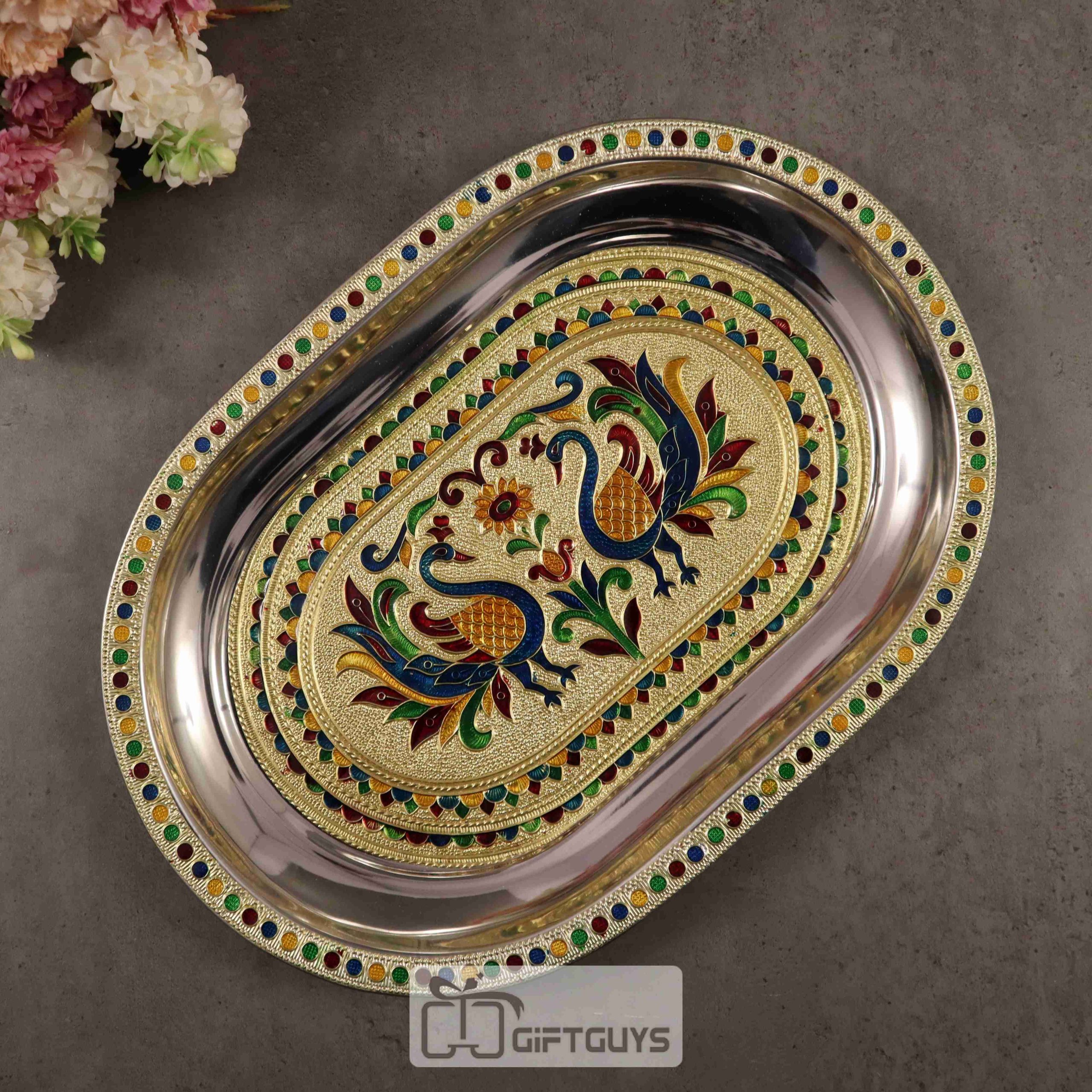 Golden Meenakari Peacock Design Decorative Oval Tray – 12 X 8.5 Inch