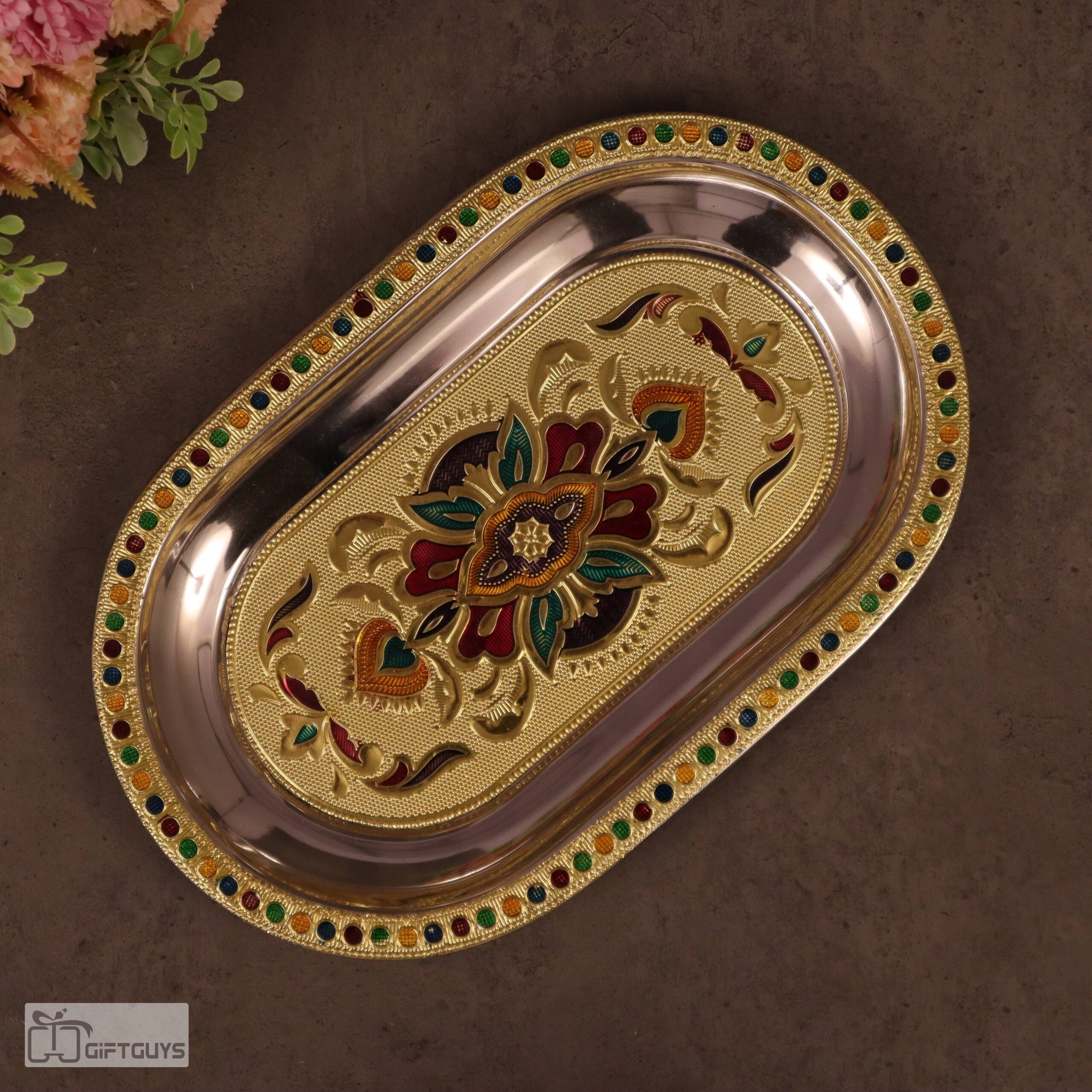 • 🍽️ Elegant Tray Design: 10.5 x 6.5 inch oval tray with embossed detailing and colorful Meenakari border.