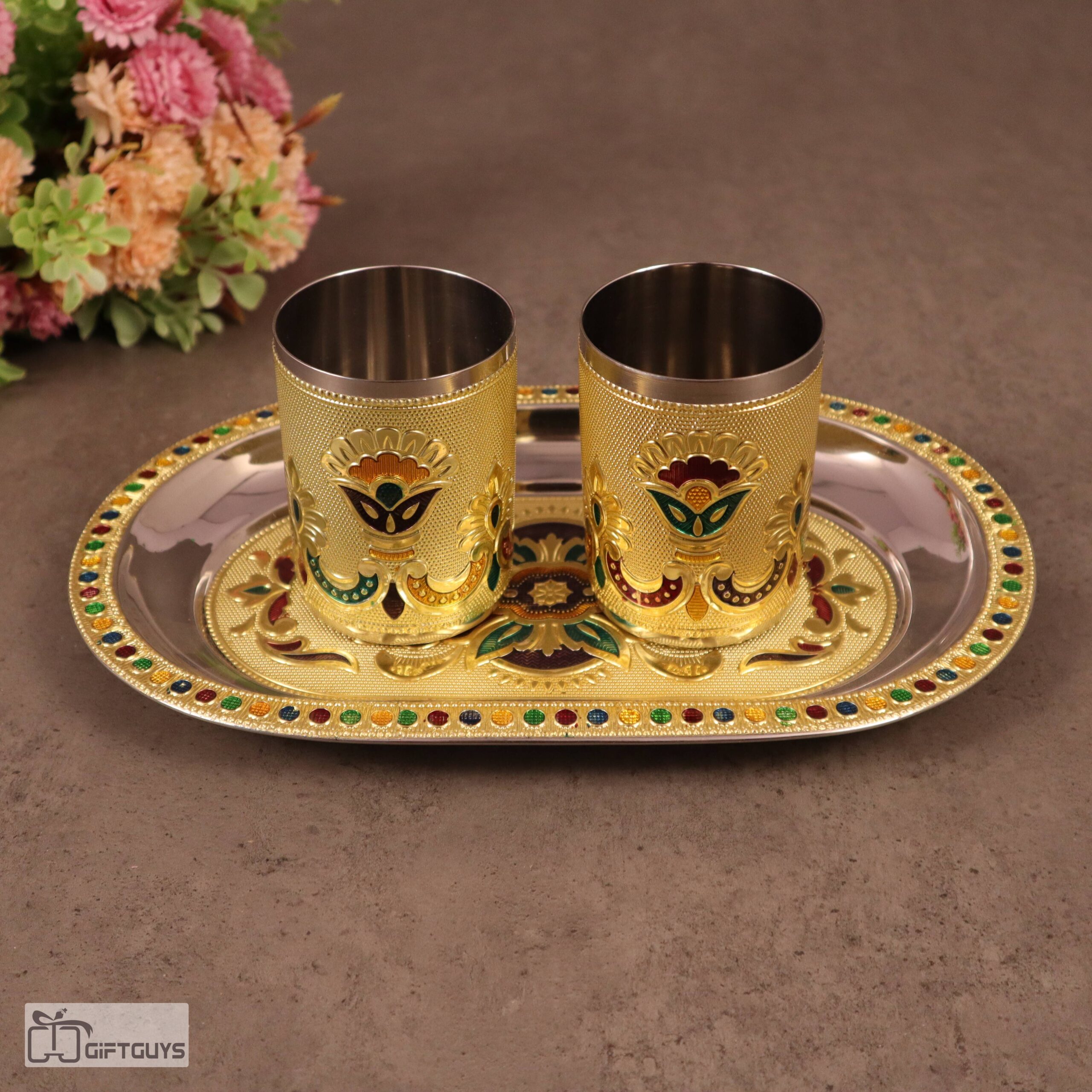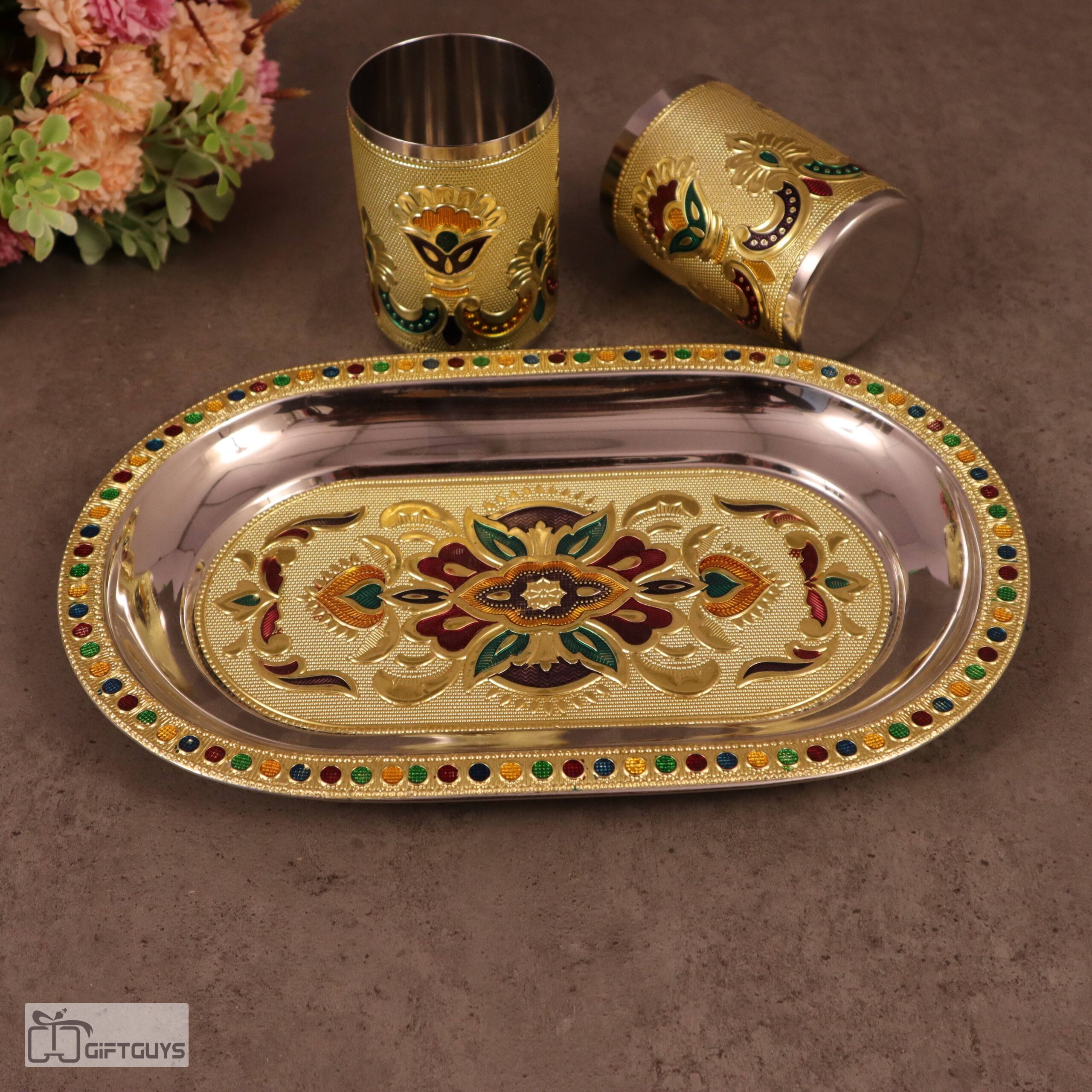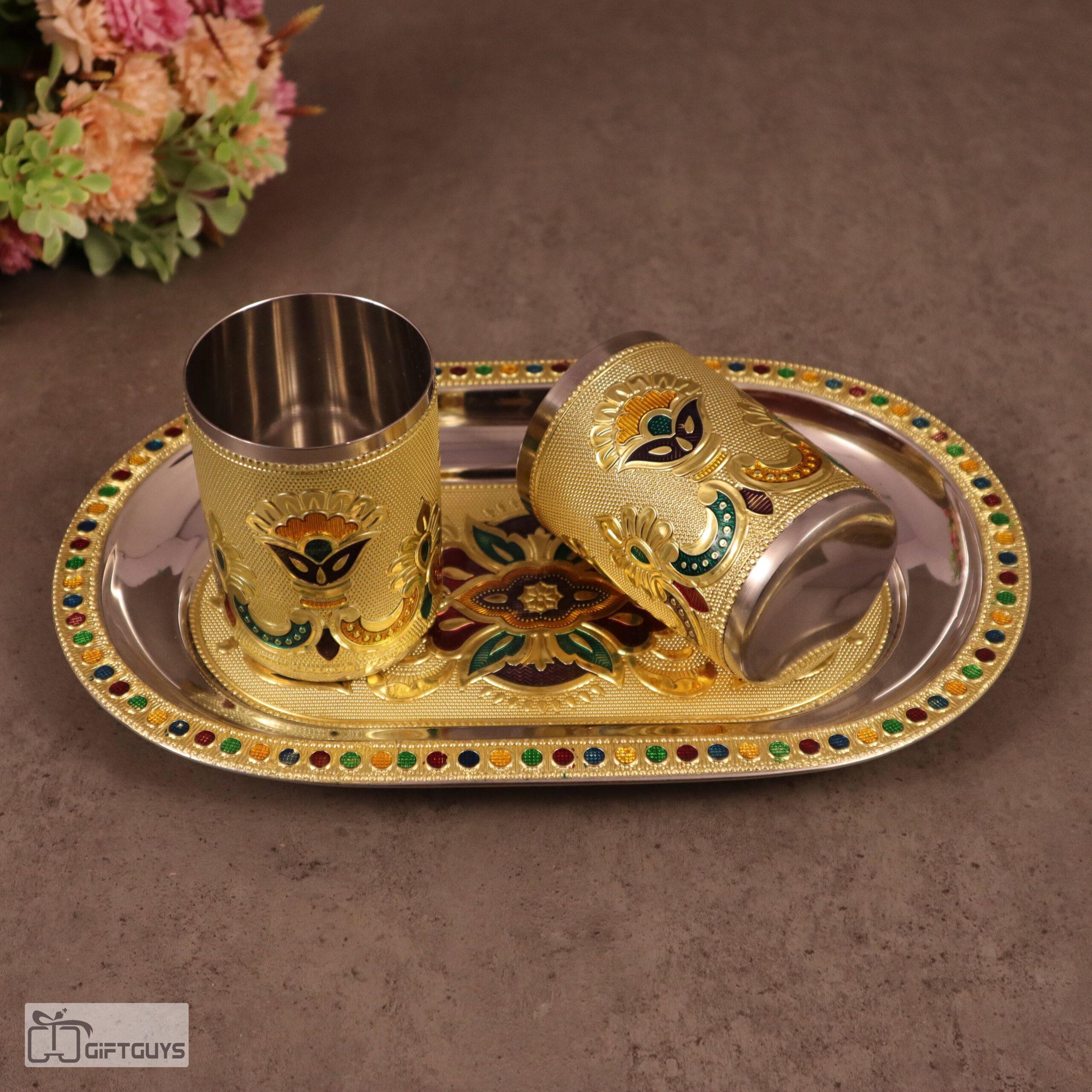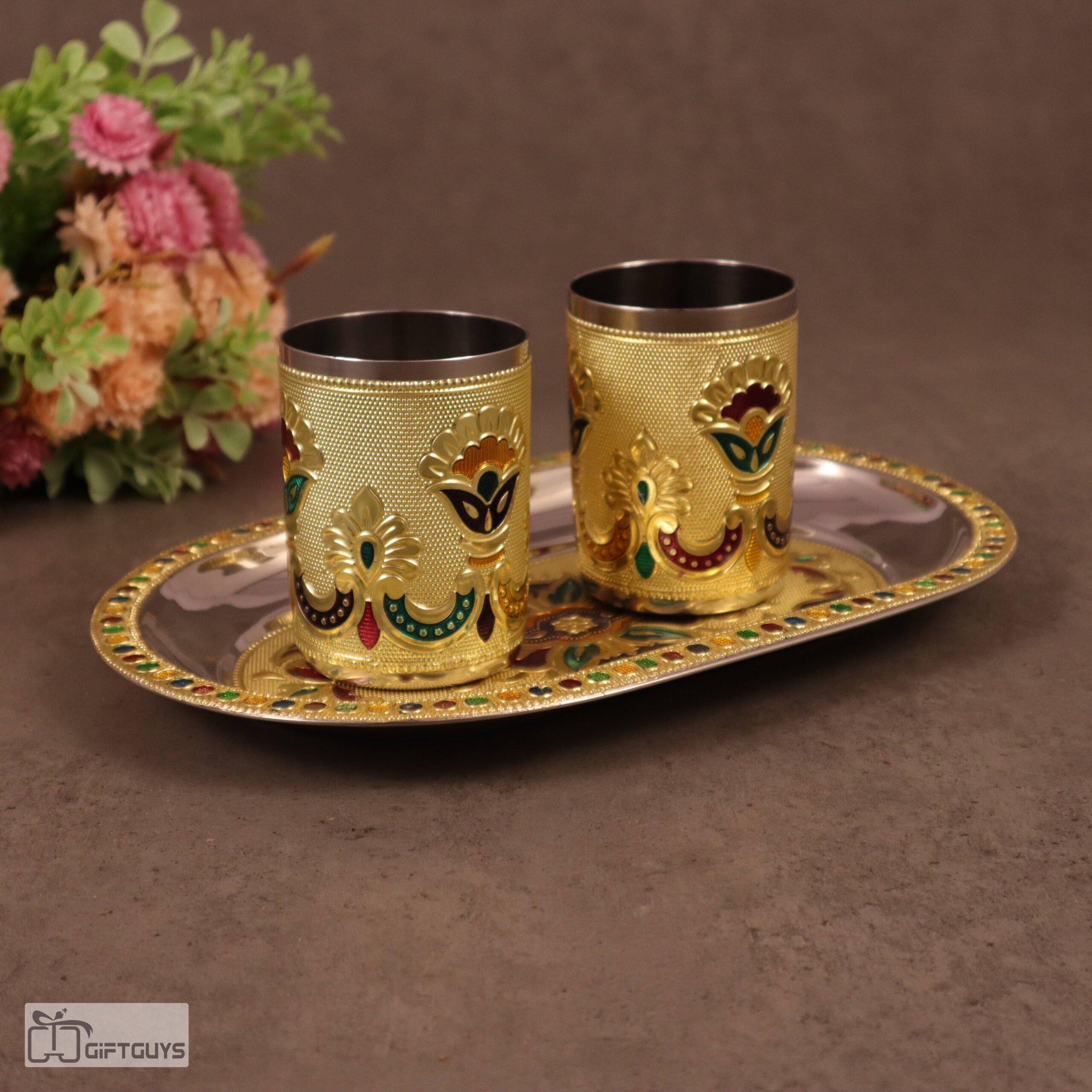 Golden Meenakari Tray Set with 2 Glasses – 250ml | Decorative Steel Serving Set – 10 X 6.5 Inch