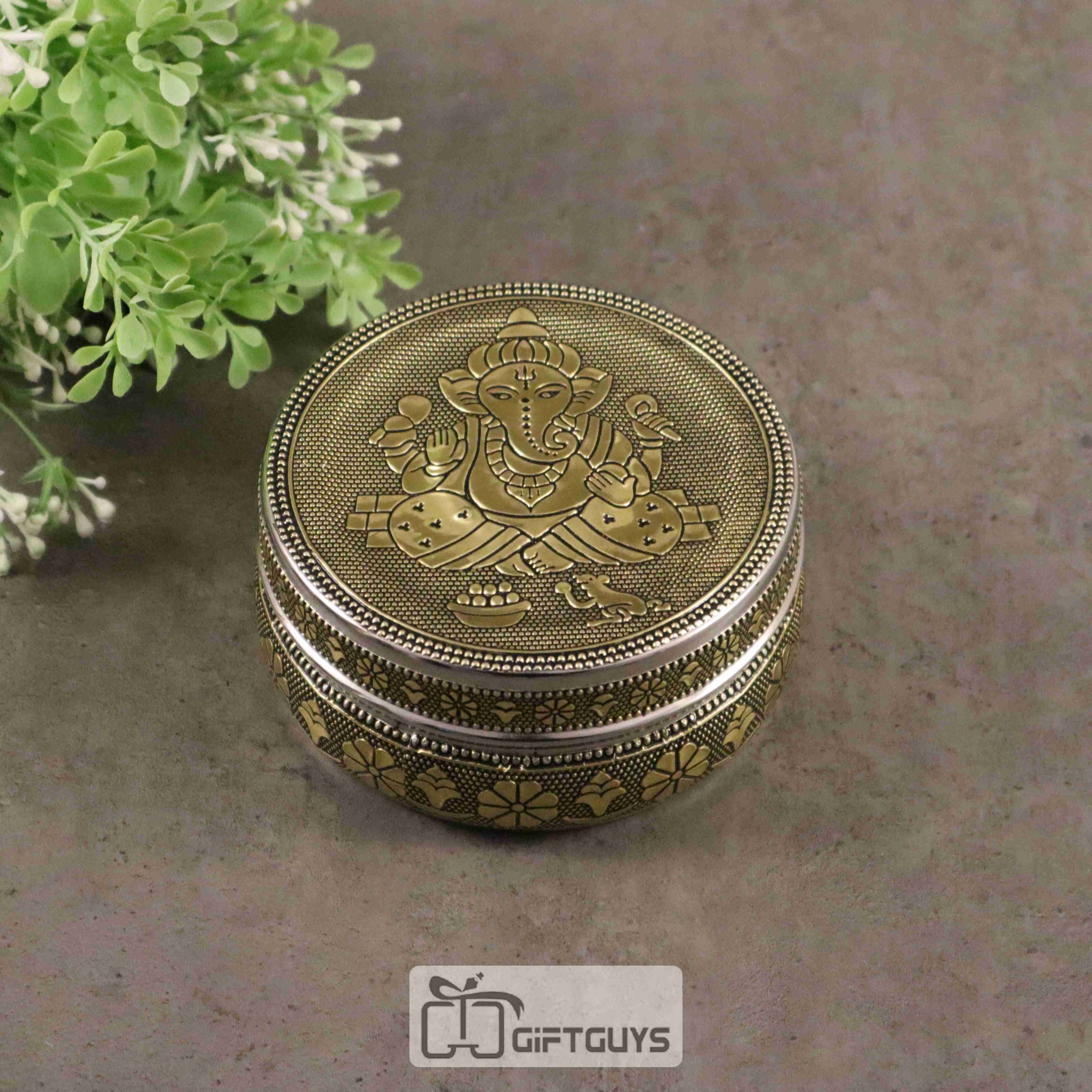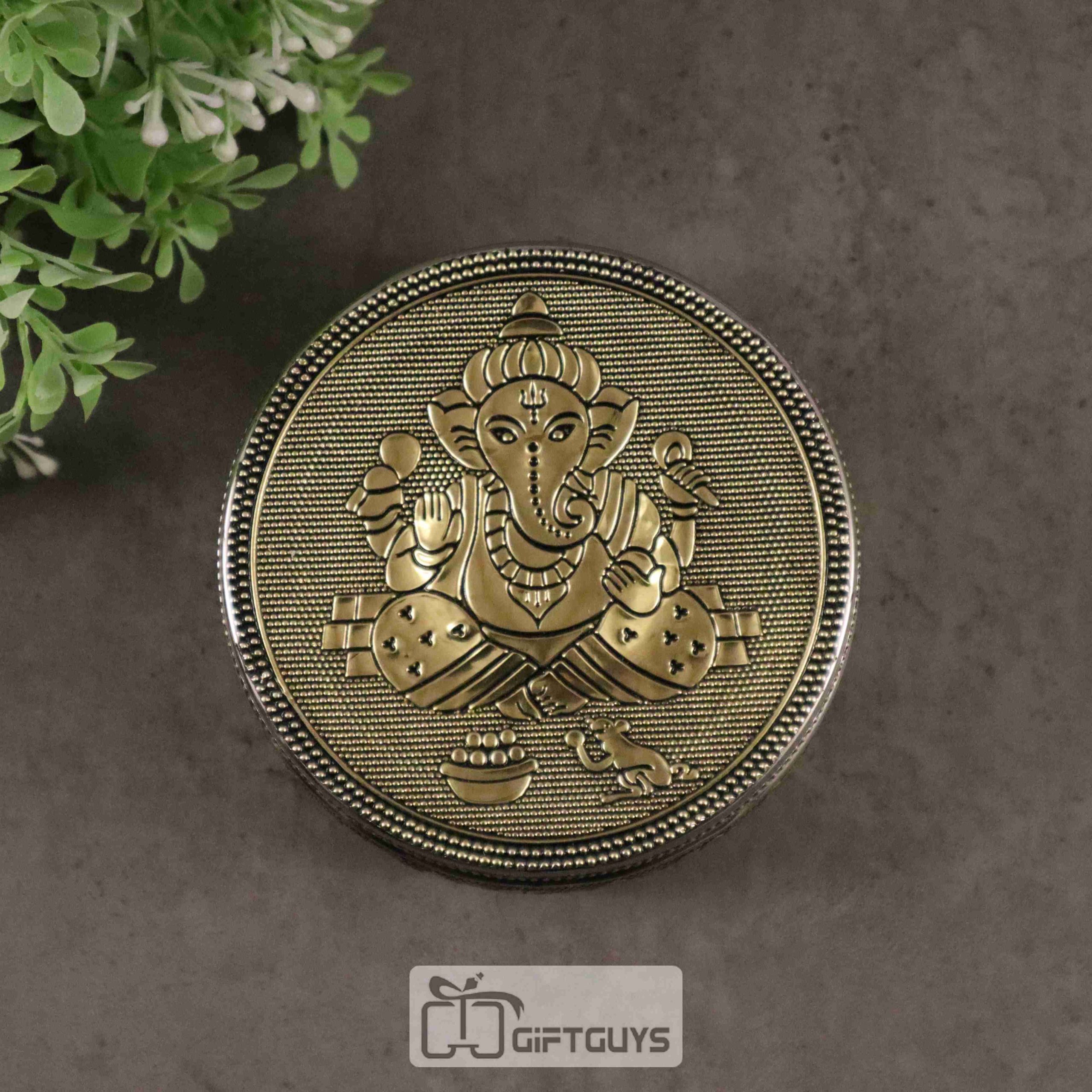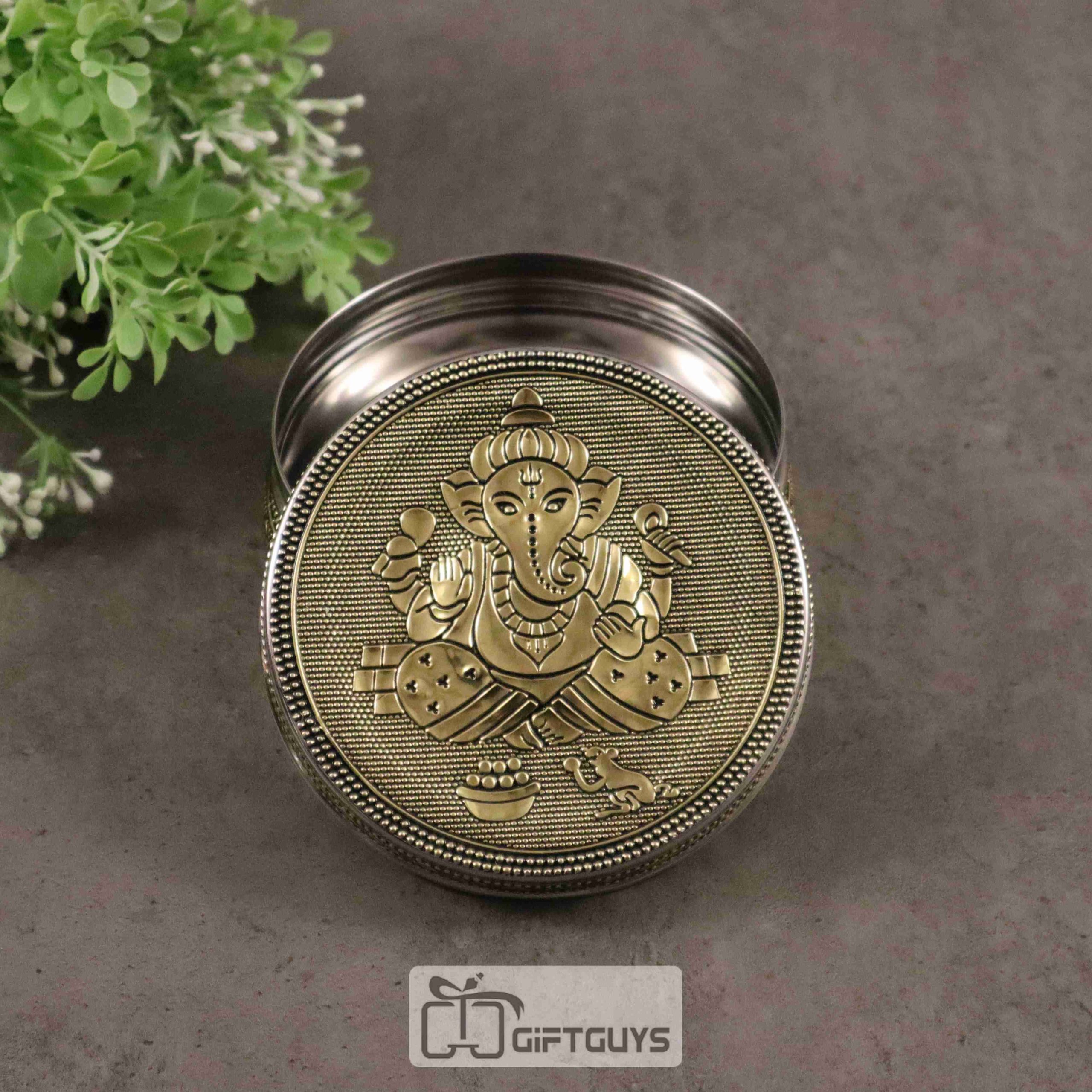 Golden Finish Ganesha Design Steel Box – Decorative Storage Container for Pooja & Gifts (4-Inch)
