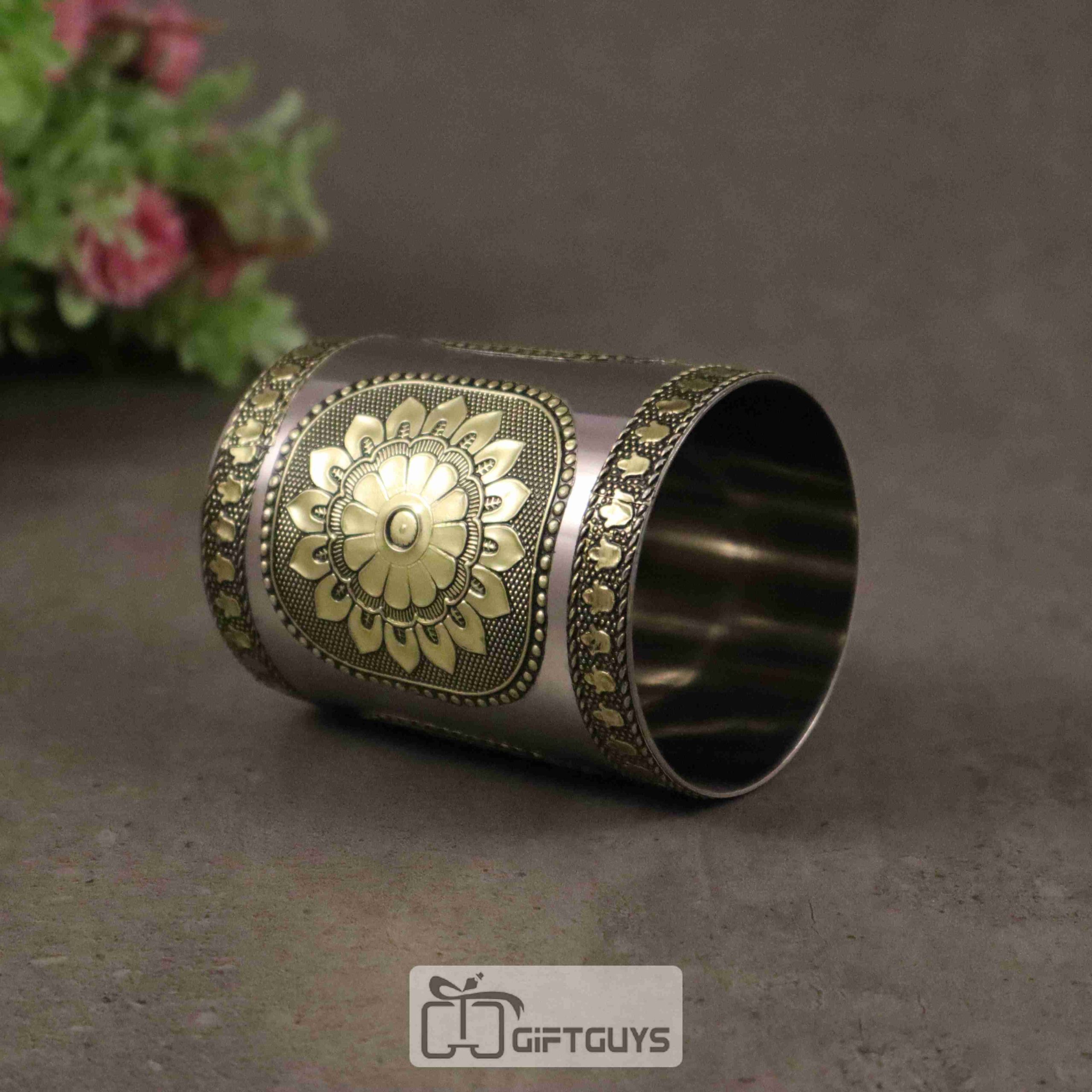 Elegant Oxidised stainless steel glass with a traditional floral mandala design in earthy tones. With a 250 ml capacity and compact size (2.5″ diameter, 3.5″ height), it’s perfect for home use or gifting.