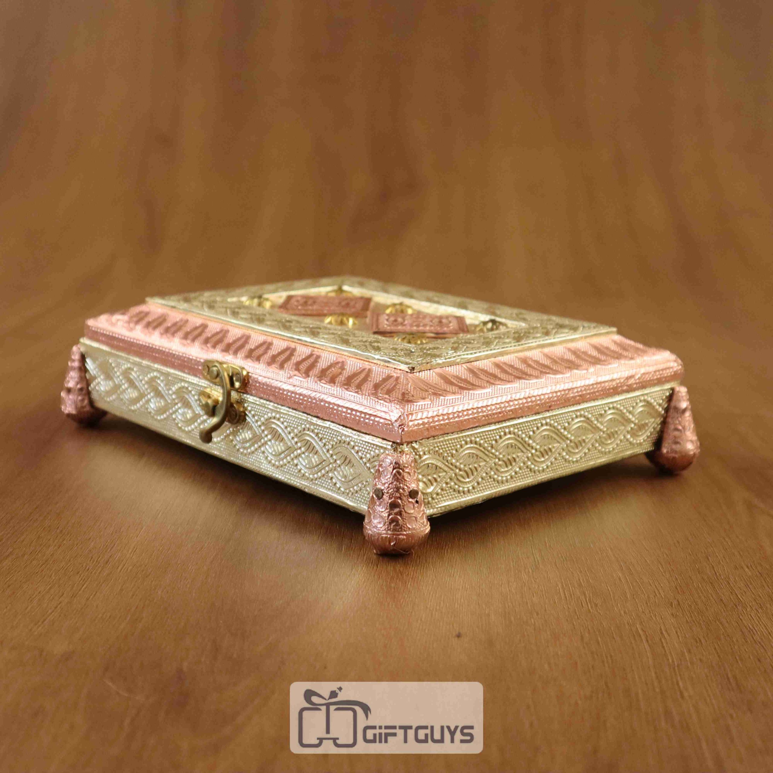 Luxurious rose-gold embossed dry fruit box with 4 partitions and elegant legs – perfect for gifting or festive decor.