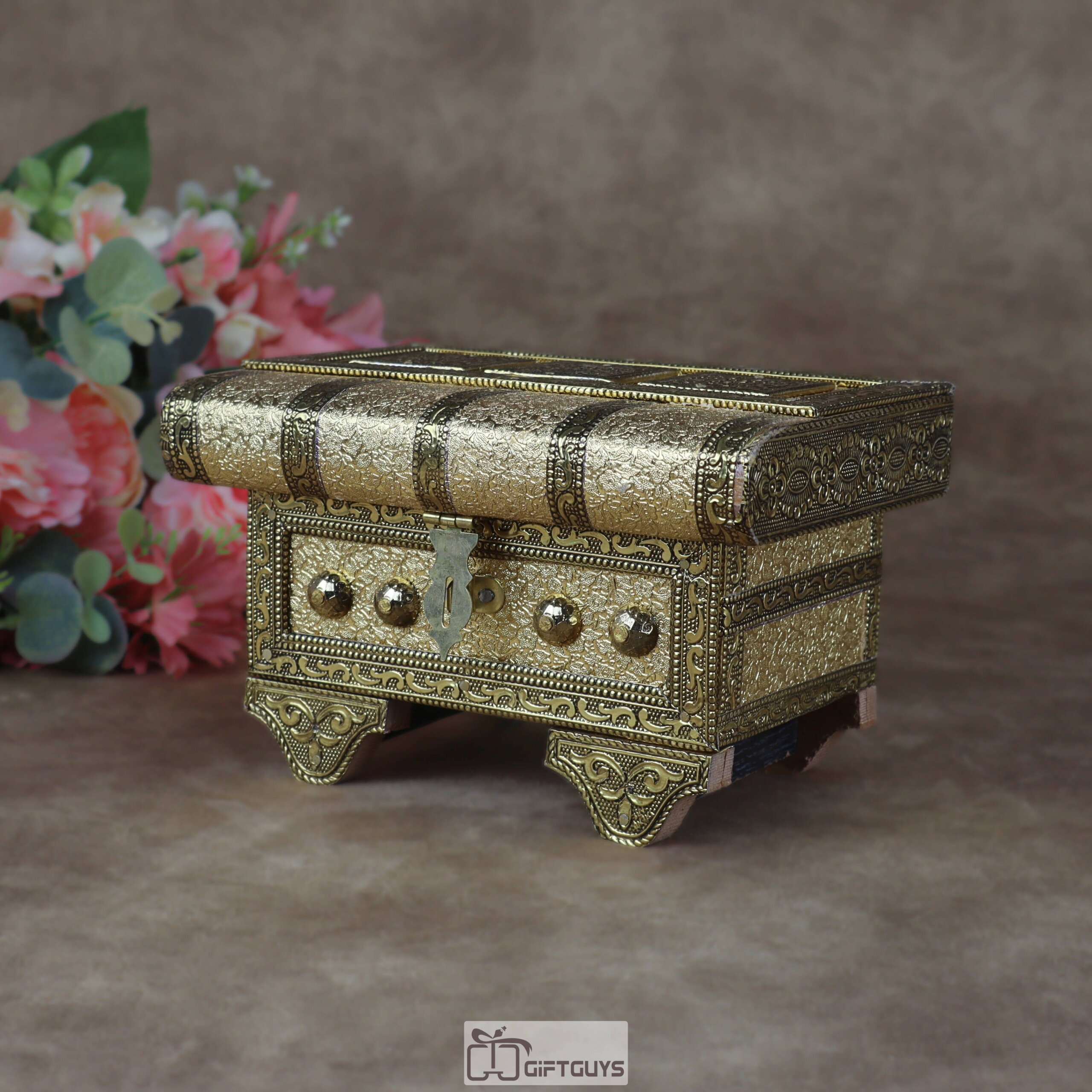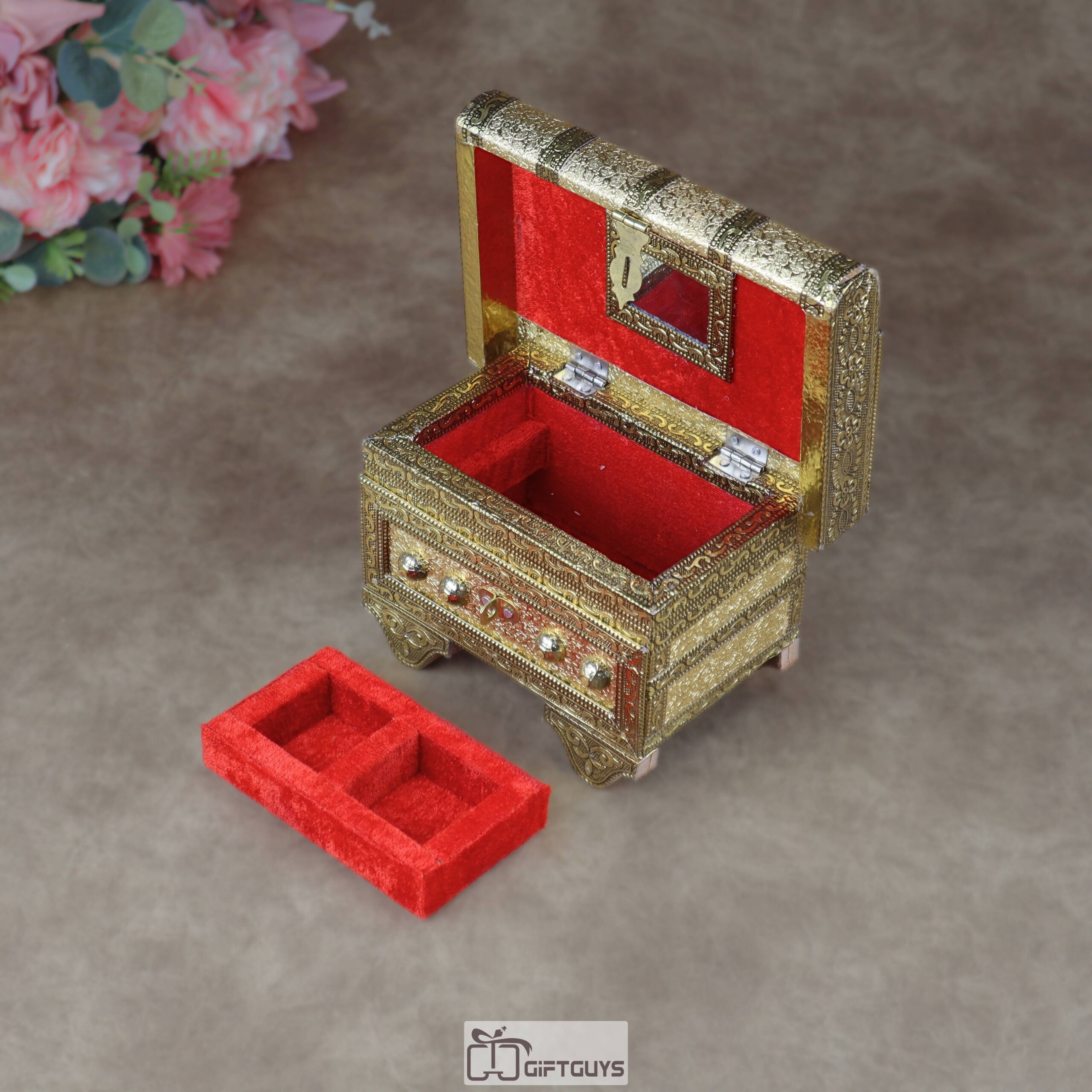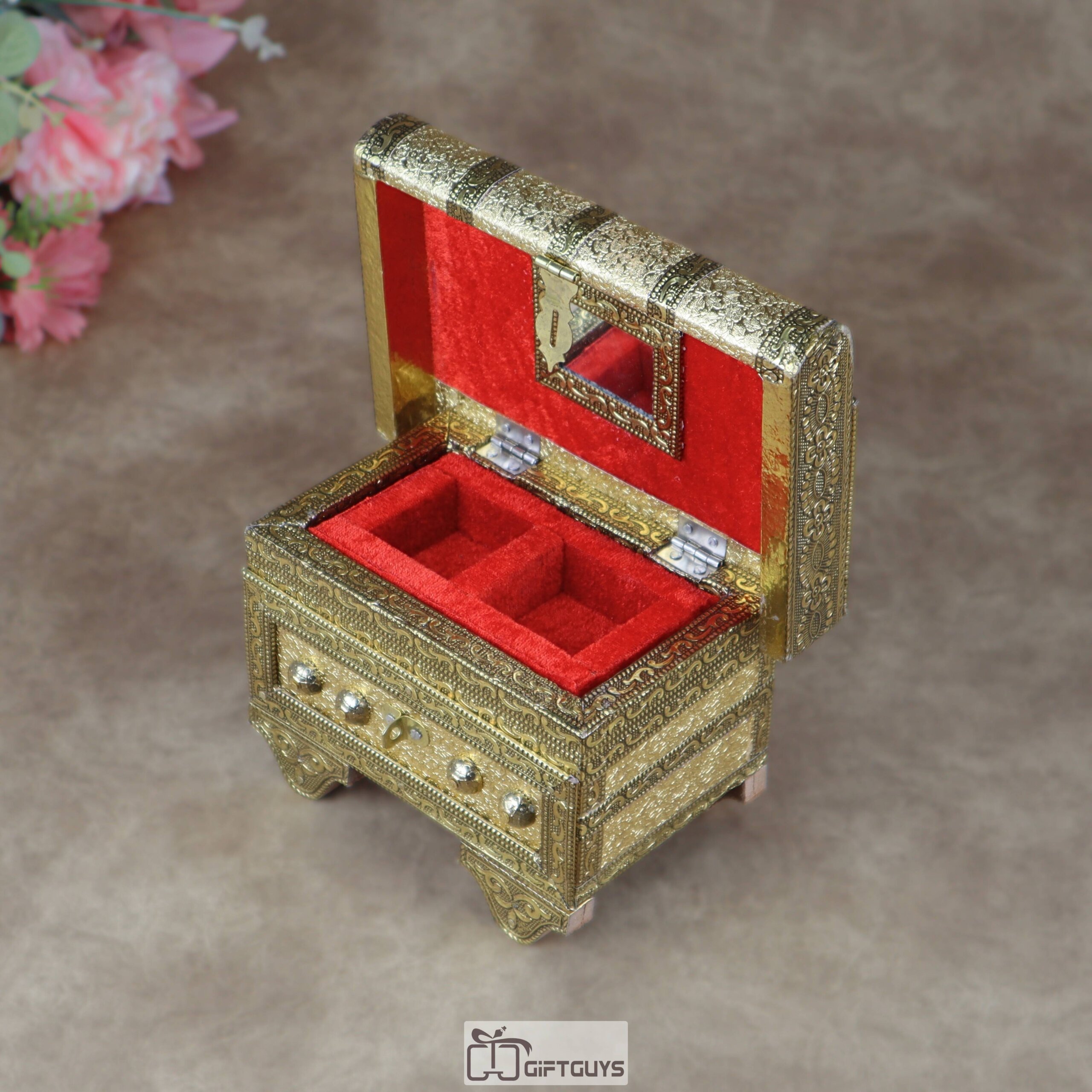 Handcrafted Golden Oxidized Wooden Jewelry Box – Traditional Antique Style Velvet Lined Sandook with Removable Tray and Mirror