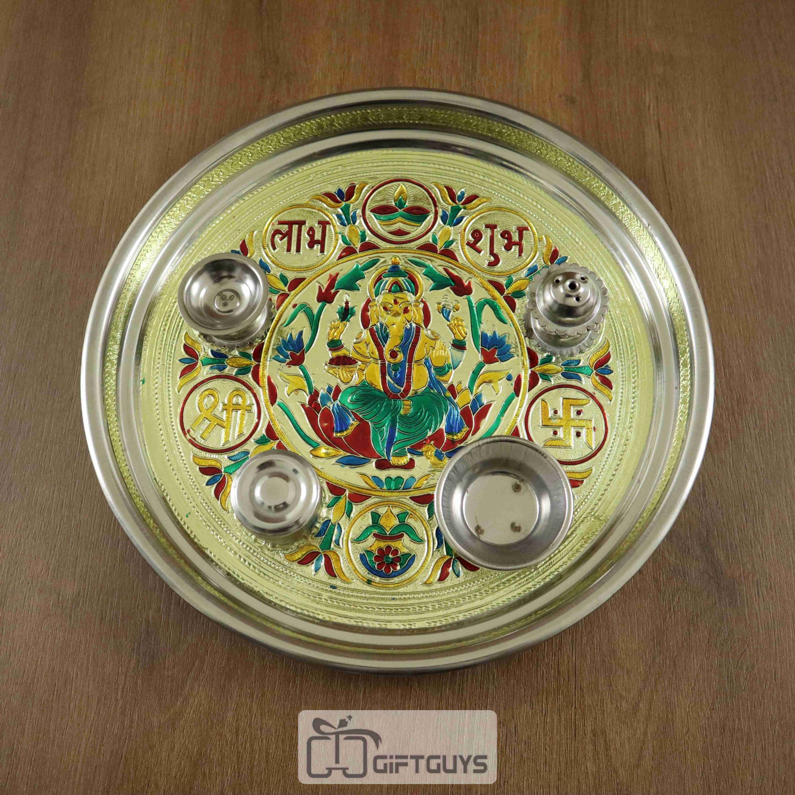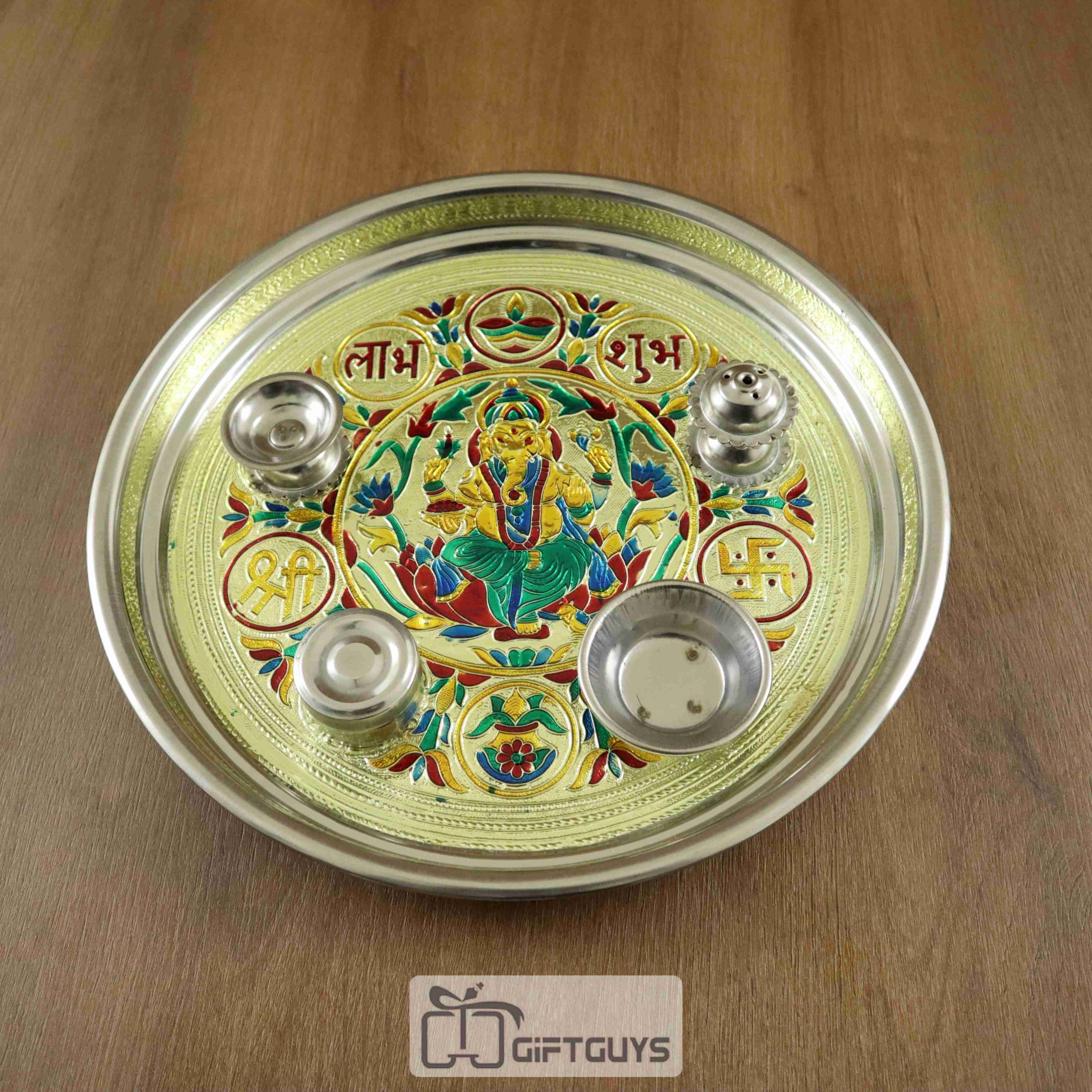 Golden Meenakari Steel Pooja Thali – Ganesha Design with 4 Accessories