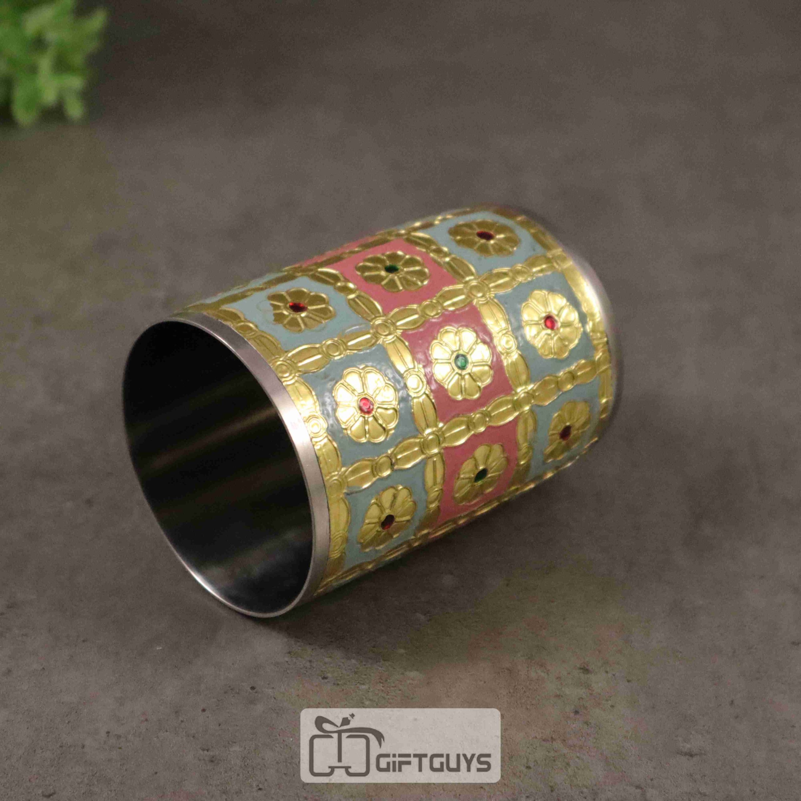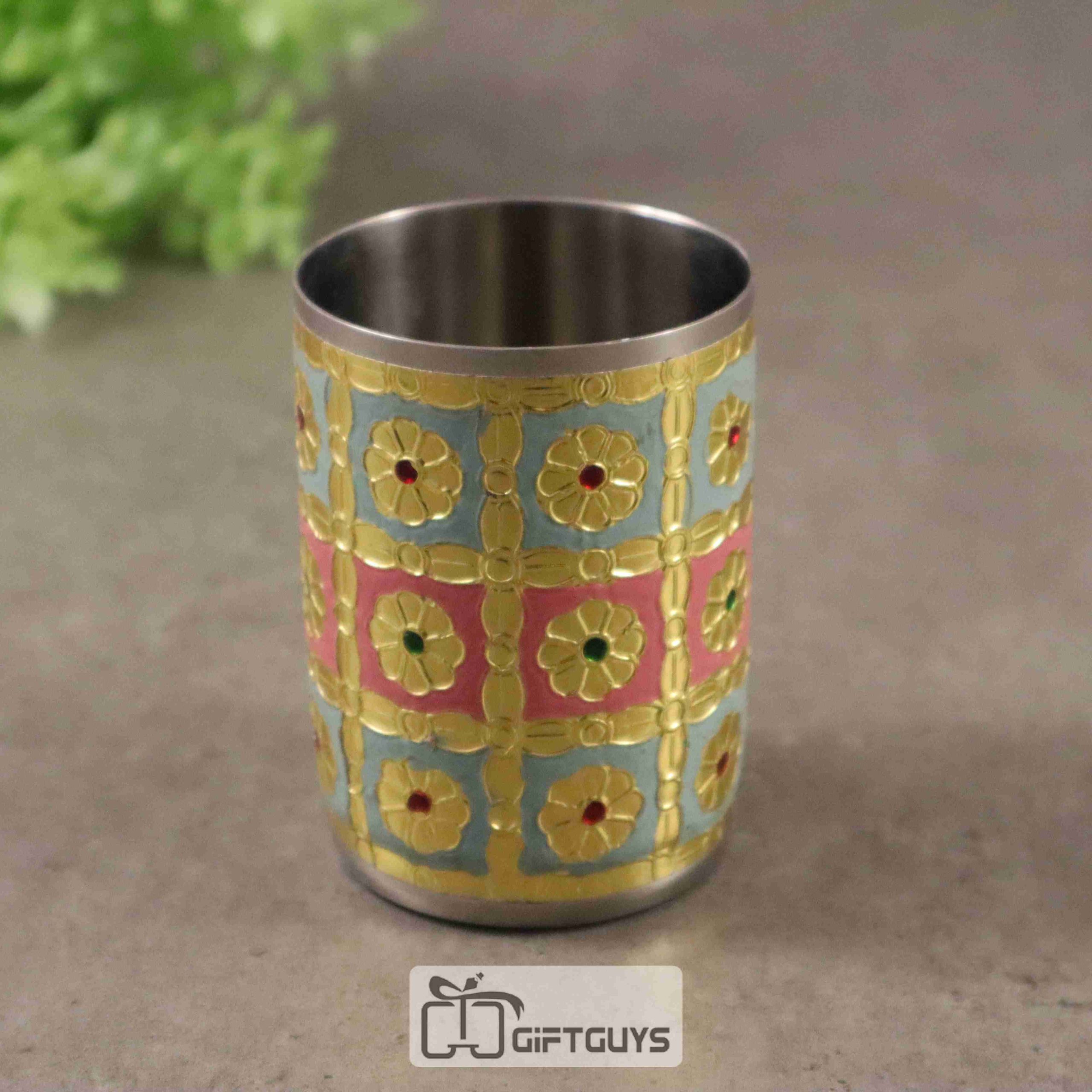 Handcrafted stainless steel glass with intricate Pink & Blue floral Meenakari work. 250 ml capacity with 2.5″ diameter and 3.5″ height. A vibrant addition to festive tableware or gifting