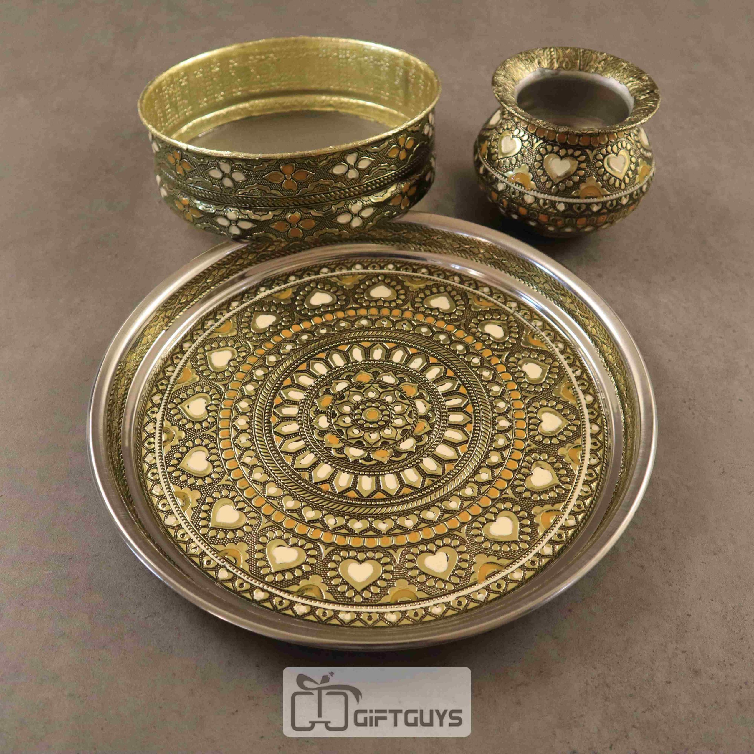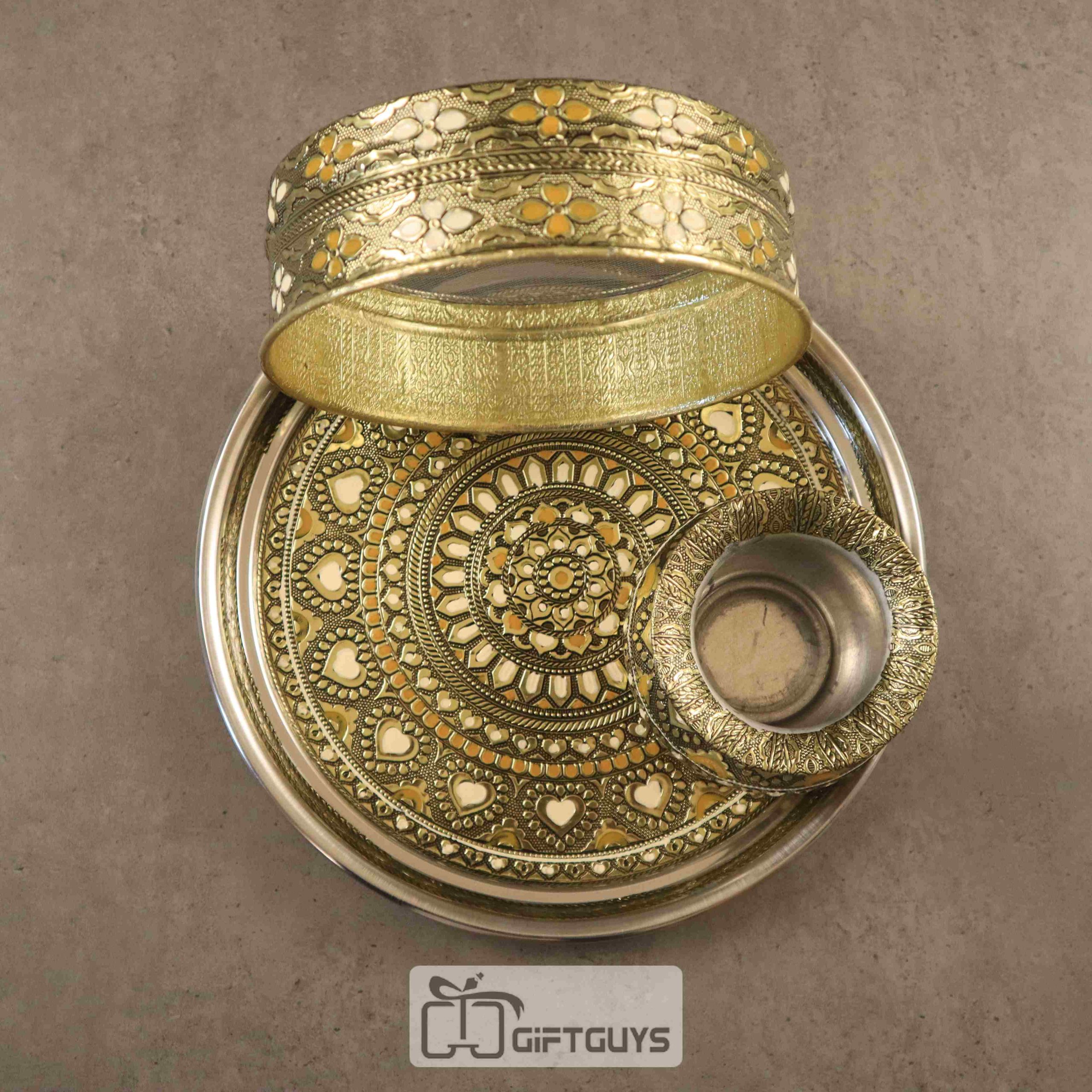 A Karvachauth Pooja Thali is an essential item used during the Karvachauth festival, a Hindu tradition where married women fast for the well-being and longevity of their husbands. The thali is a decorative tray that holds all the items required for the ritual, such as a small diya (lamp), a sieve, water, a silver or copper container, fruits, and sweets. Often adorned with vibrant colors, intricate designs, and embellishments like beads or sequins, the thali is an important symbol of devotion. It serves as both a practical and ornamental piece, making the ceremony more meaningful and spiritually significant.