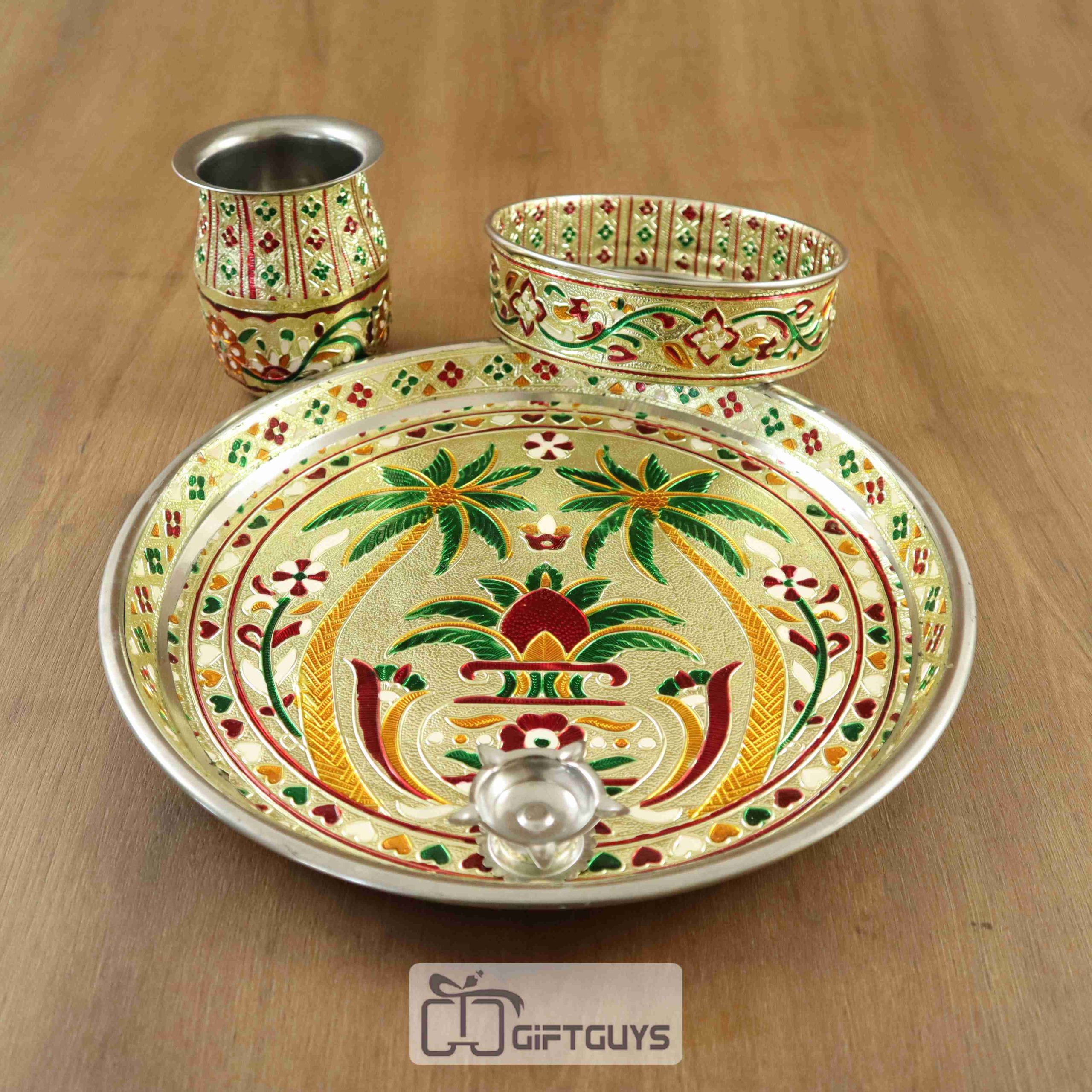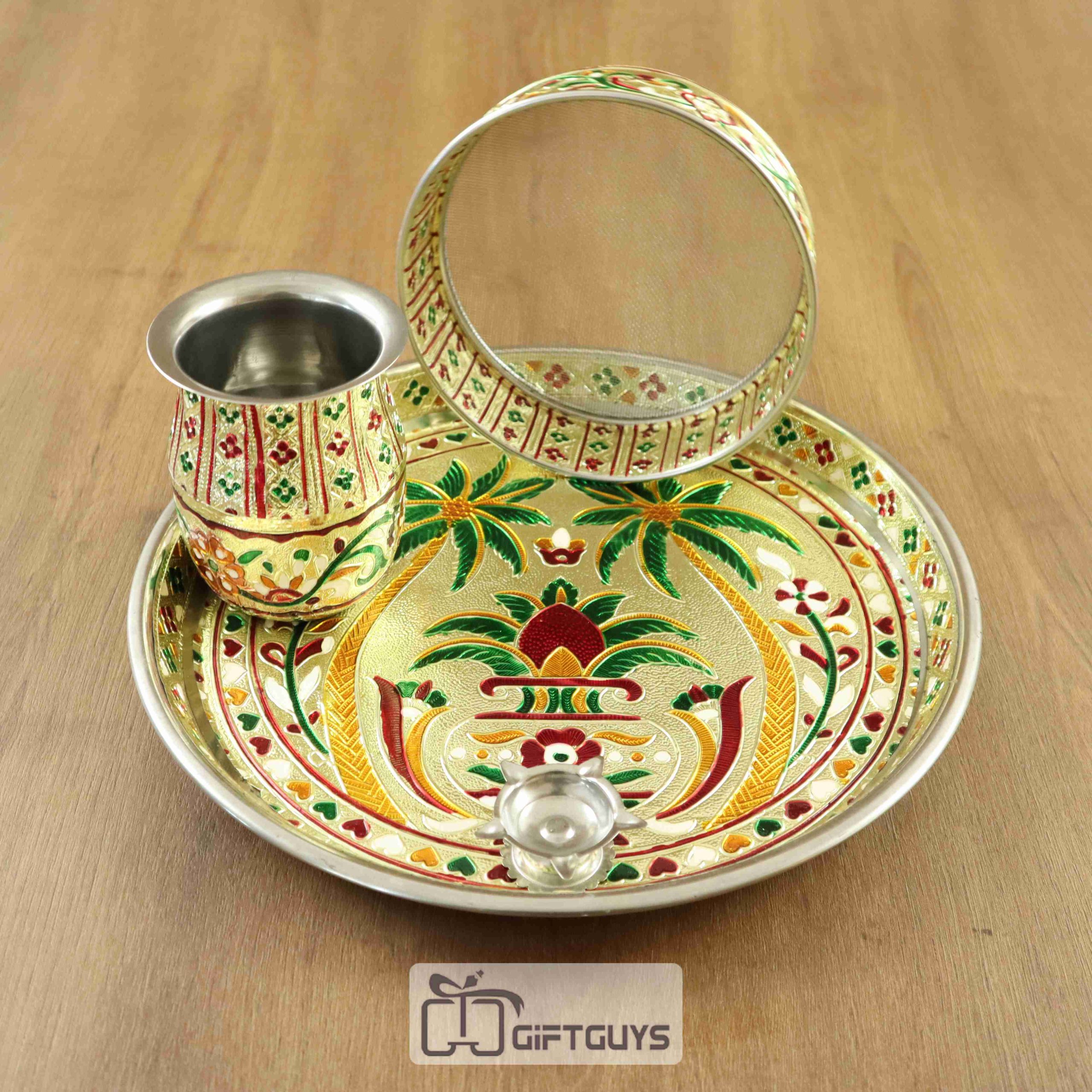 The SS Meenakari Karvachauth Pooja Thali is a beautifully crafted traditional Indian thali designed for the Karvachauth festival. Made with high-quality materials, it features intricate meenakari work, which adds vibrant colors and artistic detailing to its surface. The thali typically includes essentials like a small pooja diya (lamp), a container for sindoor (vermilion), a kalash (sacred water pot). Its delicate design reflects both cultural and spiritual significance, making it an elegant choice for Karvachauth rituals, symbolizing devotion, love, and prosperity in the marriage. It is both functional and ornamental.
