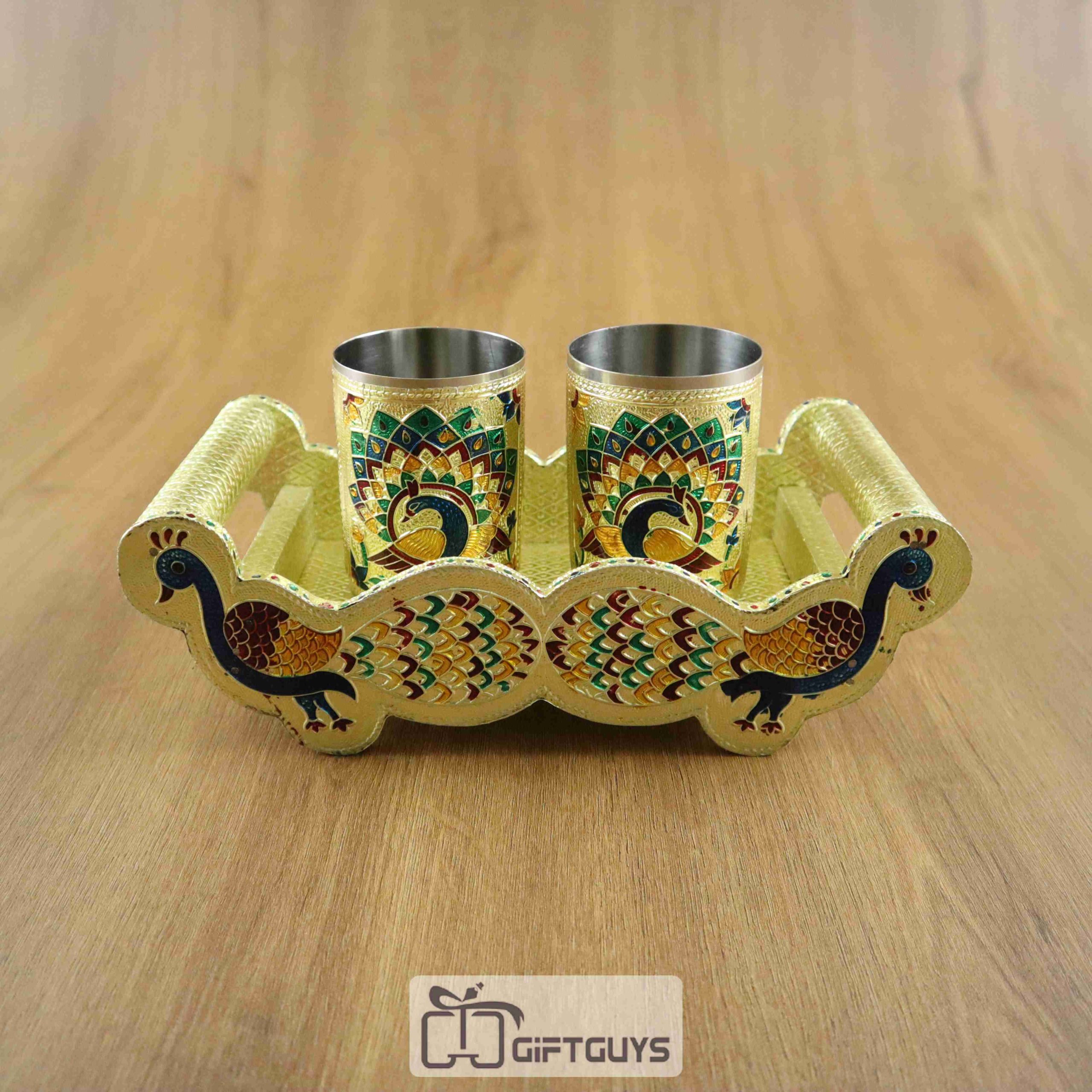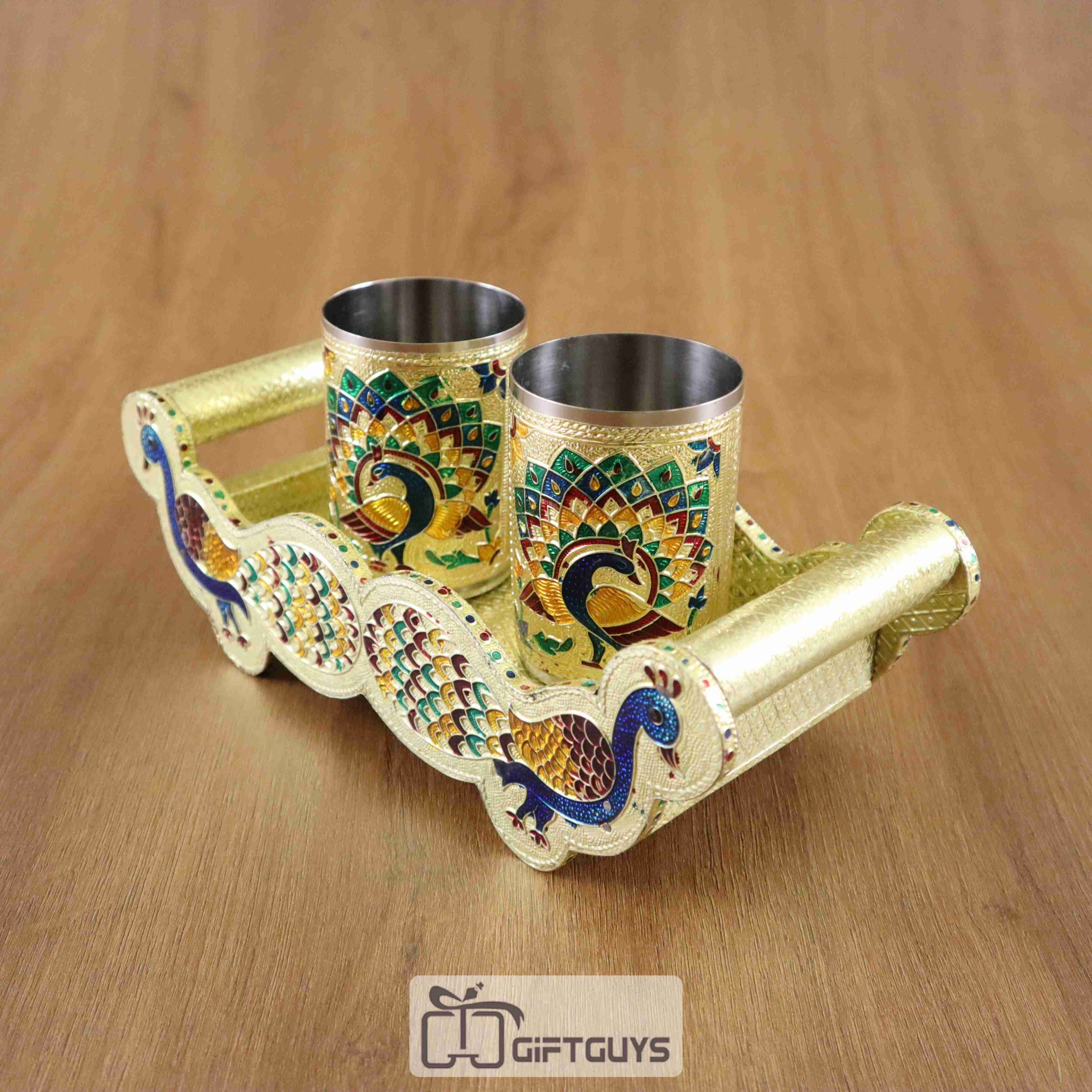 Meenakari Peacock Design Tray With 2 Glass