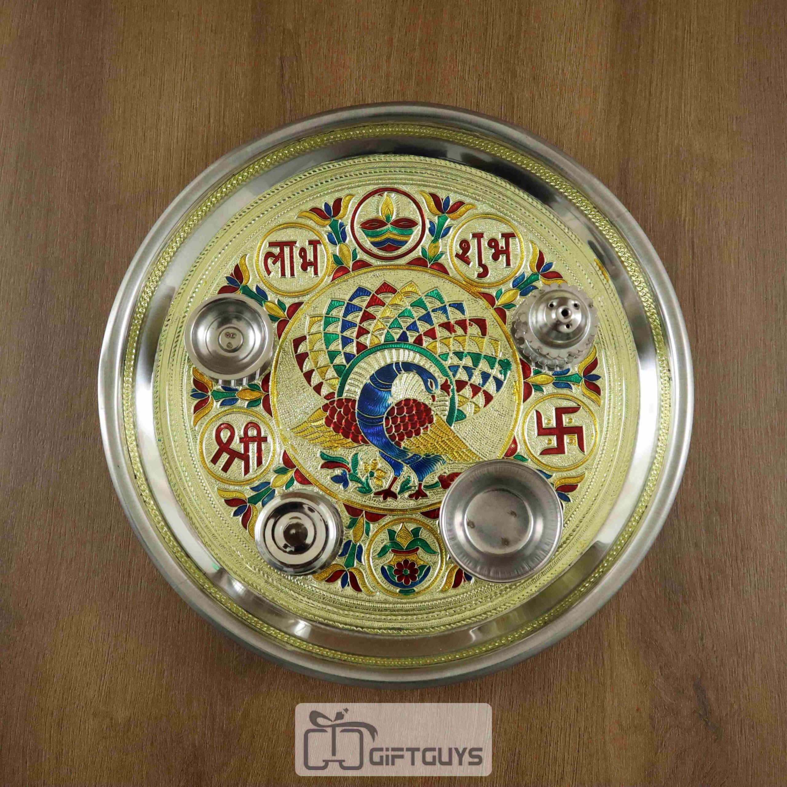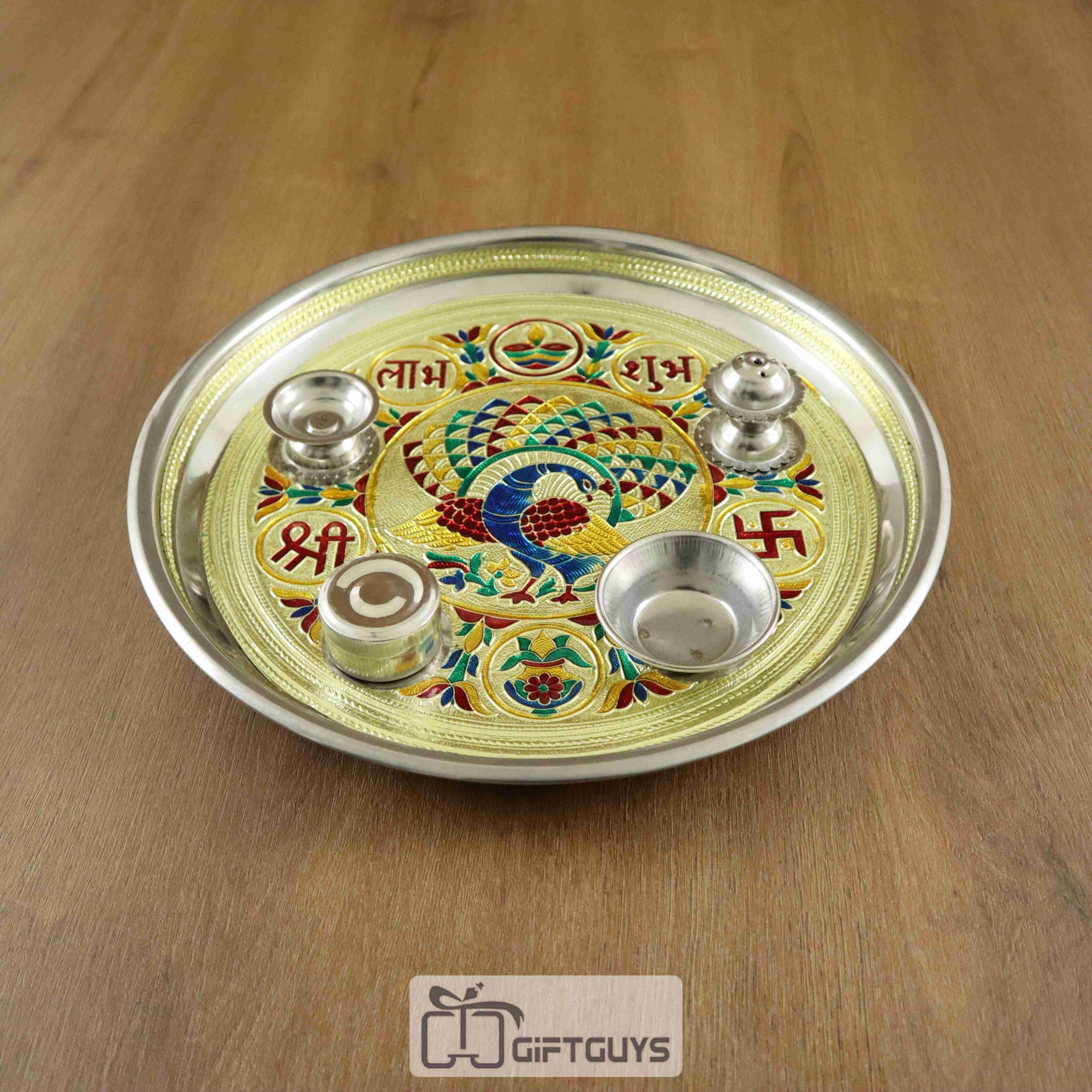 Golden Meenakari Steel Pooja Thali – Peacock Design with 4 Accessories