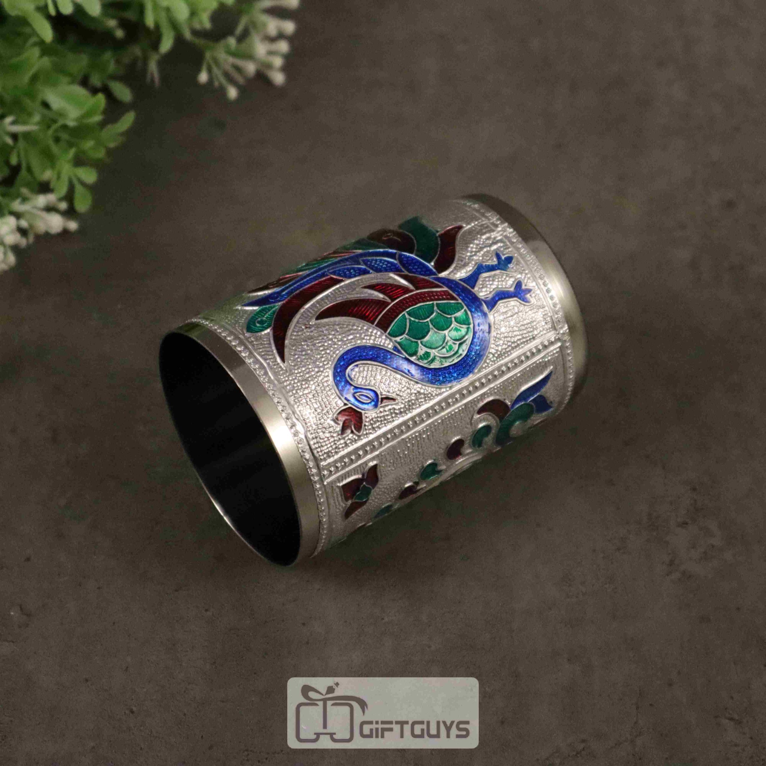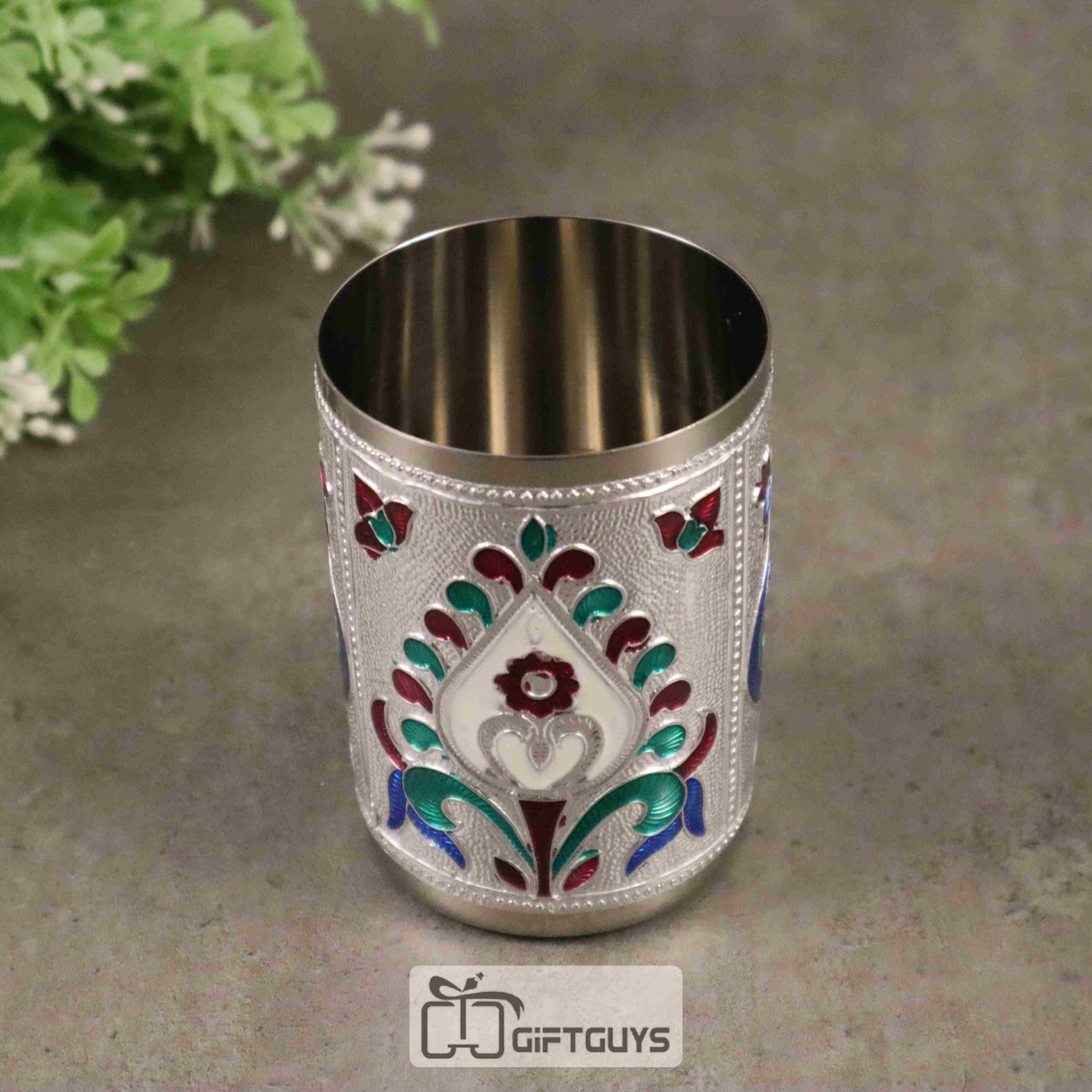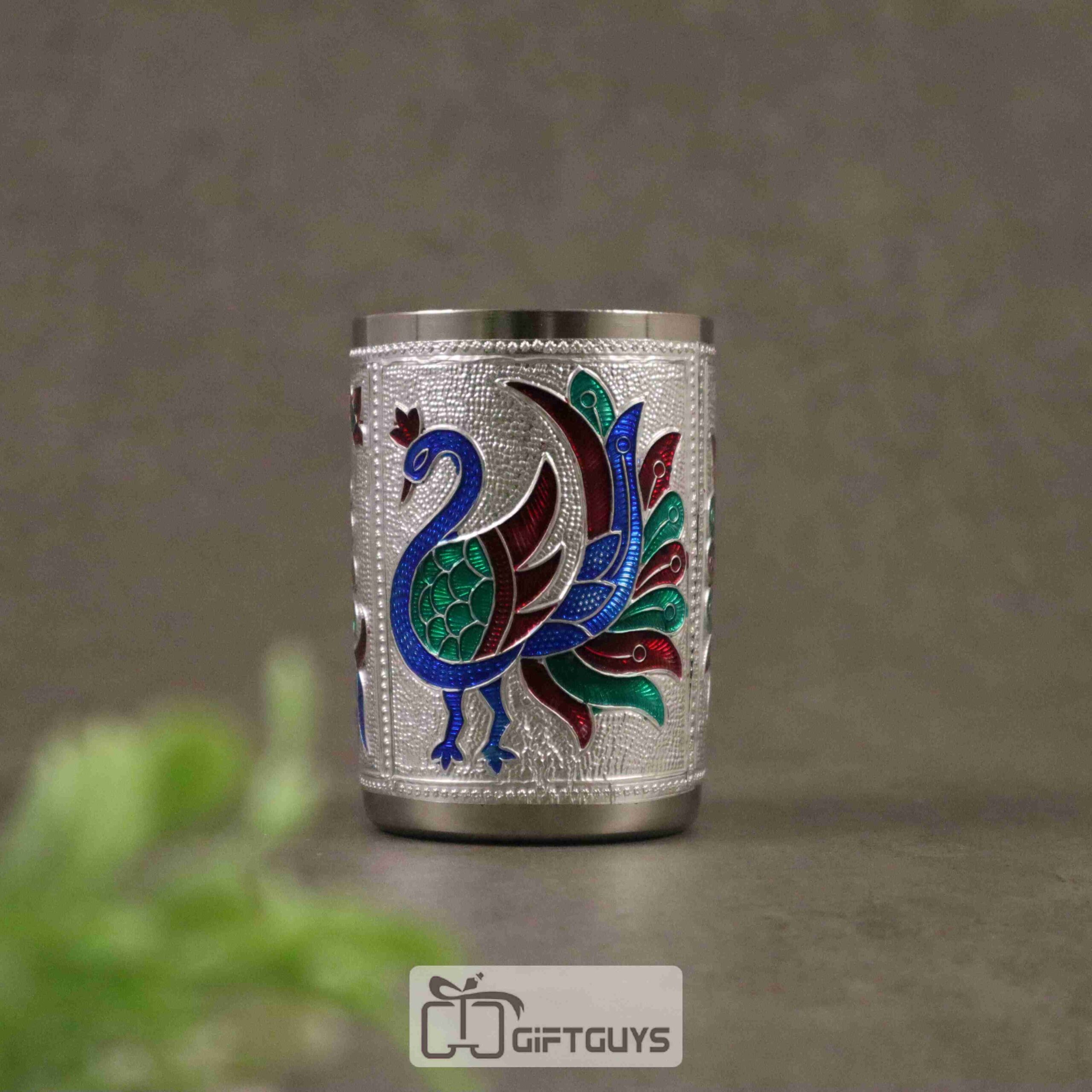 Beautifully handcrafted Meenakari stainless steel with vibrant peacock and floral designs. holds 250 ml and measures 2.5″ diameter × 3.5″ height. Perfect for serving water, juice, or lassi. Ideal for festive gifting and everyday use. Durable, rust-free, and easy to clean.