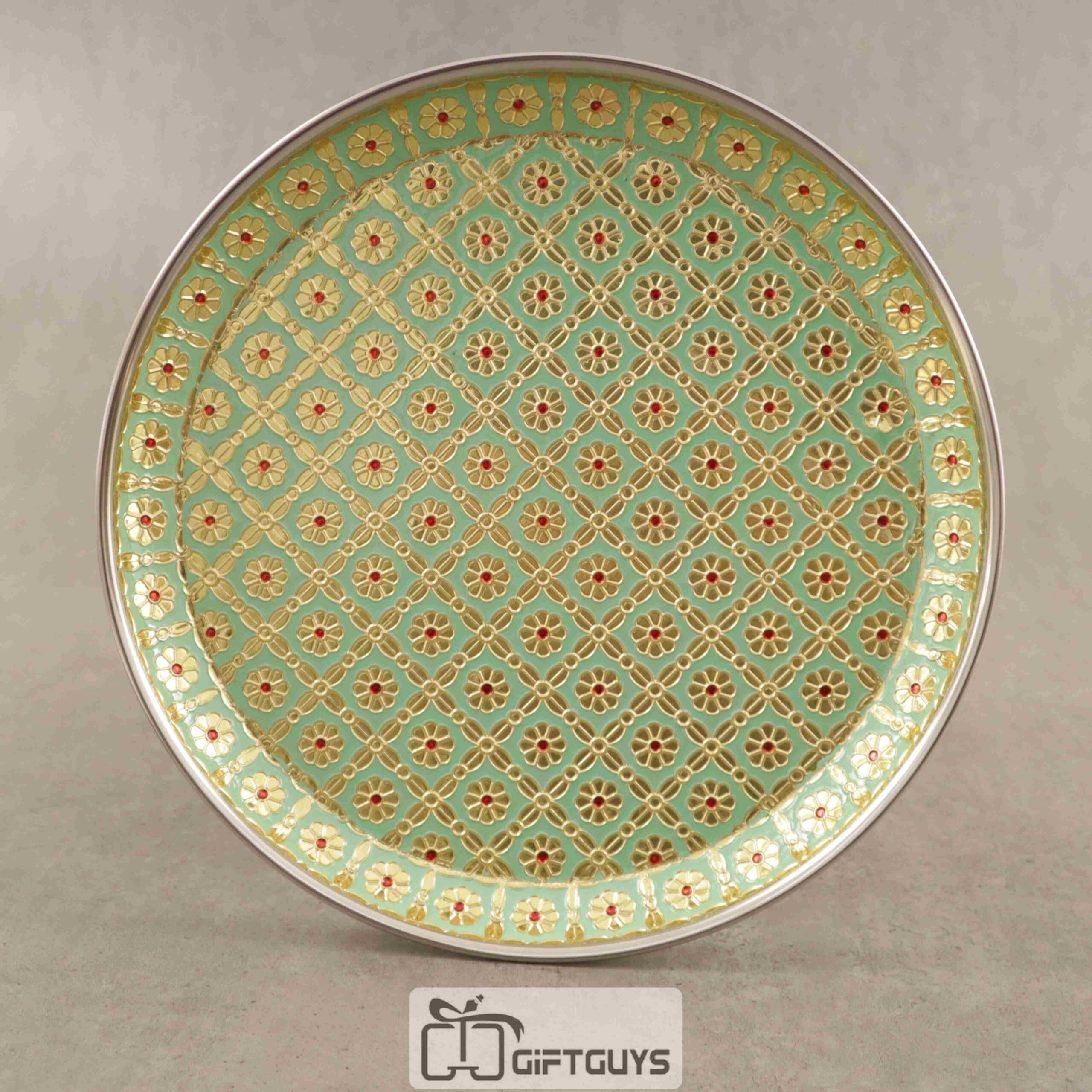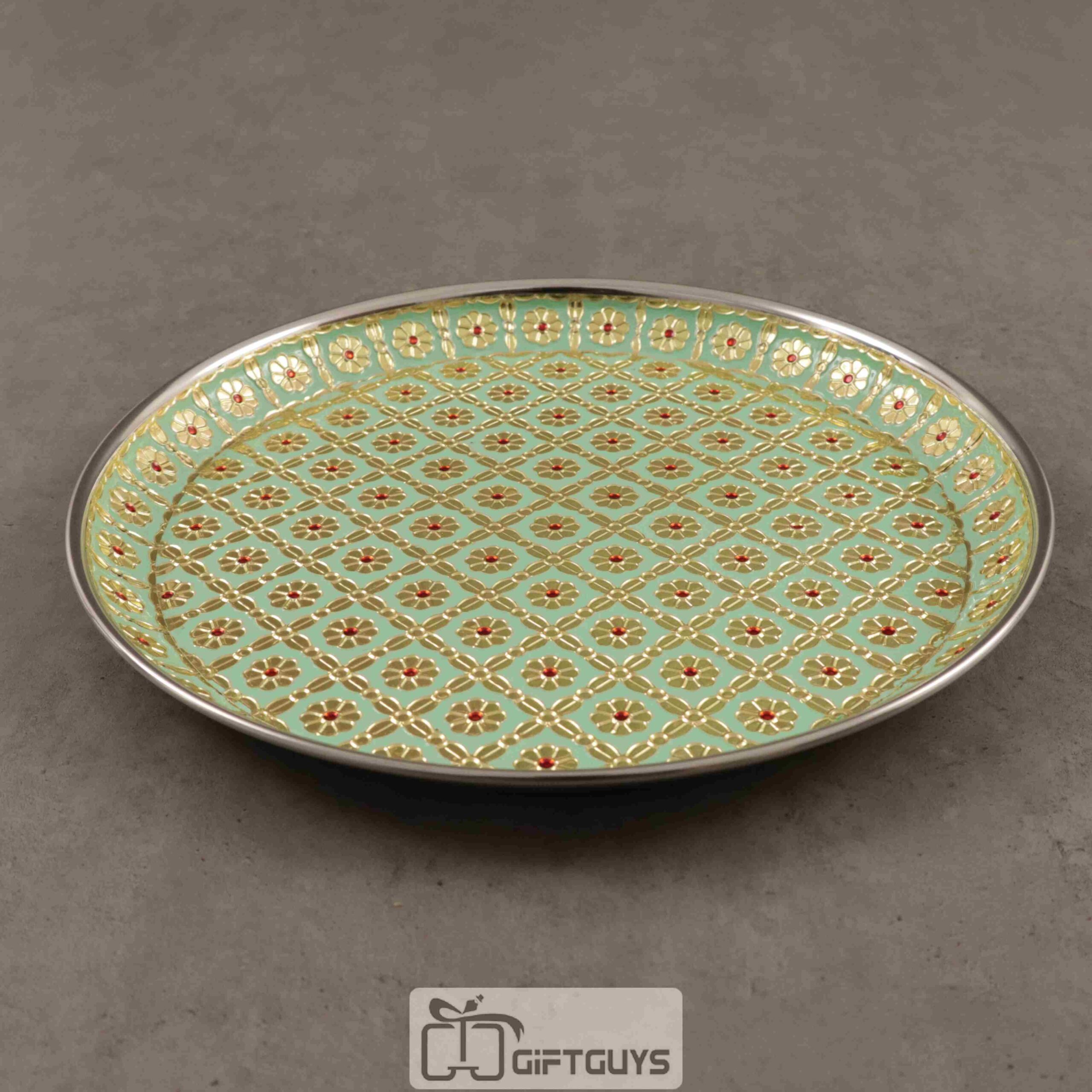 A Meenakari plate in light green color with an 11-inch diameter would bring a refreshing and elegant touch to your dining experience.