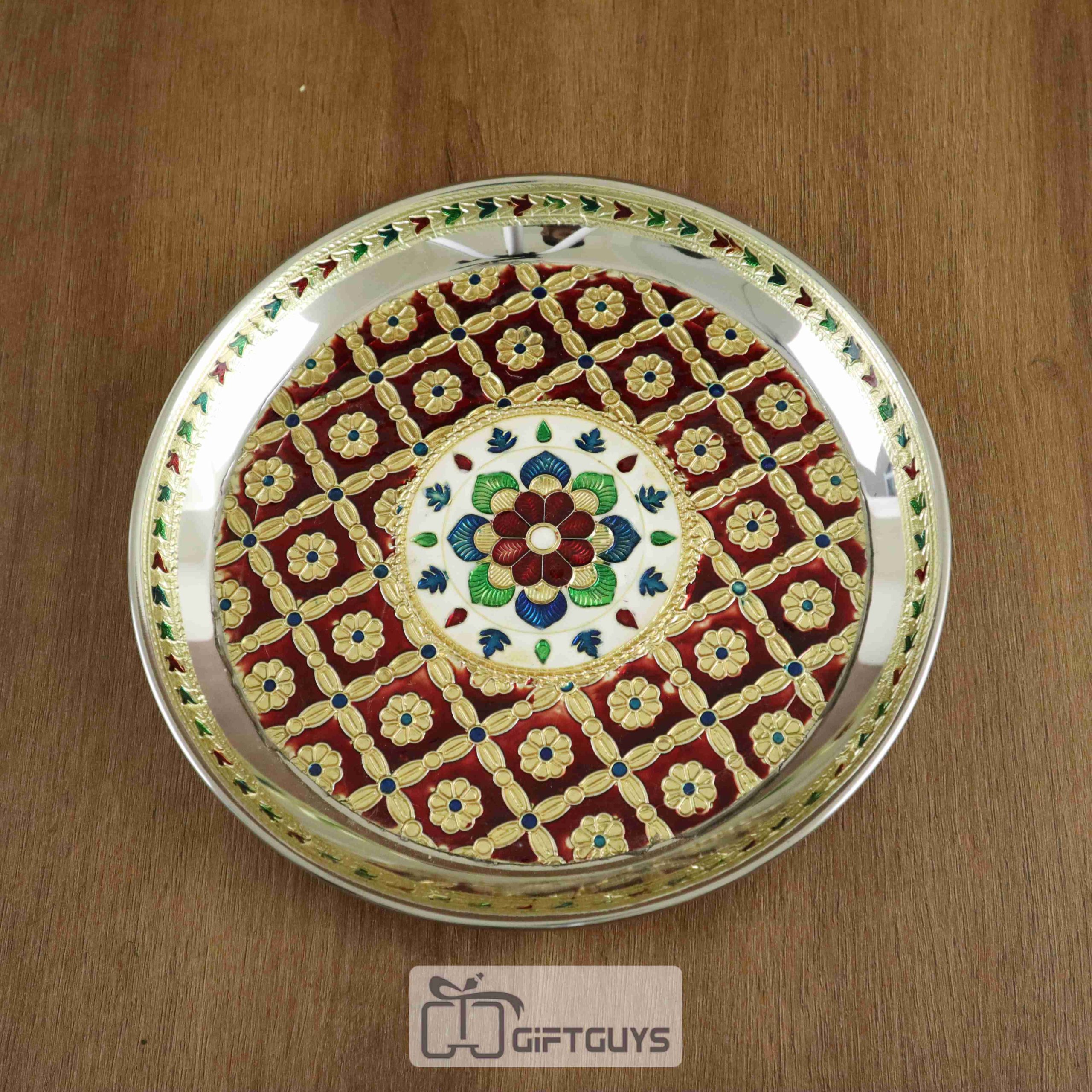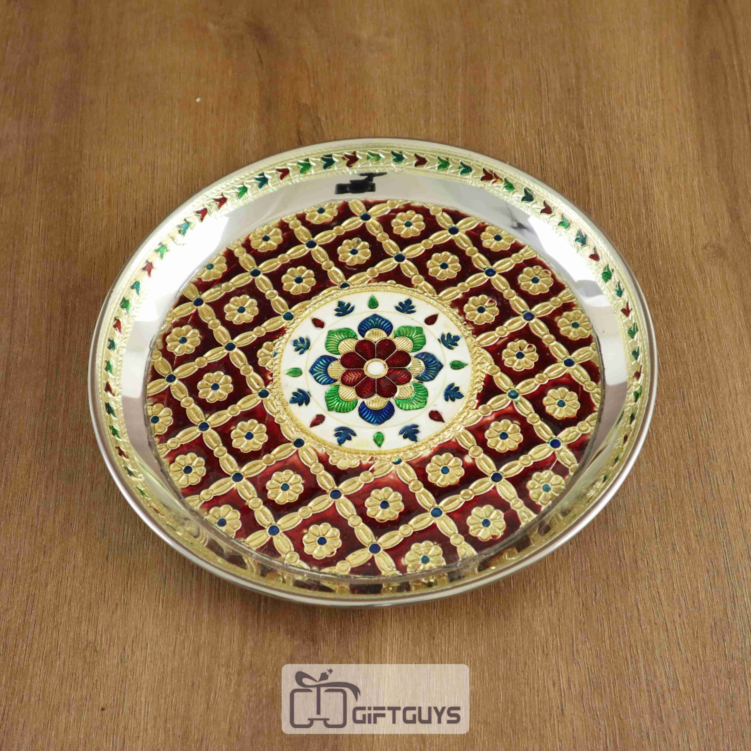 Meenakari Steel Pooja Thali – 8.25 Inch Round Plate with Handcrafted Floral Design