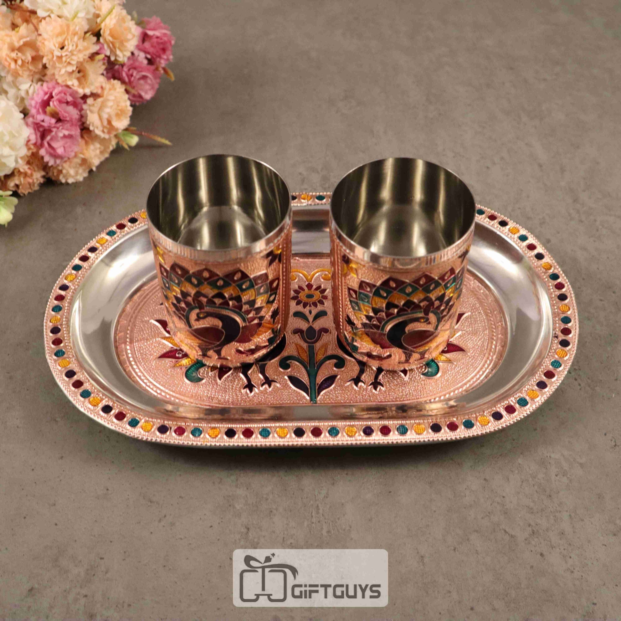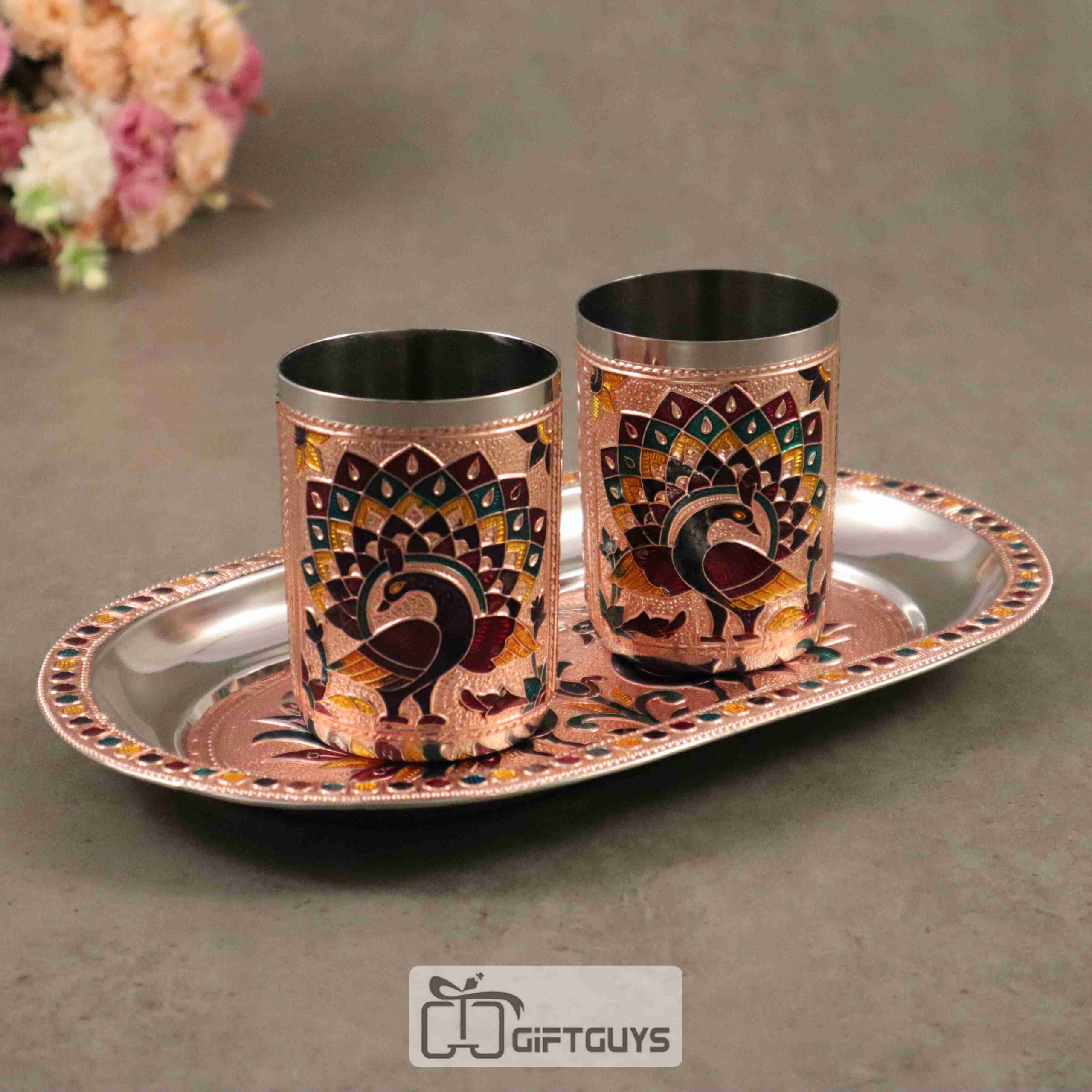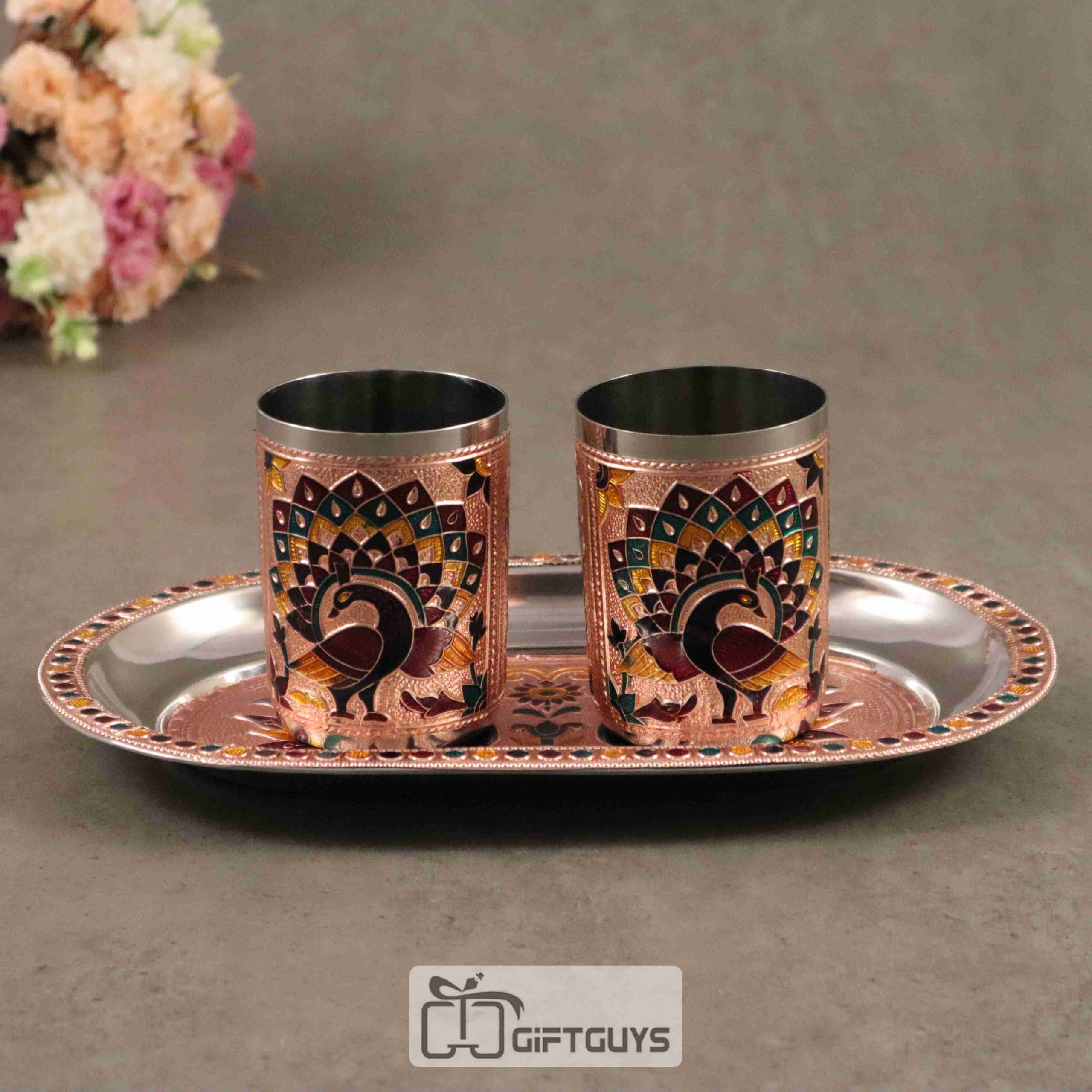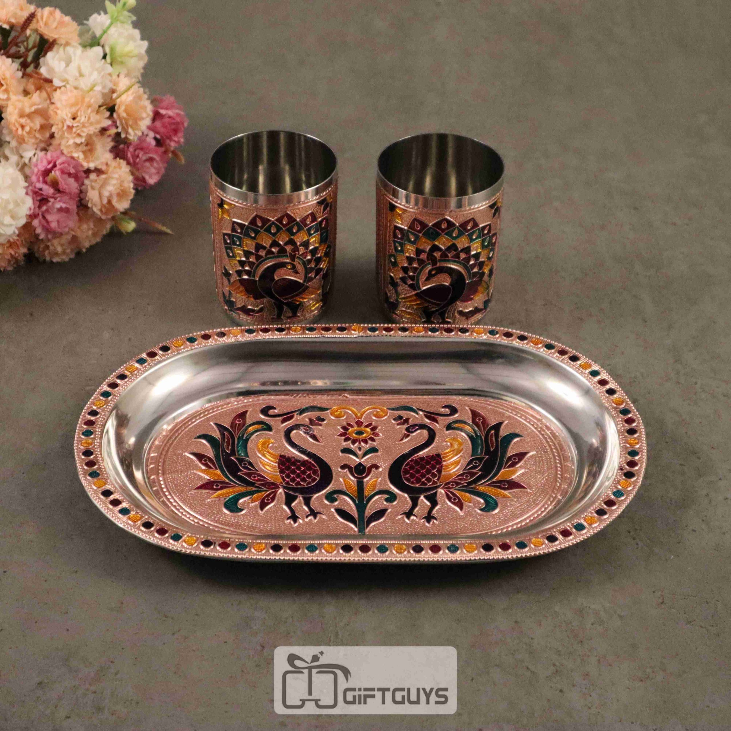 Handcrafted Meenakari Tray Set with 2 Glasses – 10.5 x 6.5 Inch, 250ml Drinkware Gift Set