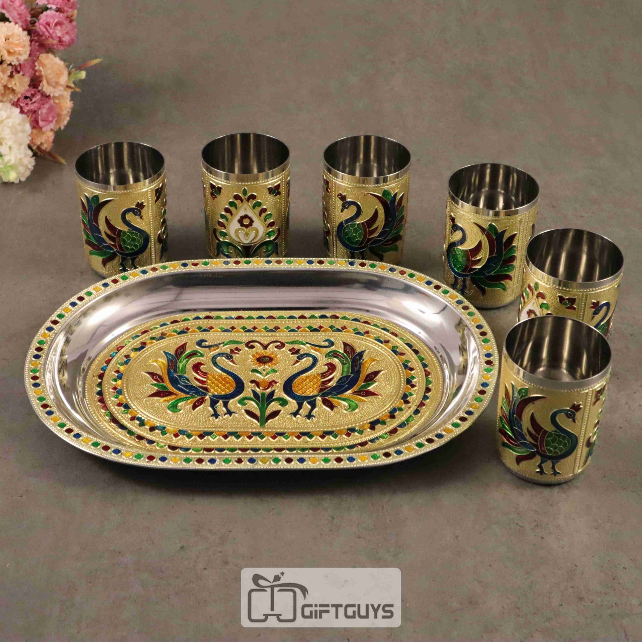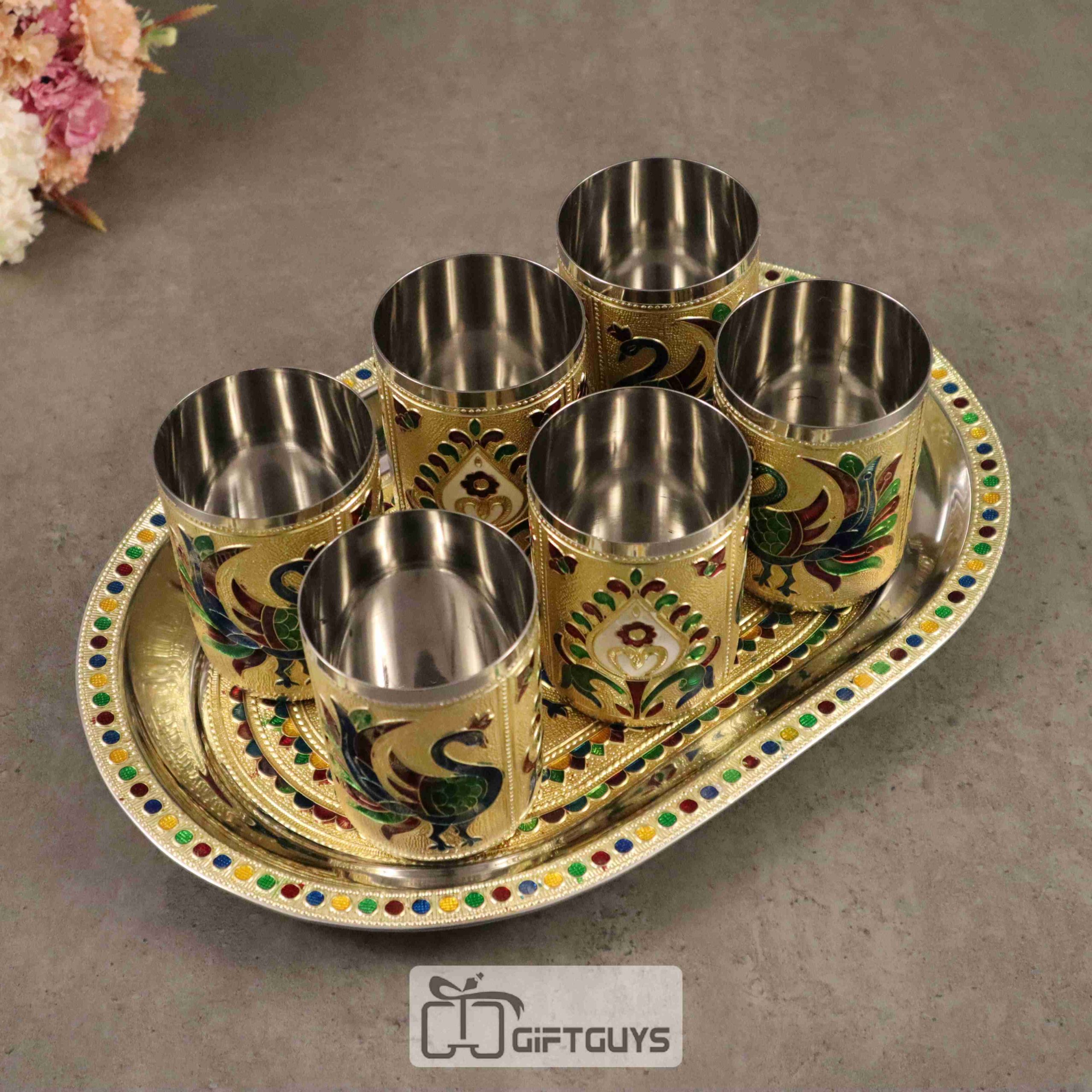 Handcrafted Meenakari Tray Set with 6 Glasses – 12 x 8.5 Inch, 250ml Drinkware Gift Set