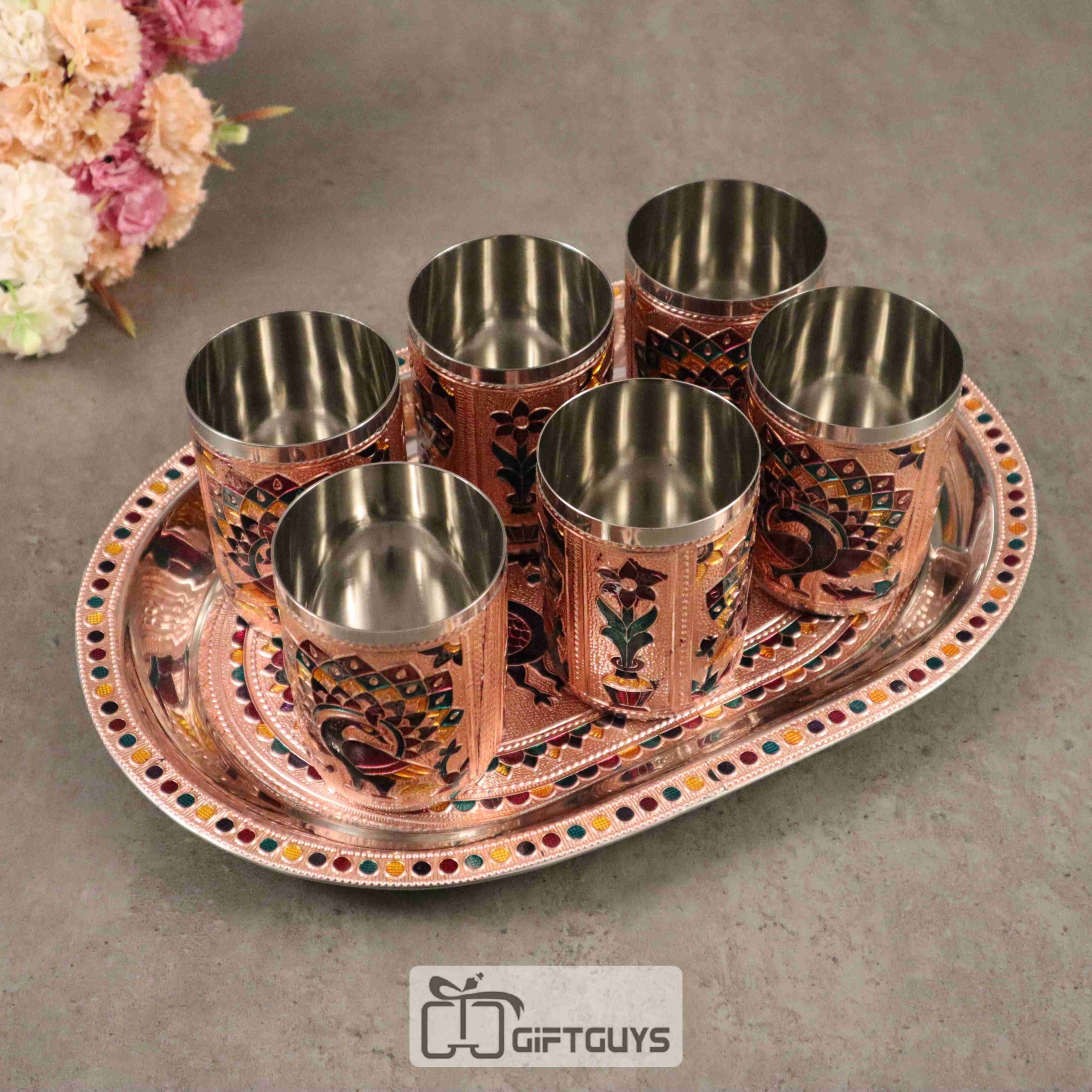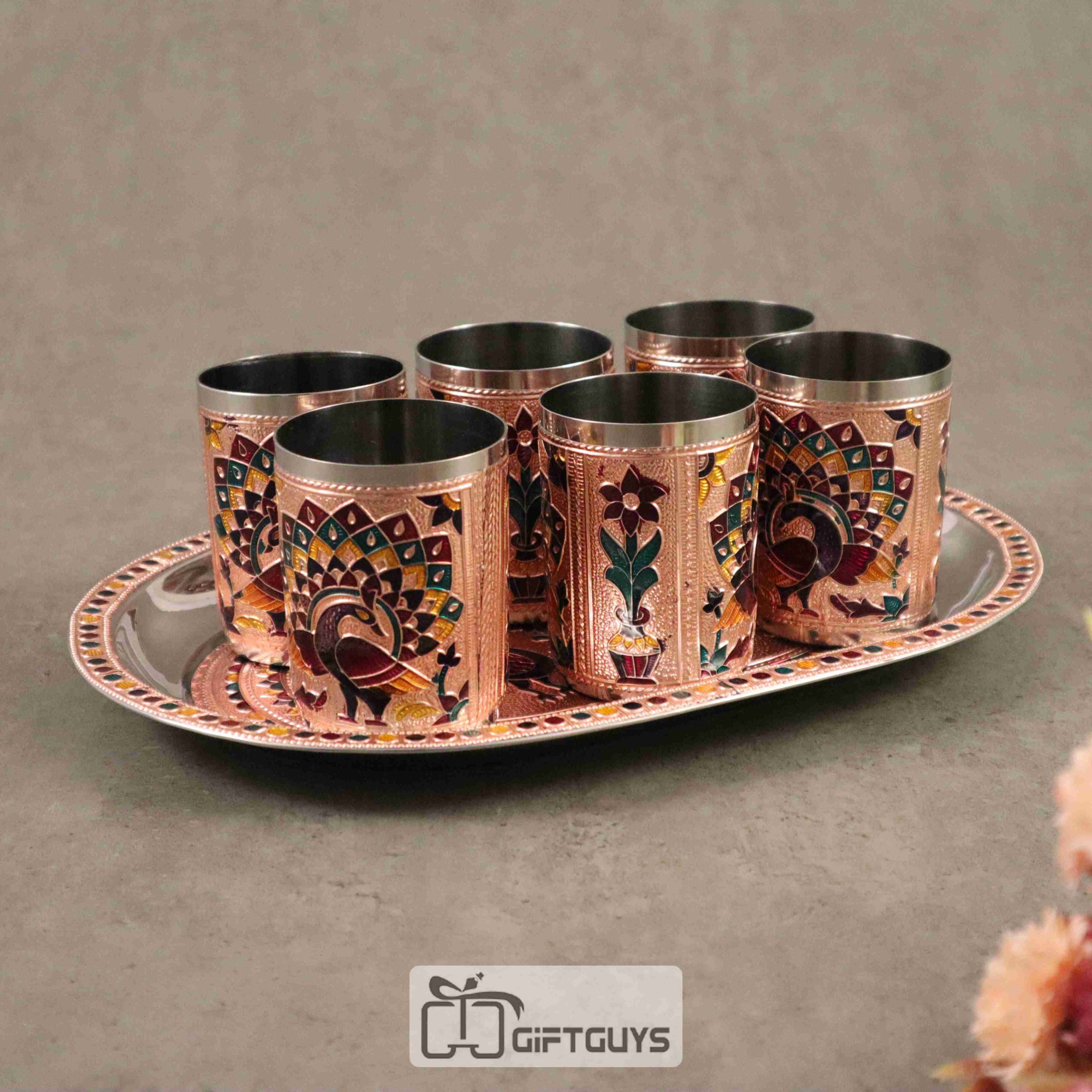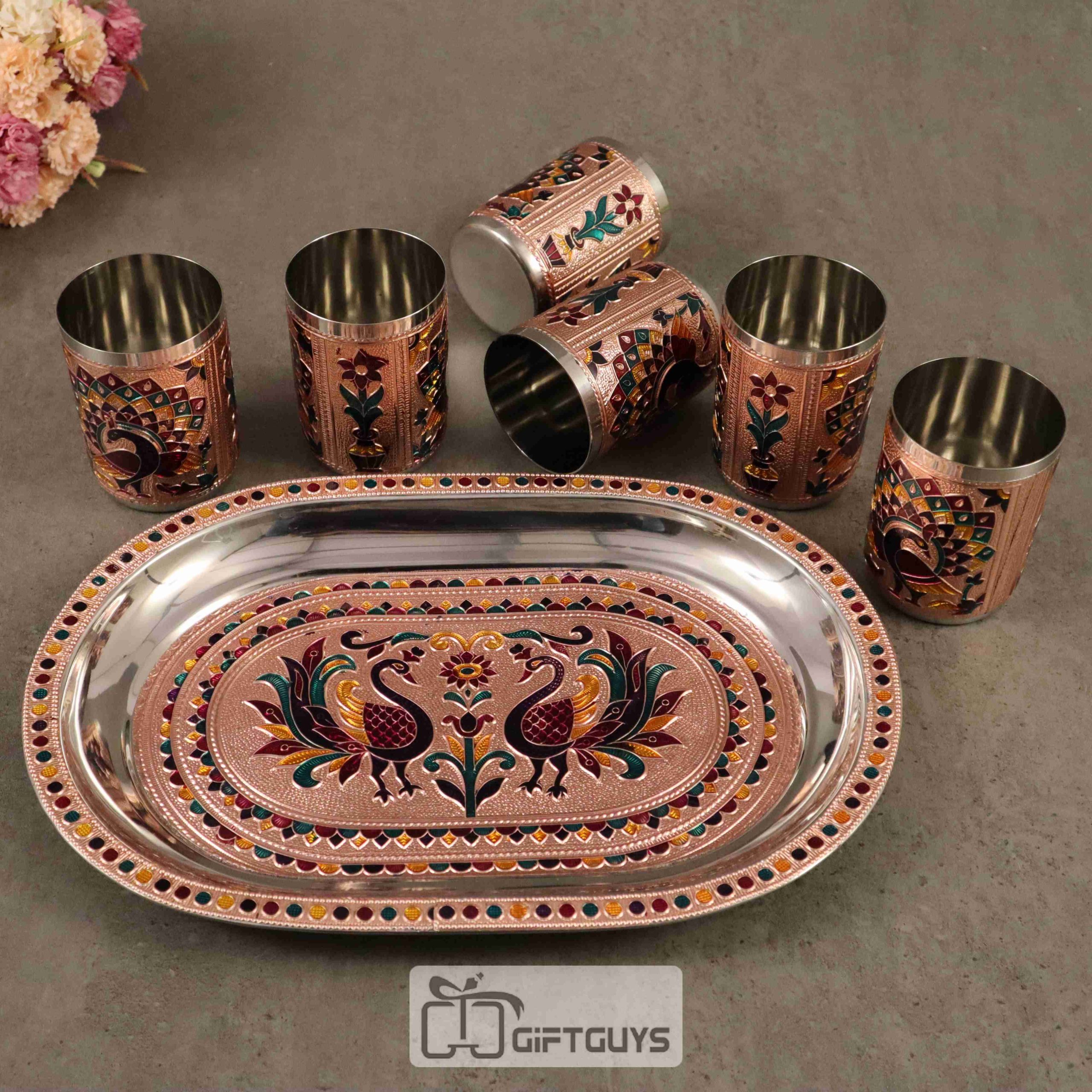 Handcrafted Meenakari Tray Set with 6 Glasses – 12 x 8.5 Inch, 250ml Drinkware Gift Set