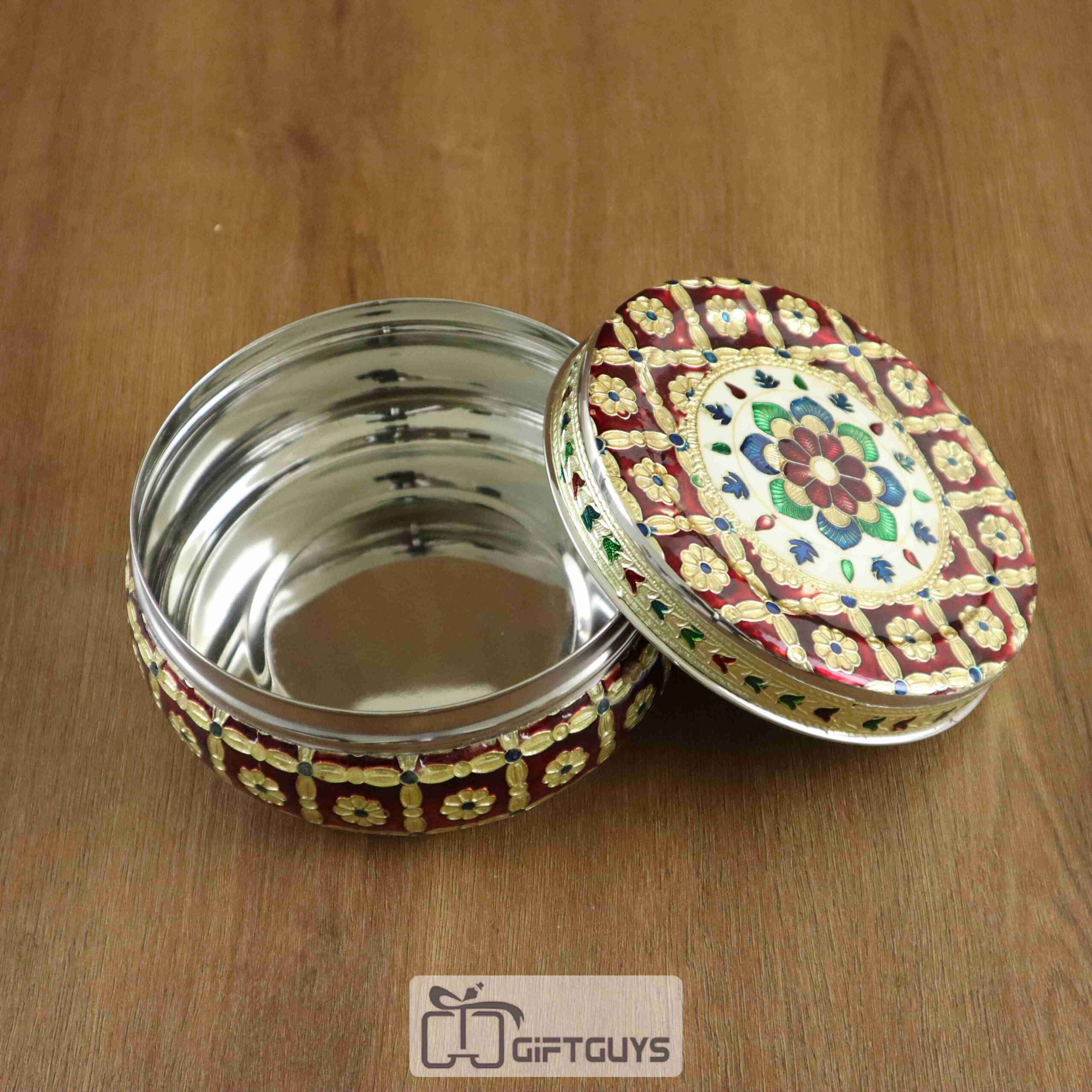 A majestic blend of artistry and steel – this 5-inch handcrafted Meenakari box brings together timeless tradition and luxurious elegance. Ideal for gifting or elegant storage.