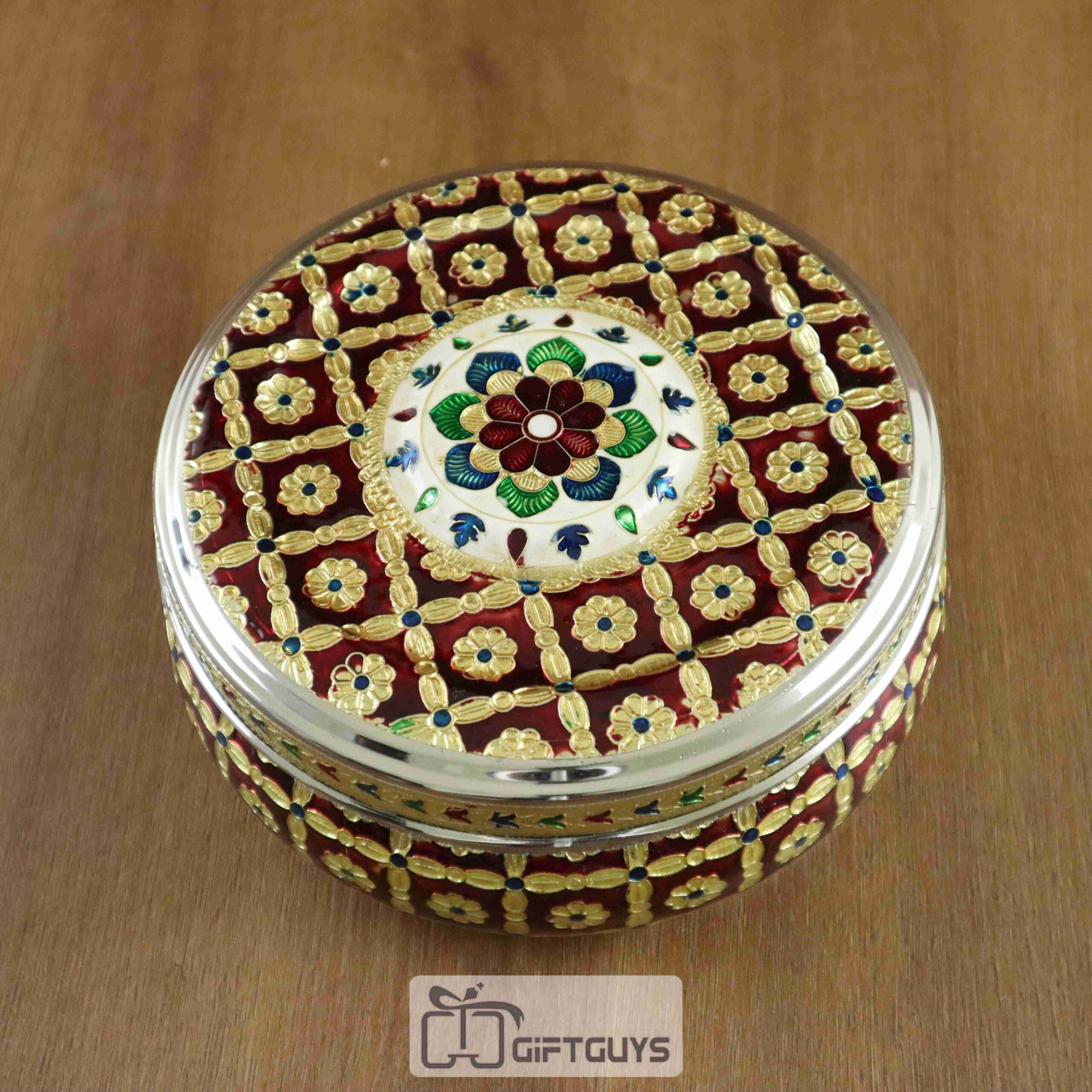 A majestic blend of artistry and steel – this 6.5-inch handcrafted Meenakari box brings together timeless tradition and luxurious elegance. Ideal for gifting or elegant storage.