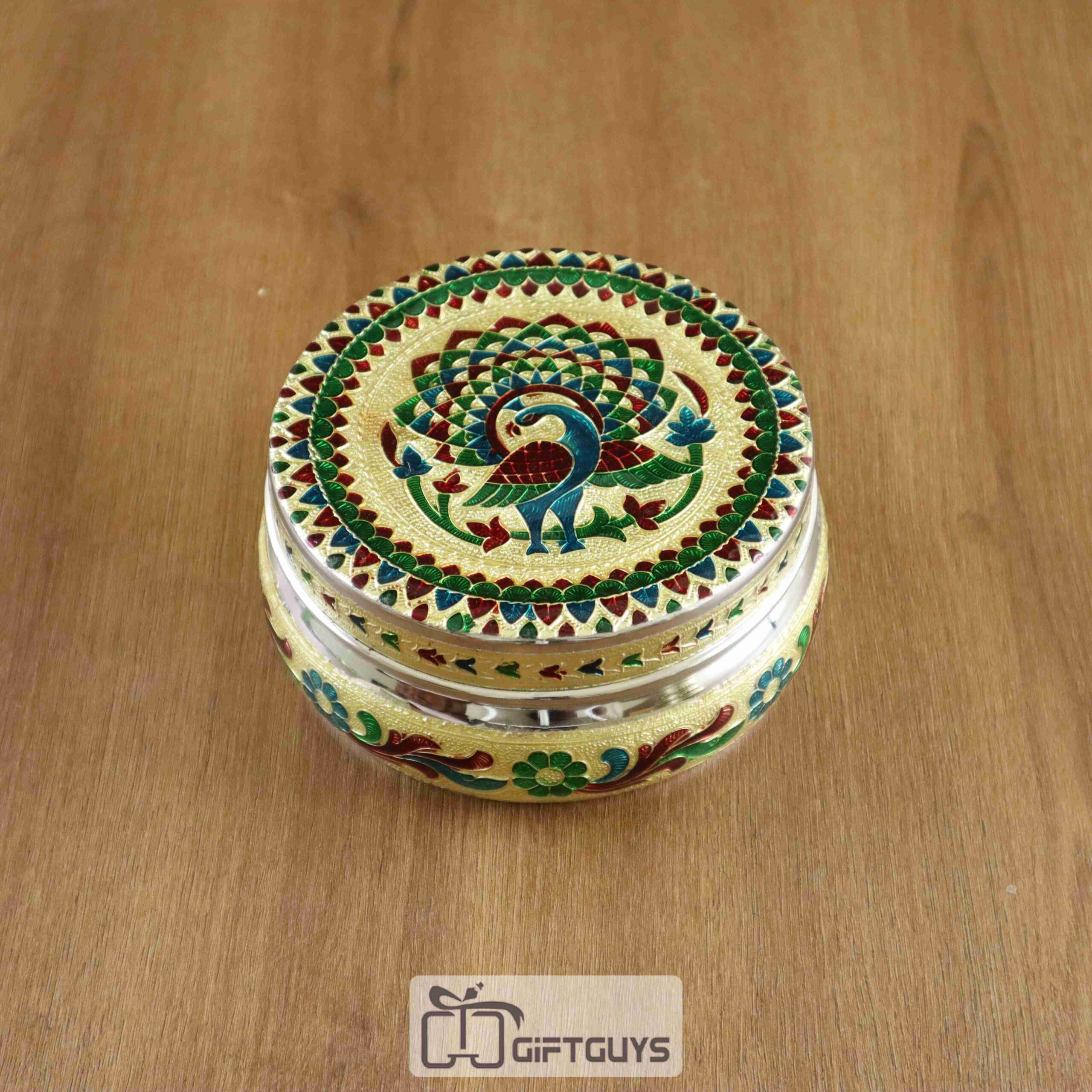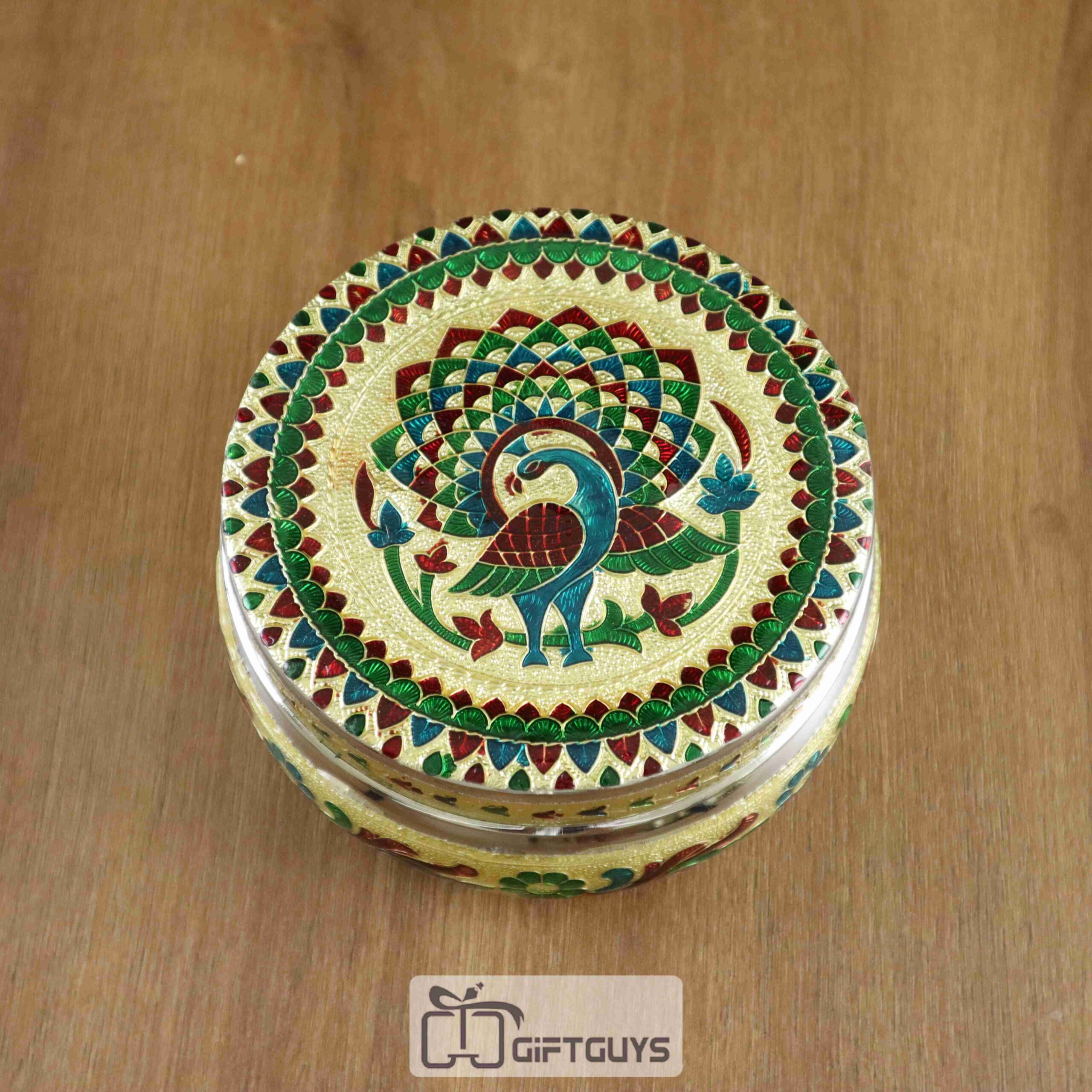 Peacock Design Meenakari Steel Box – 5 Inch Decorative Storage Container for Gifts & Home Use