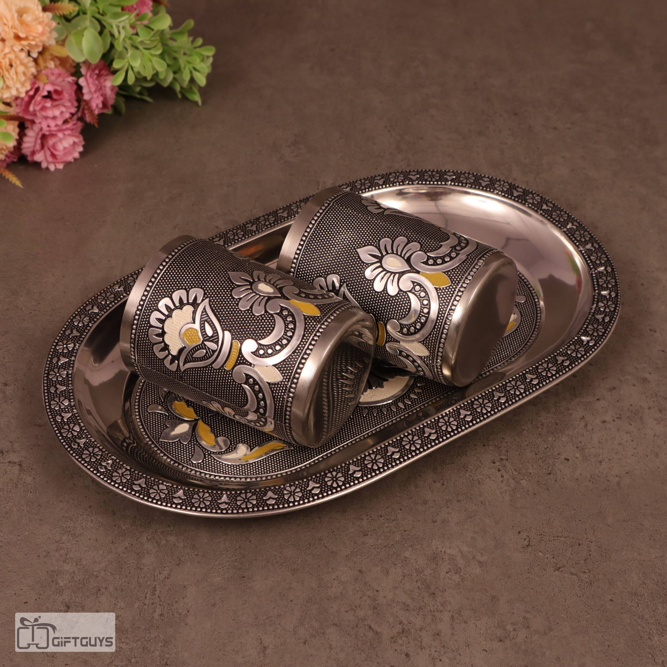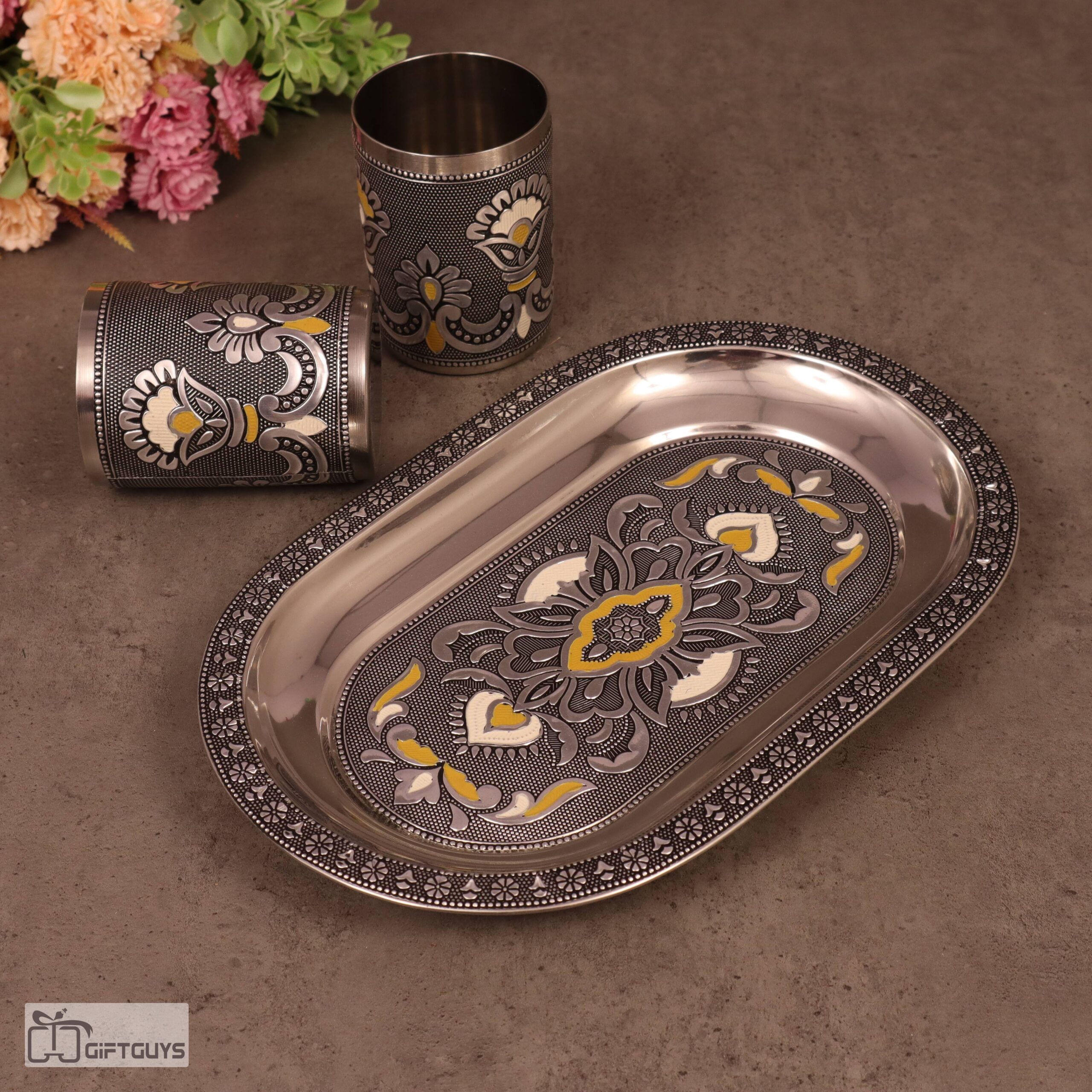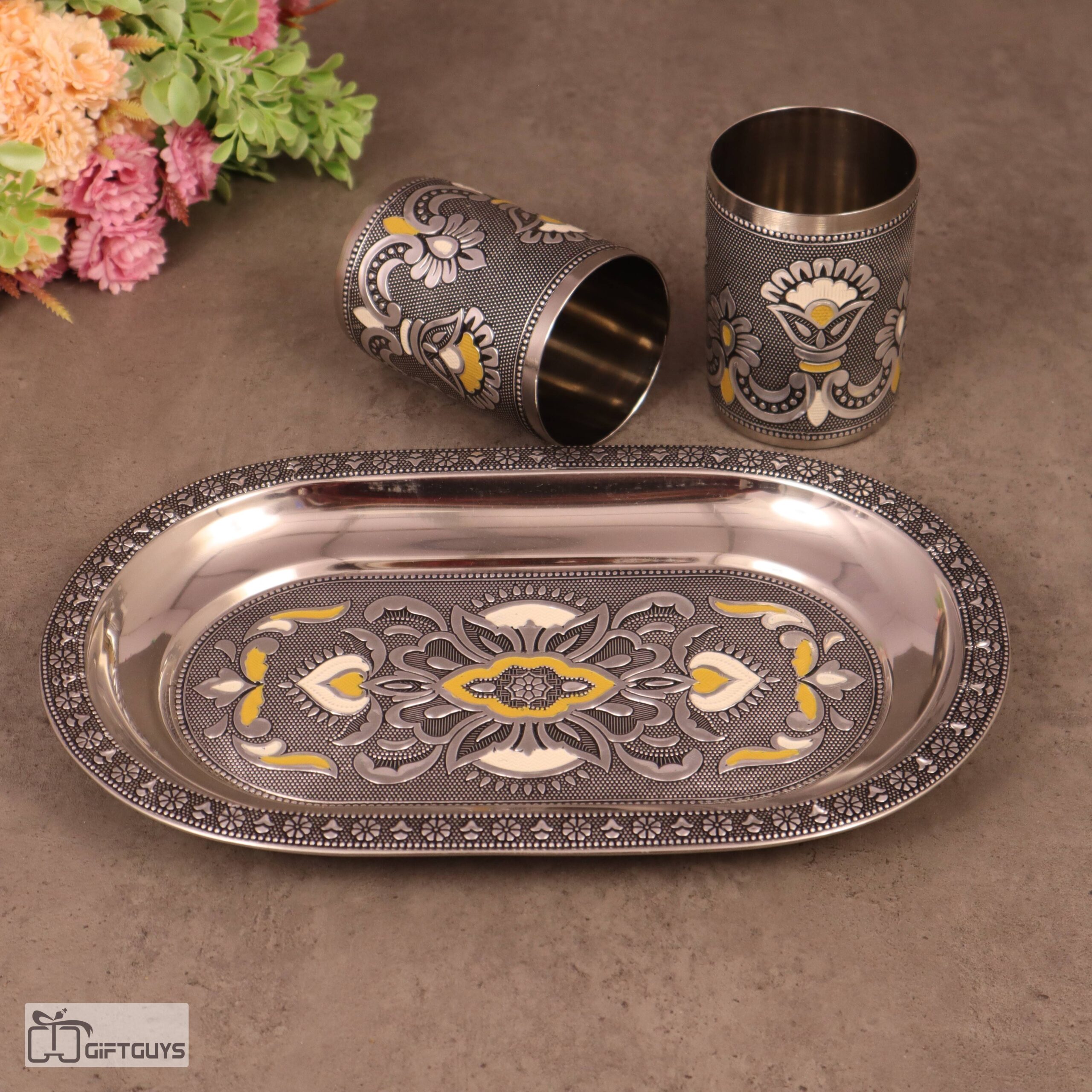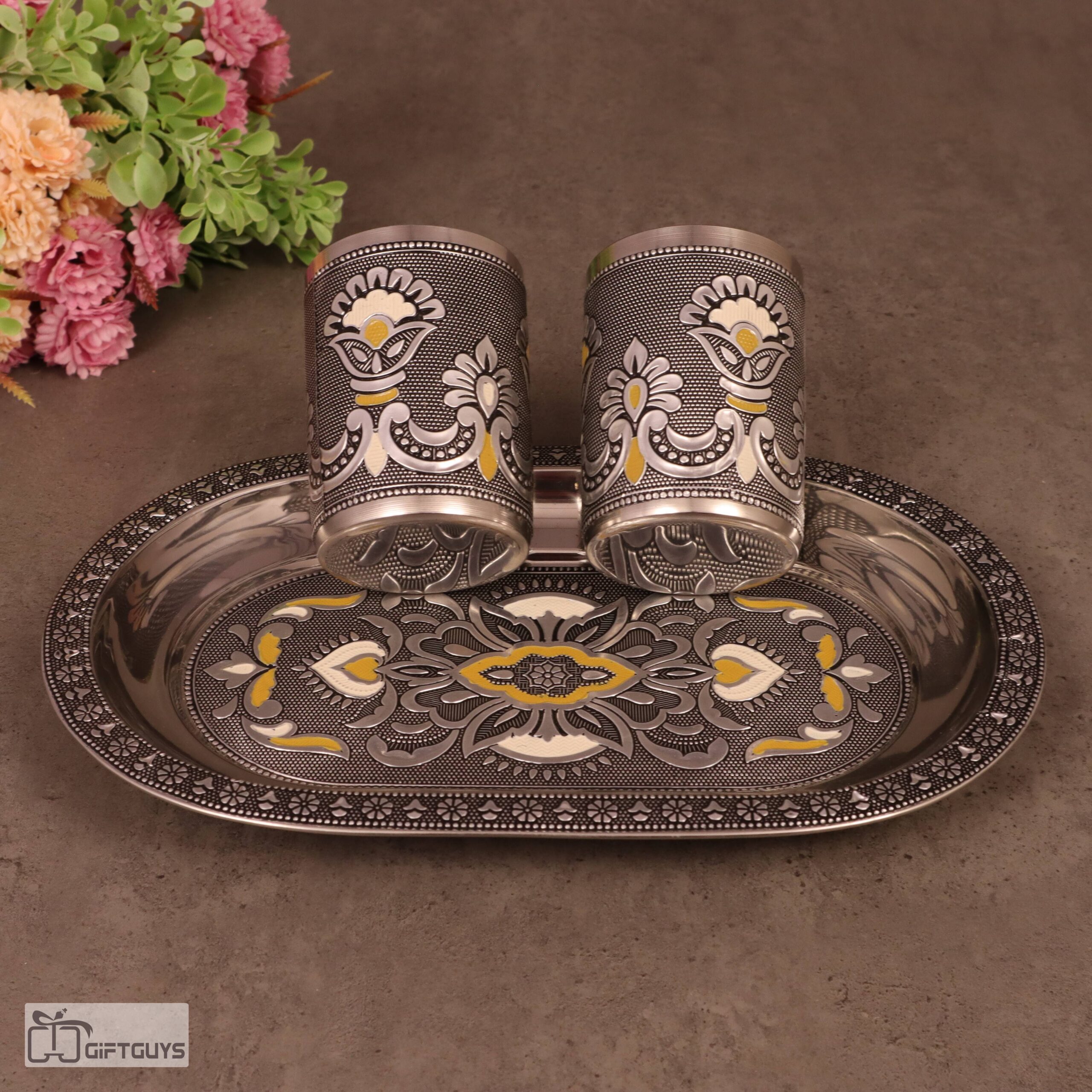 Meenakari Steel Tray Set with 2 Matching Glasses – 250ml | Traditional Serving Set – 10.5 X 6.5 Inch Tray