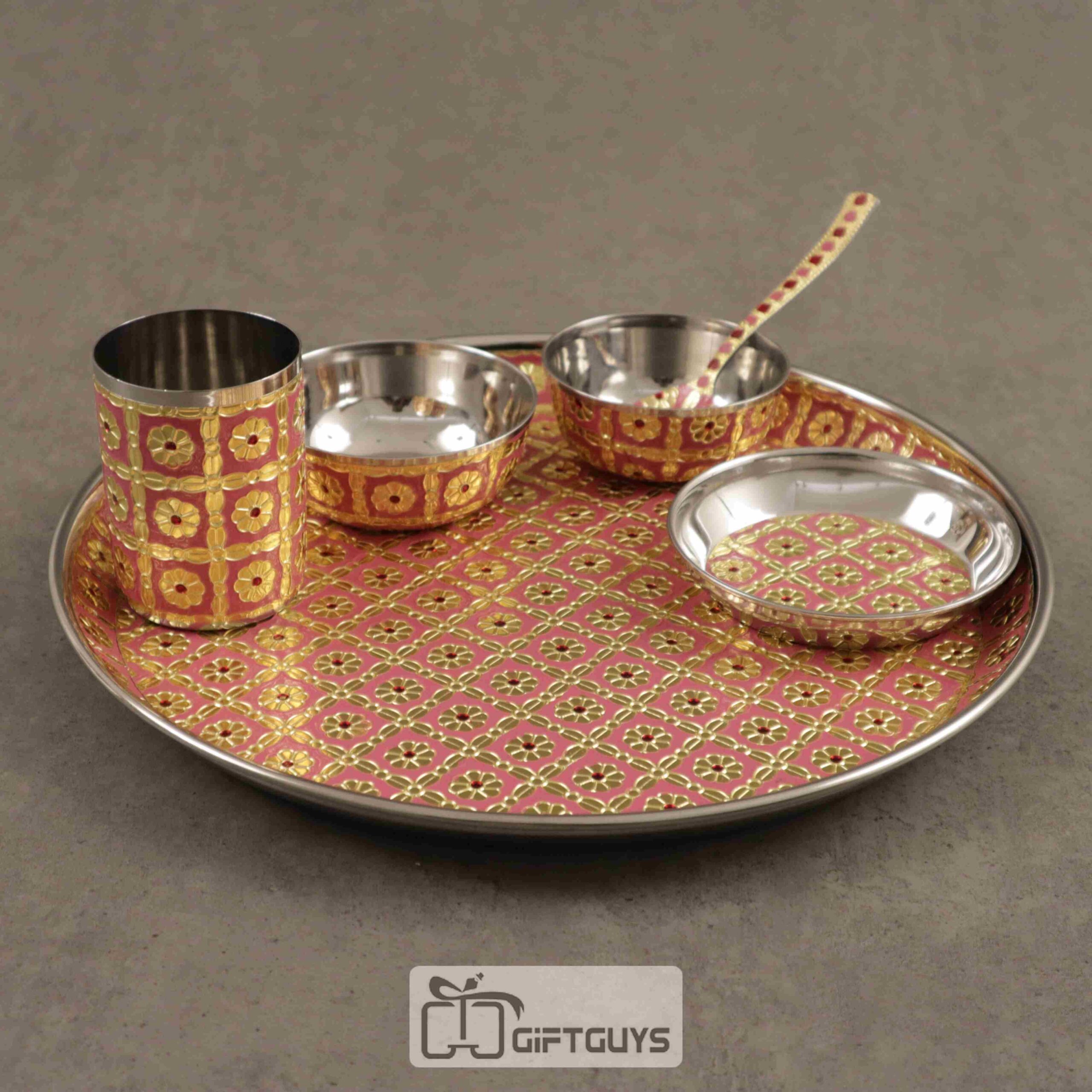 Meenakari art involves the intricate application of colorful enamel onto metal surfaces, resulting in vibrant and detailed designs. The light red color adds a bold and elegant touch to the Thali set, creating a striking visual contrast against the metal surface.