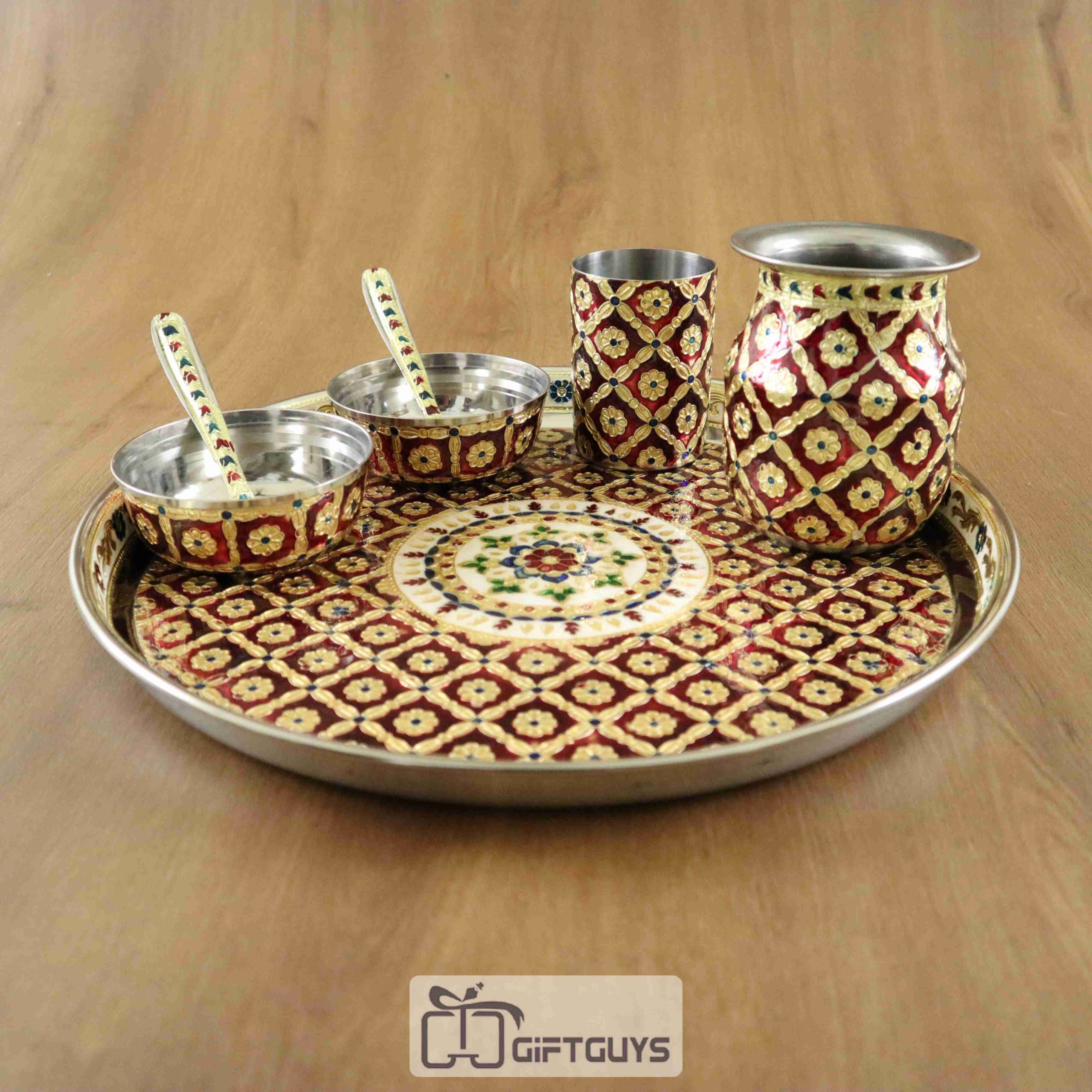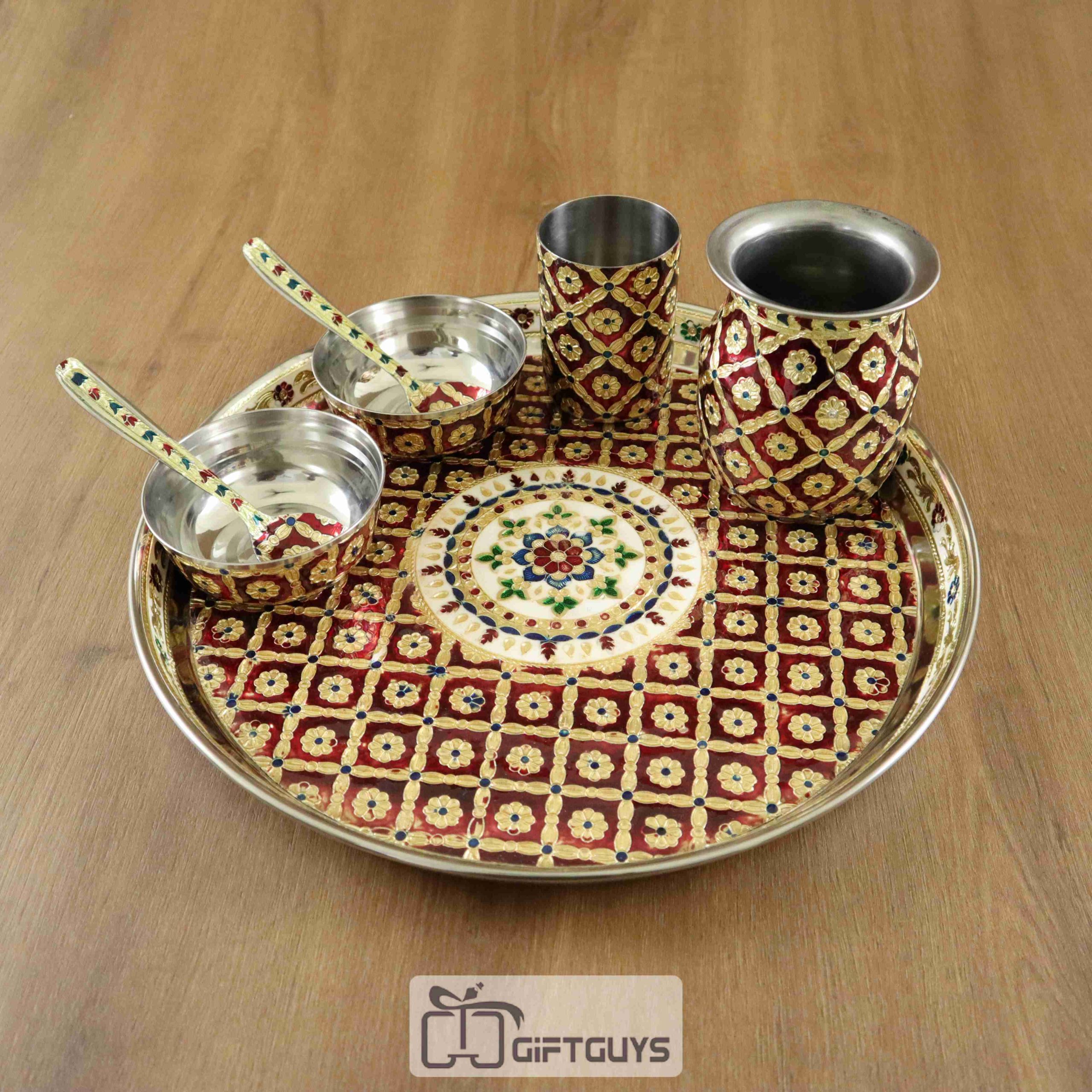 Traditional Meenakari Pooja Thali Set – Handcrafted Steel Plate with Bowls, Glass & Lota for Daily Worship