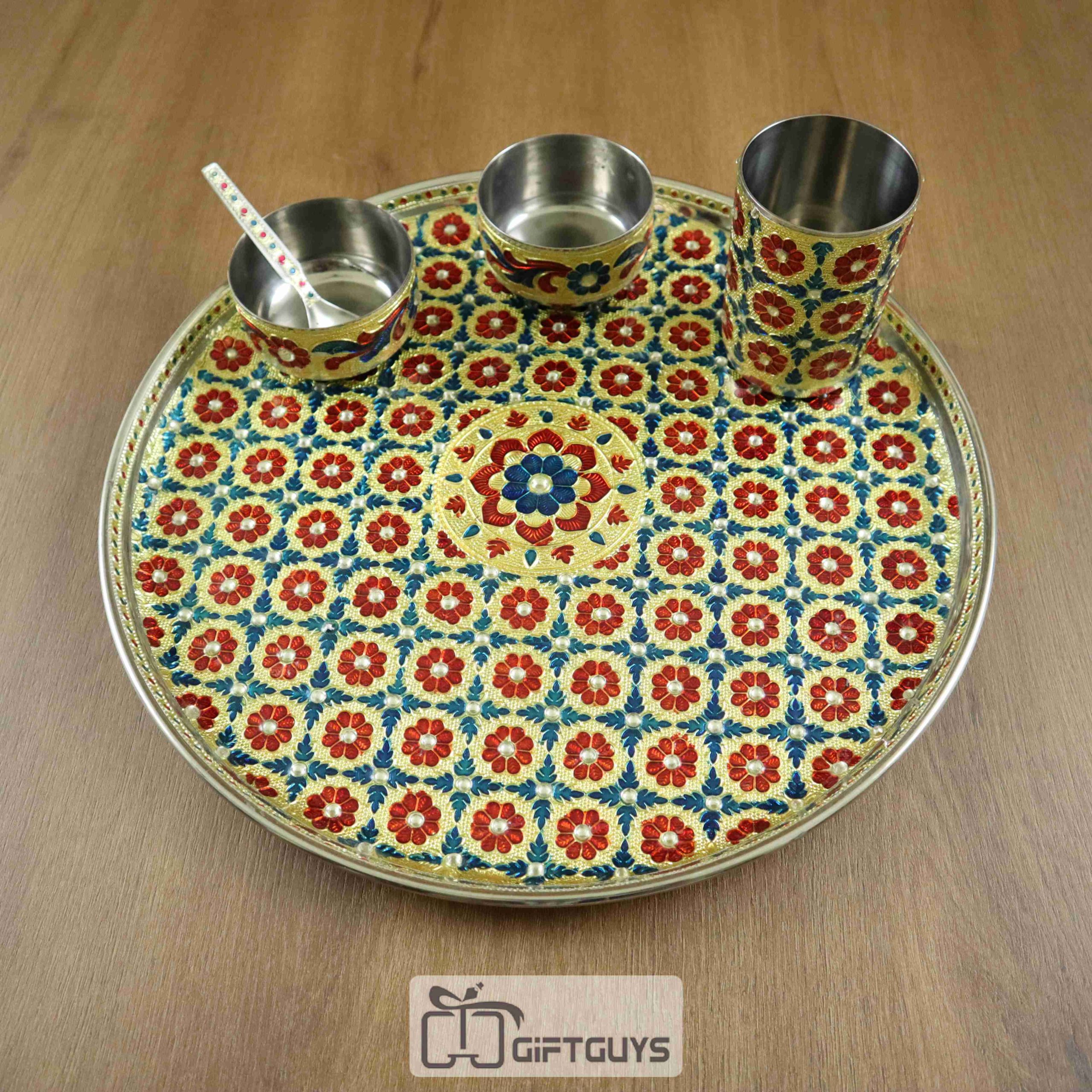 Traditional Meenakari Pooja Thali Set – Handcrafted Steel Plate with Bowls, Glass & Spoon for Daily Worship