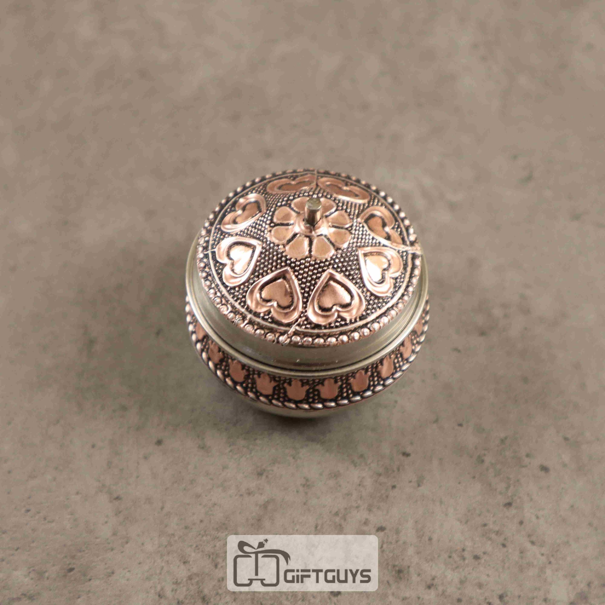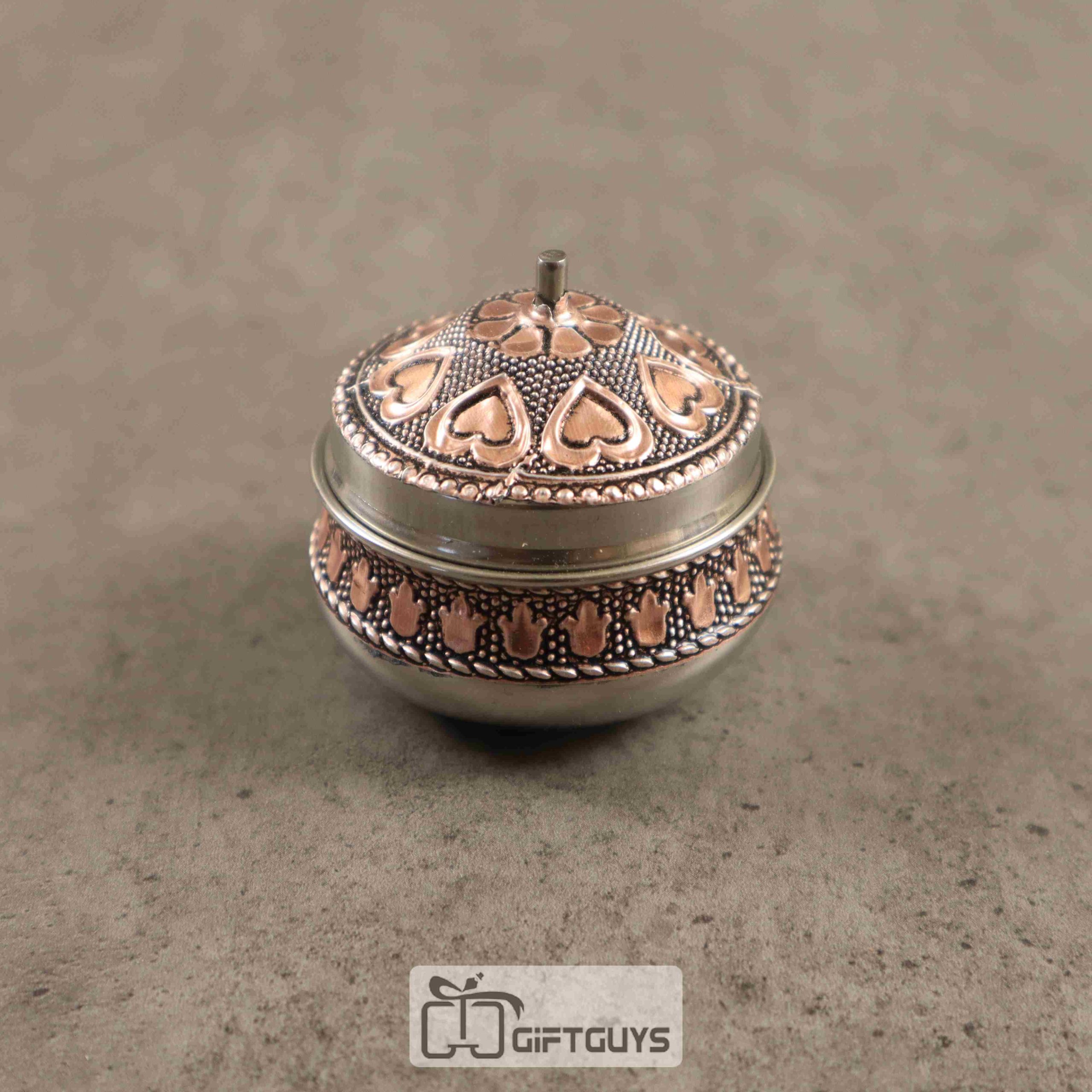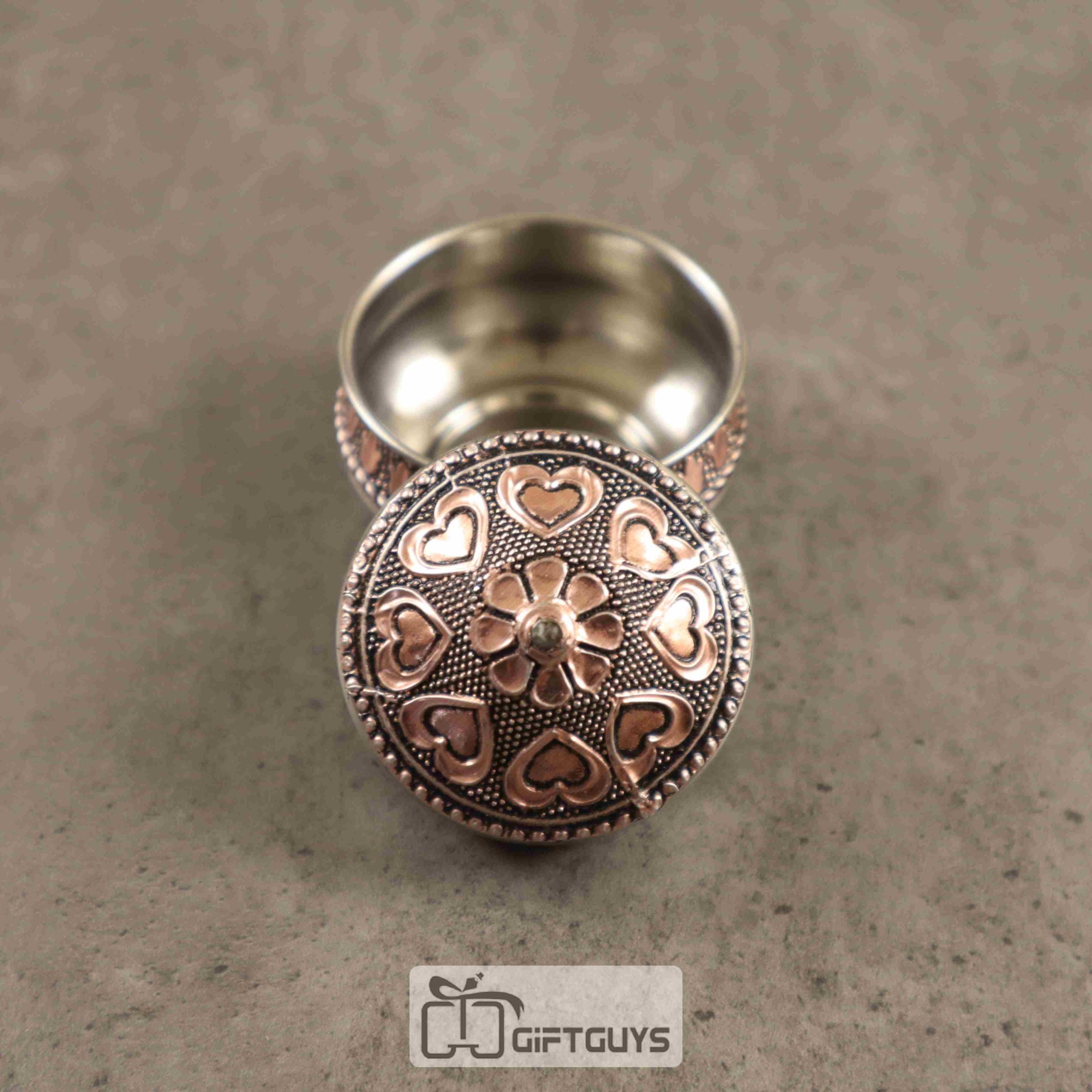 An oxidized kumkum holder is a traditional and decorative item used during religious rituals, particularly in Hindu ceremonies. Made from high-quality metal, often stainless steel or brass, the holder features an oxidized finish that gives it an antique, rustic look. This finish not only enhances its beauty but also provides durability, preventing rust and corrosion. The kumkum holder is designed to hold kumkum (a red powder) used in rituals like applying tilak or offering prayers. Compact and elegant, it adds a touch of spirituality and cultural charm to any prayer space, blending functionality with aesthetic appeal.