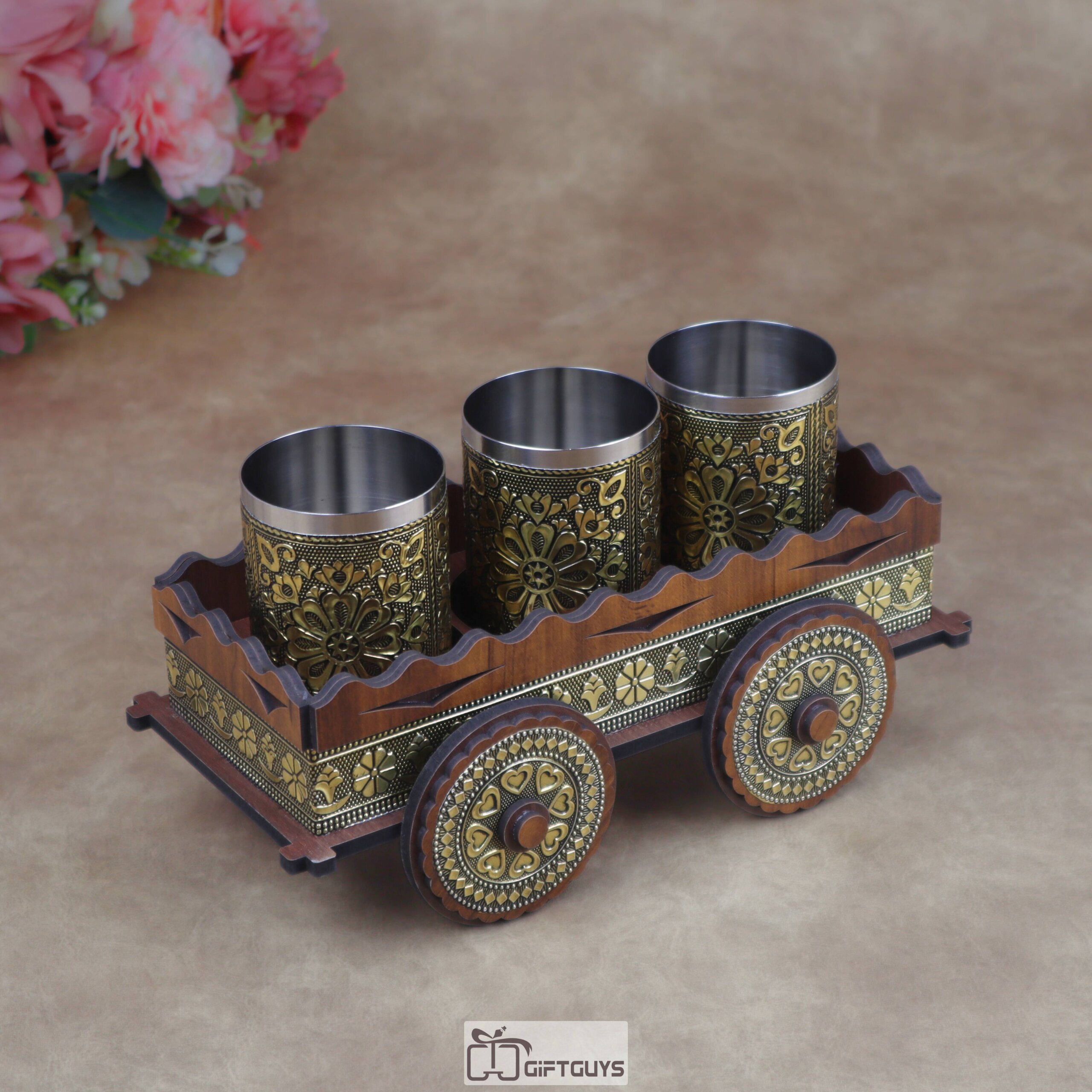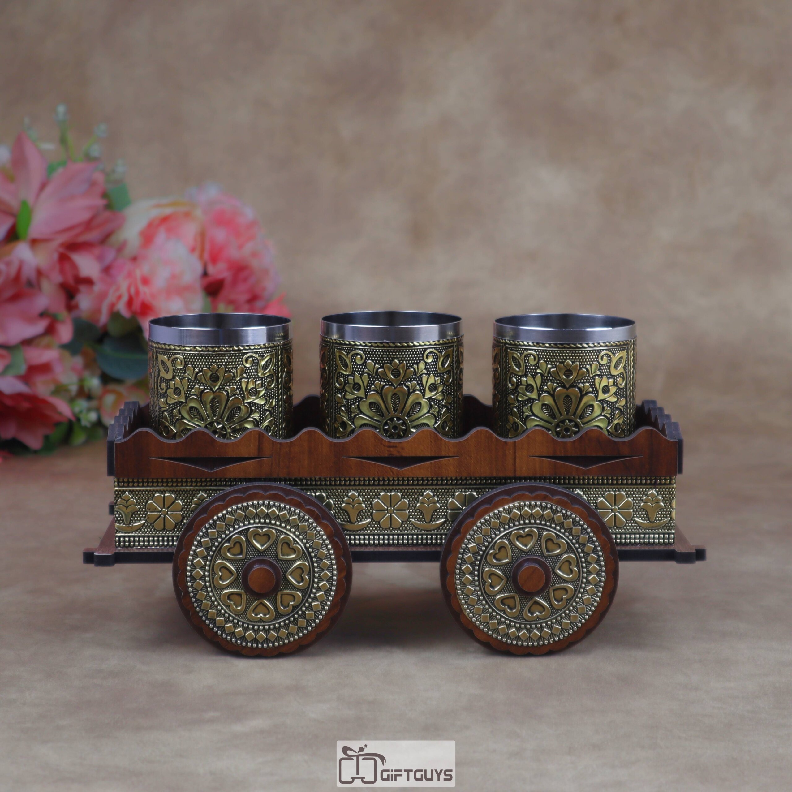 Oxidized Antique Wooden Bullock Cart Serving Tray with Golden Oxidised Steel Glasses | Vintage Ethnic Barware Gift ( Set of 3 Glass )
