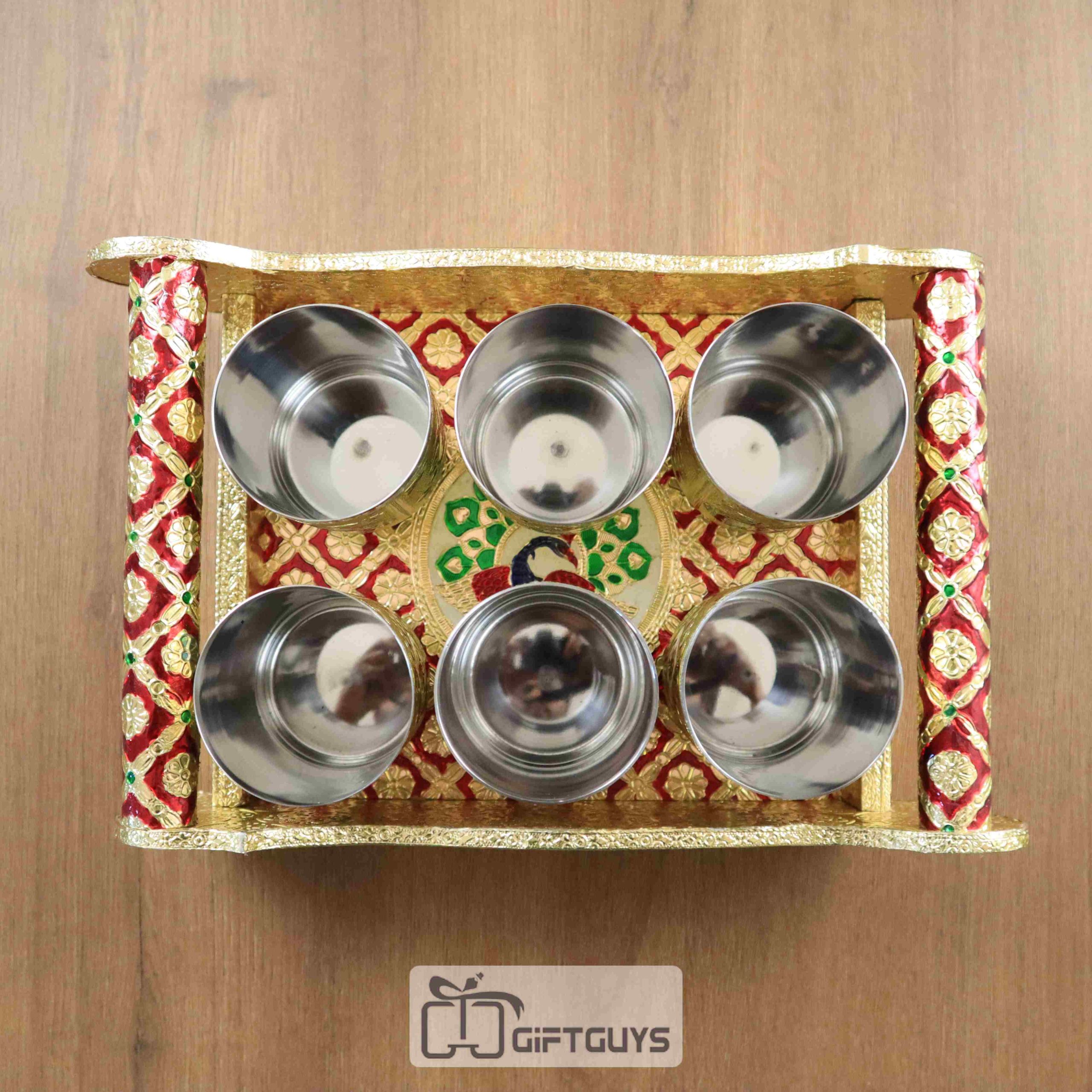 Meenakari Wooden Peacock Tray Set with 6 Matching Steel Glasses – Decorative Gift Set