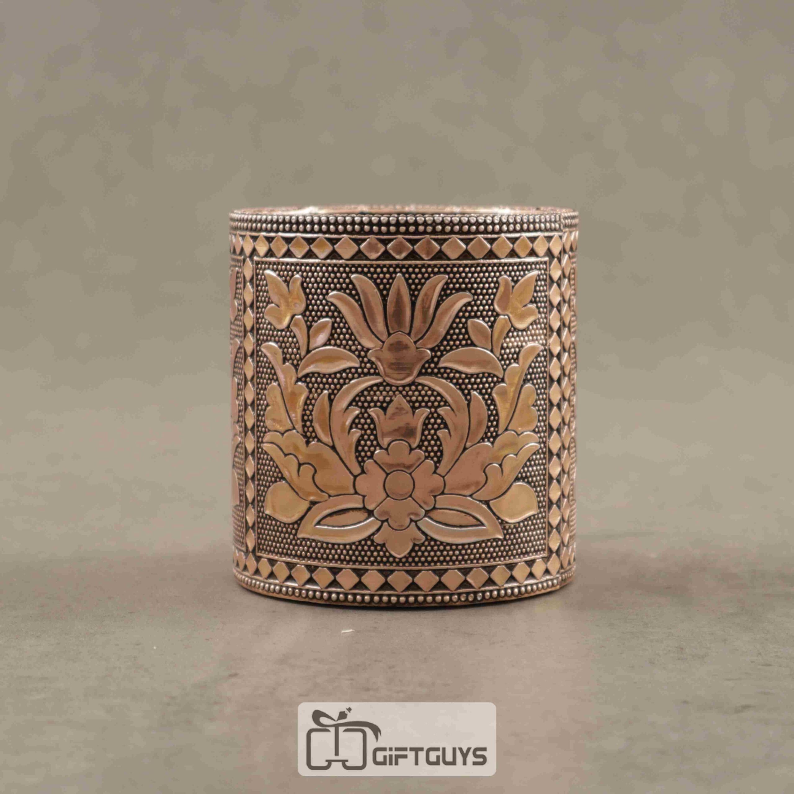 A pen stand with a Copper Oxidised finish and a Flower design would bring a rustic yet elegant touch to your desk or workspace.