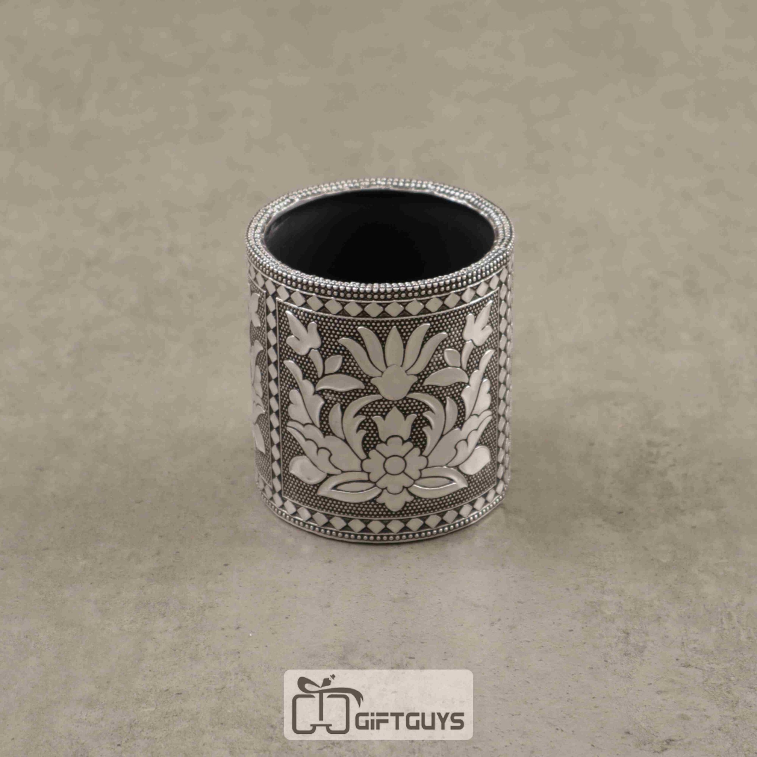 A pen stand with a Silver Oxidised finish and a Flower design would exude elegance and grace on your desk or workspace.