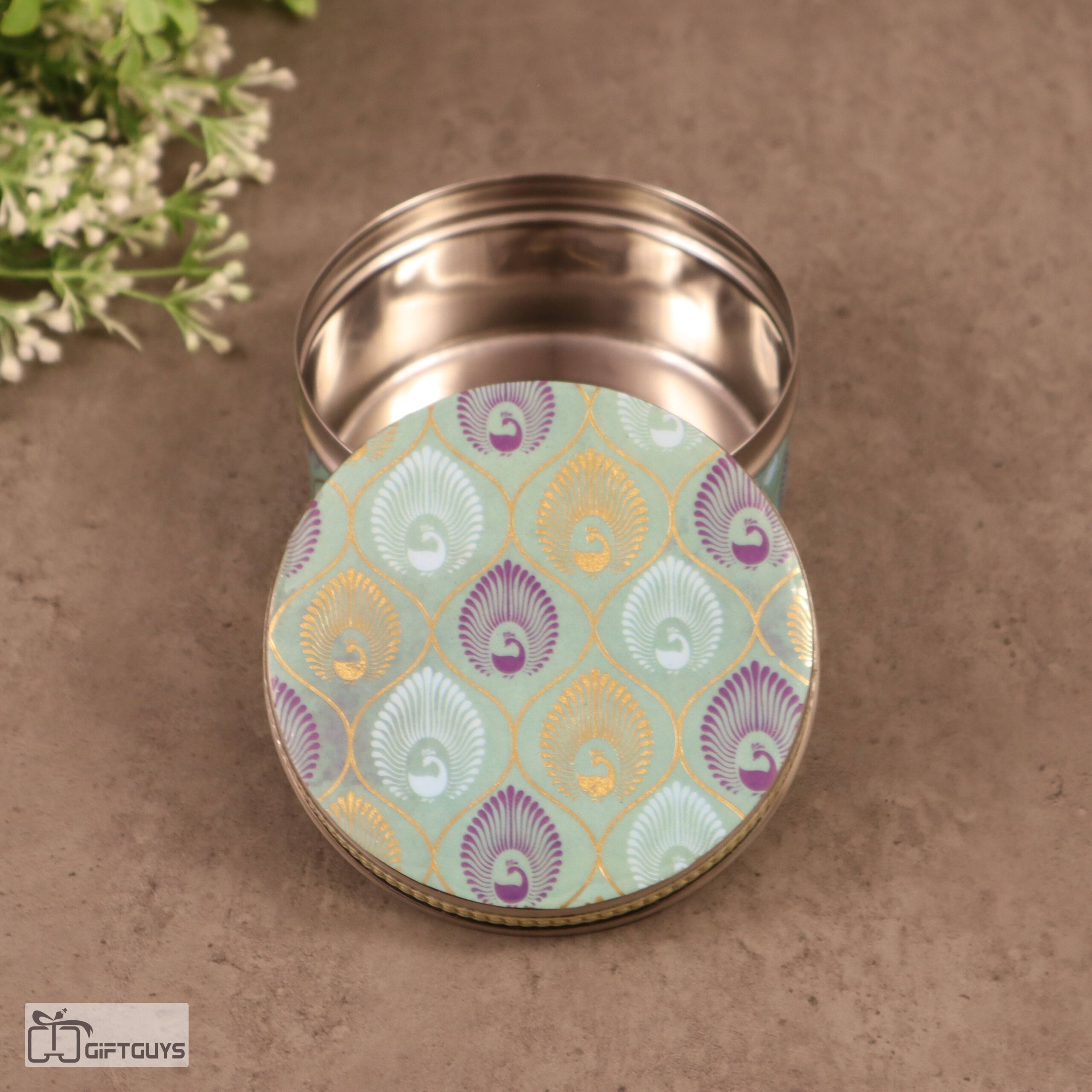 • 🎨 Beautiful Pichwai Design: Inspired by traditional Indian art, this box features intricate peacock feather motifs for a rich, festive look.