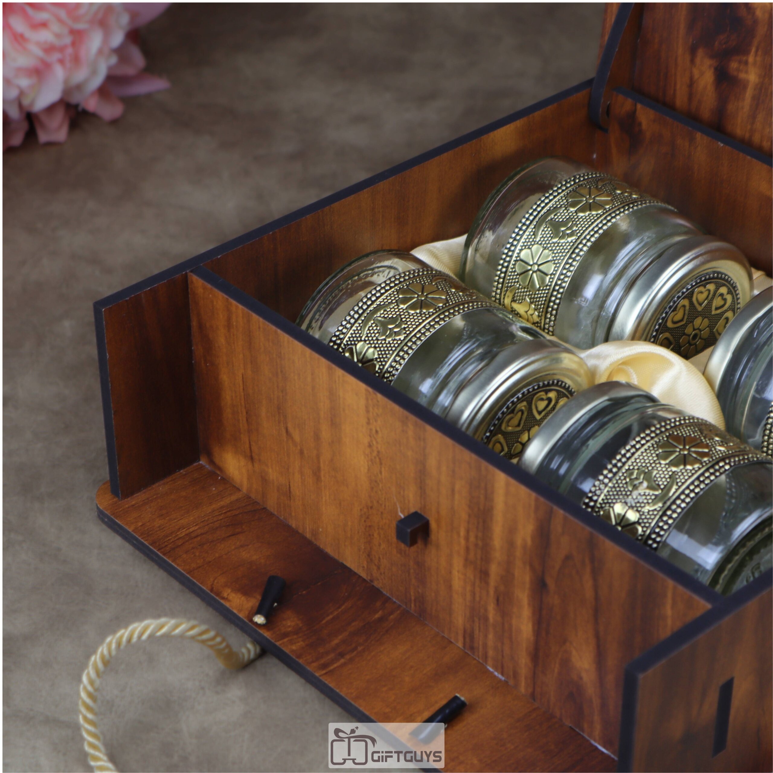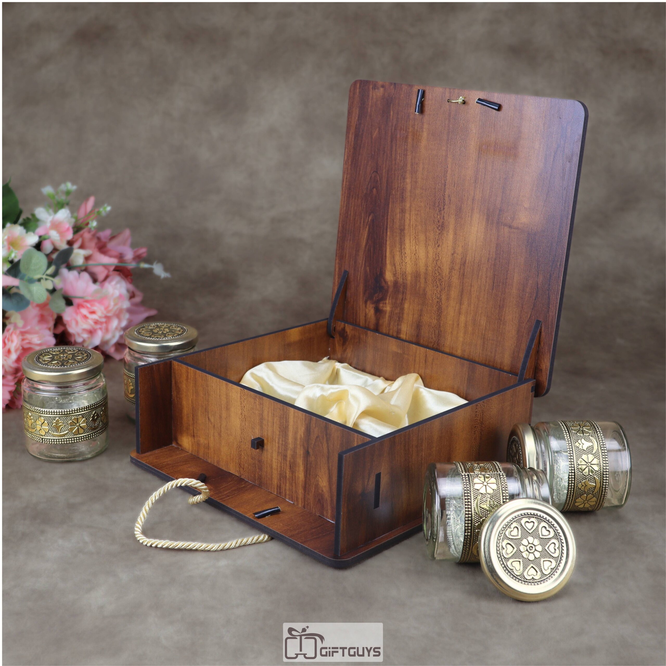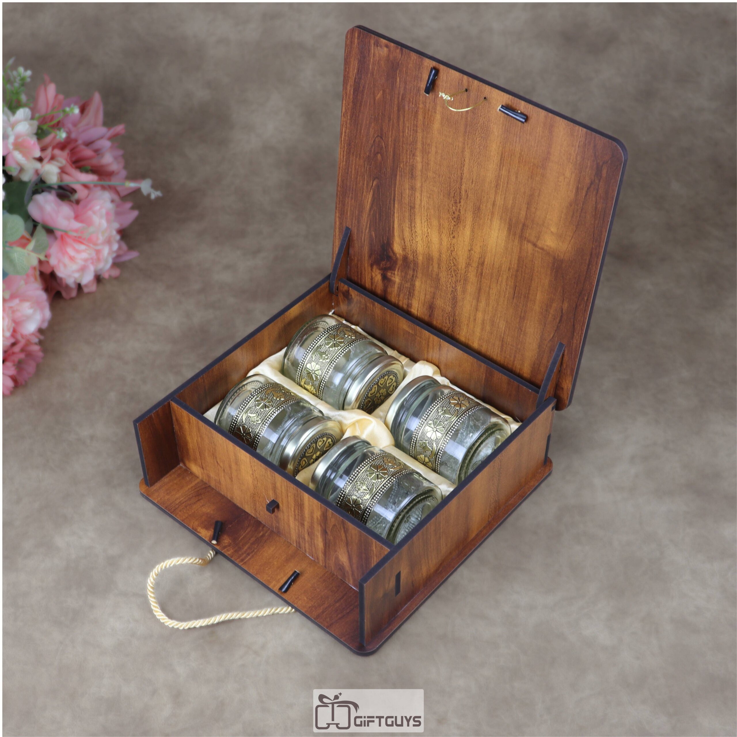 Premium Handcrafted Wooden Gift Box with 4 Oxidized Glass Jars – Designer Peacock Motif Luxury Serving & Storage Set