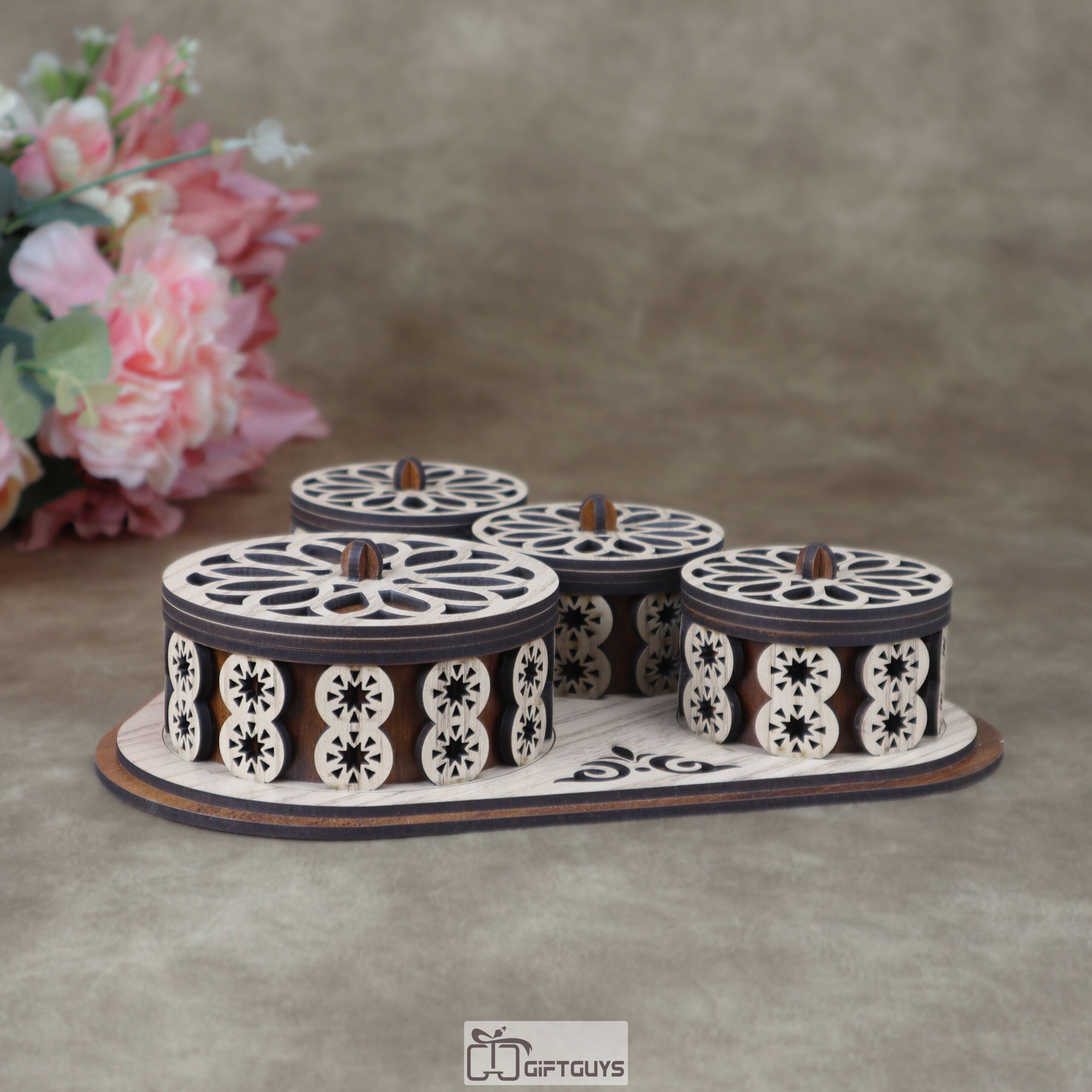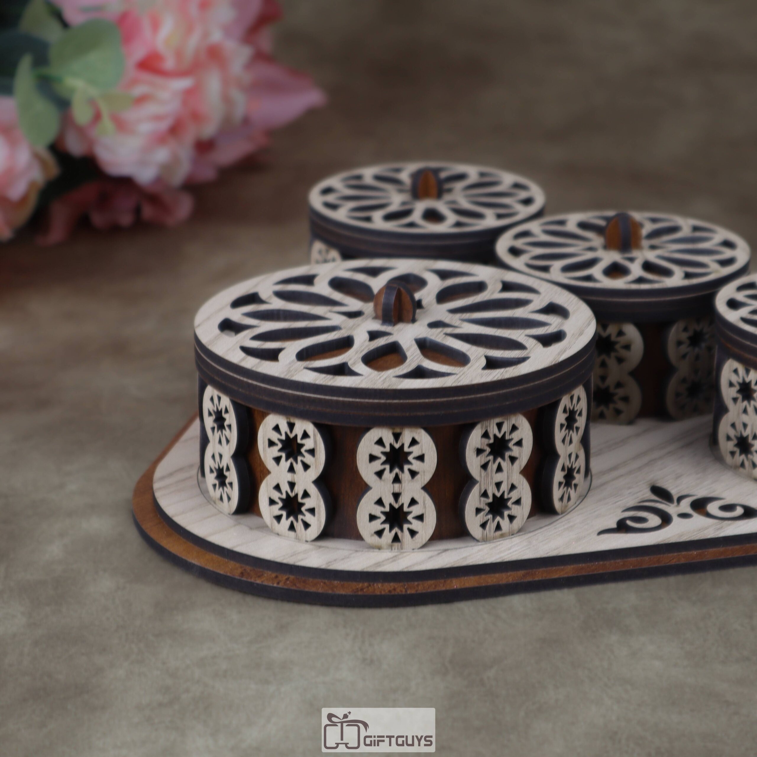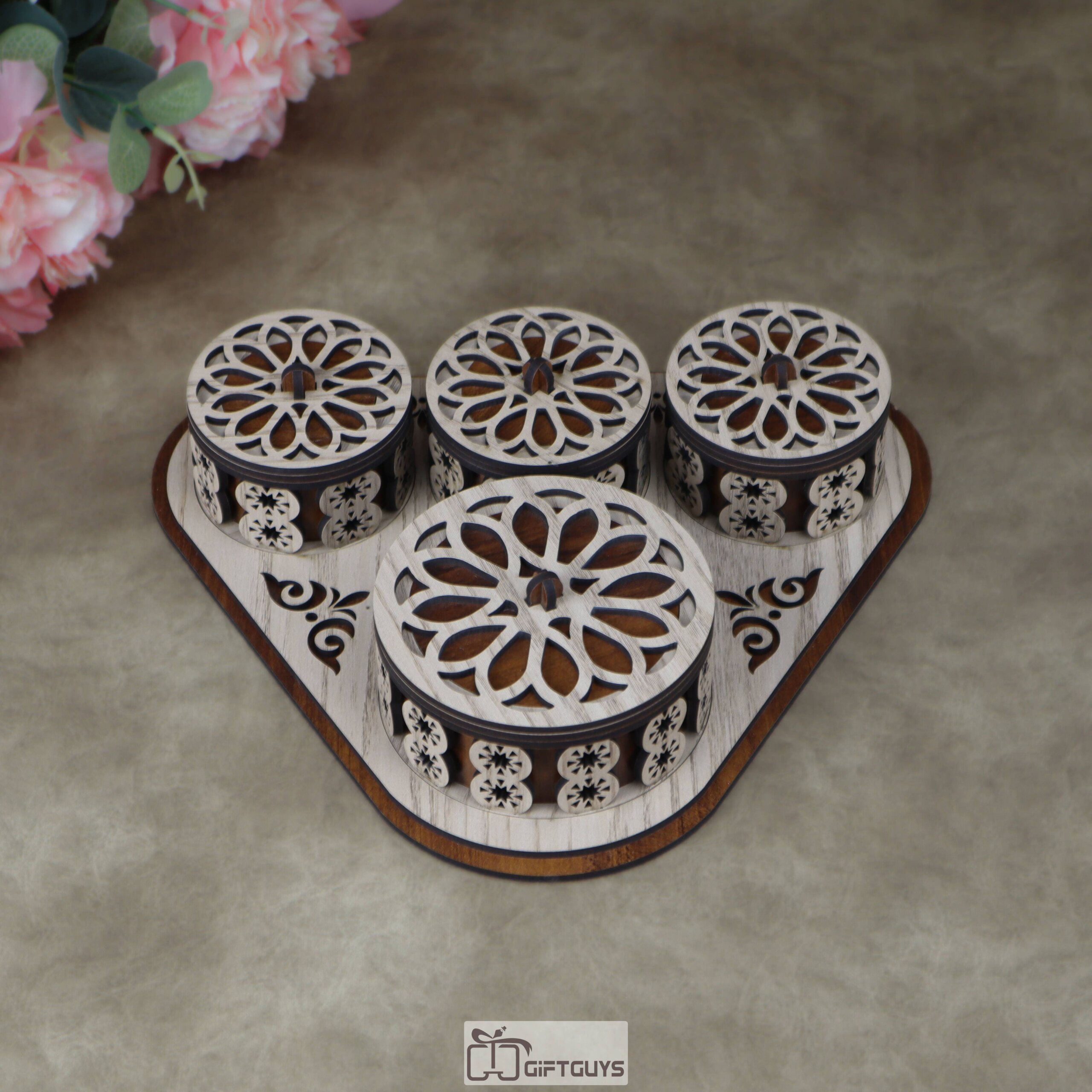 Premium Handcrafted Wooden MDF Dry Fruit Box – 4-Container Laser-Cut Decorative Serving Tray & Organizer
