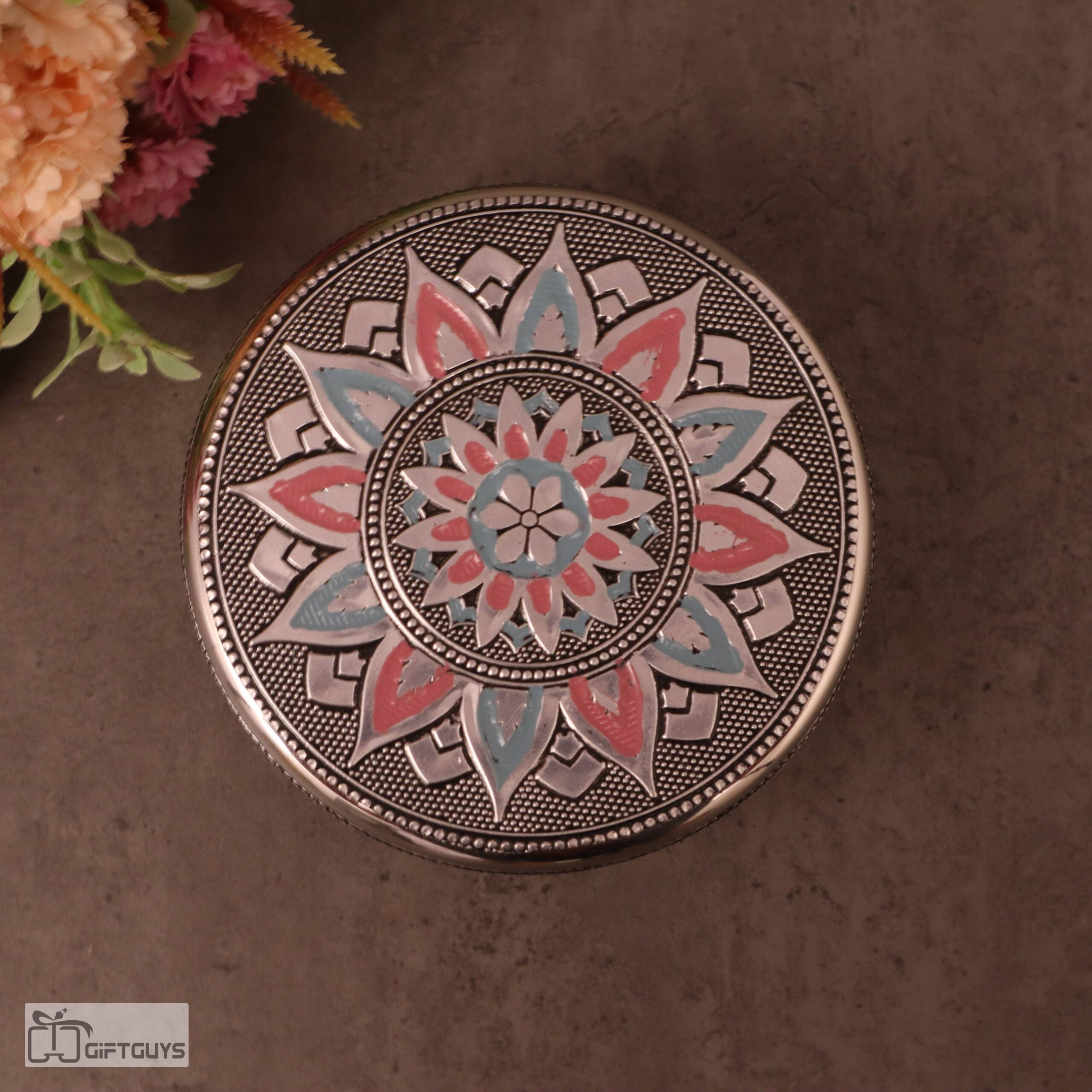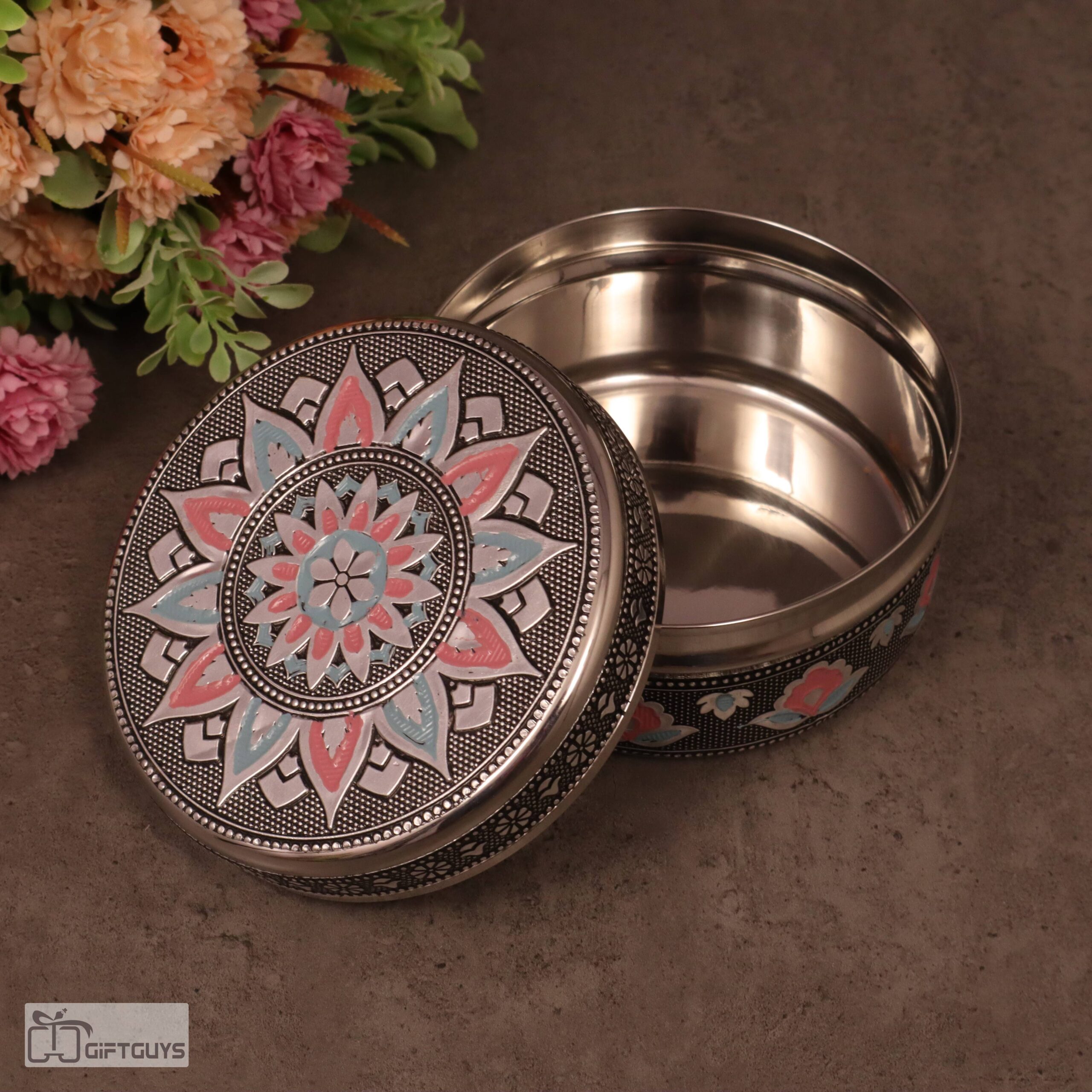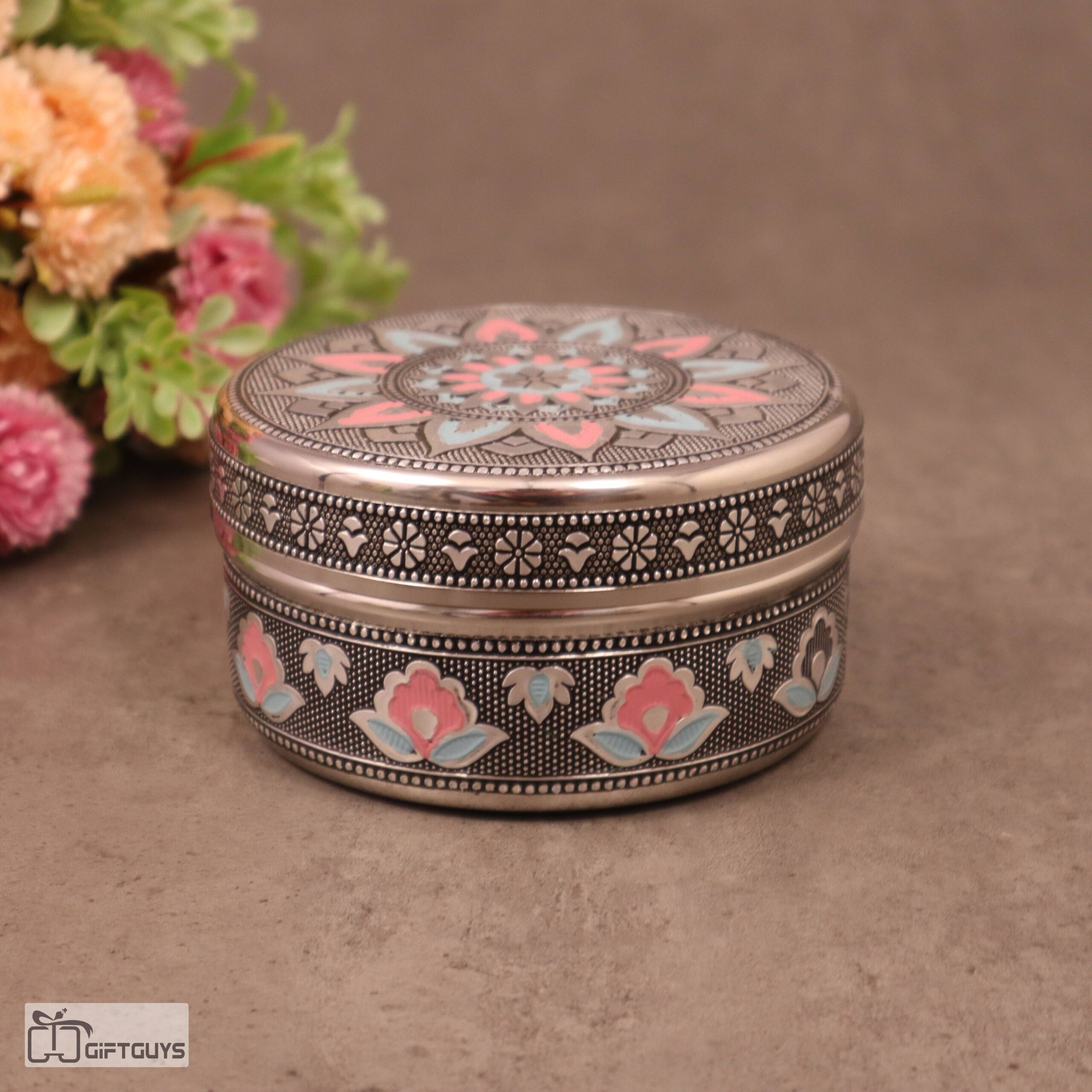 Elegant handcrafted Meenakari steel box with vibrant floral enamel – ideal for gifting, storage, or home décor.