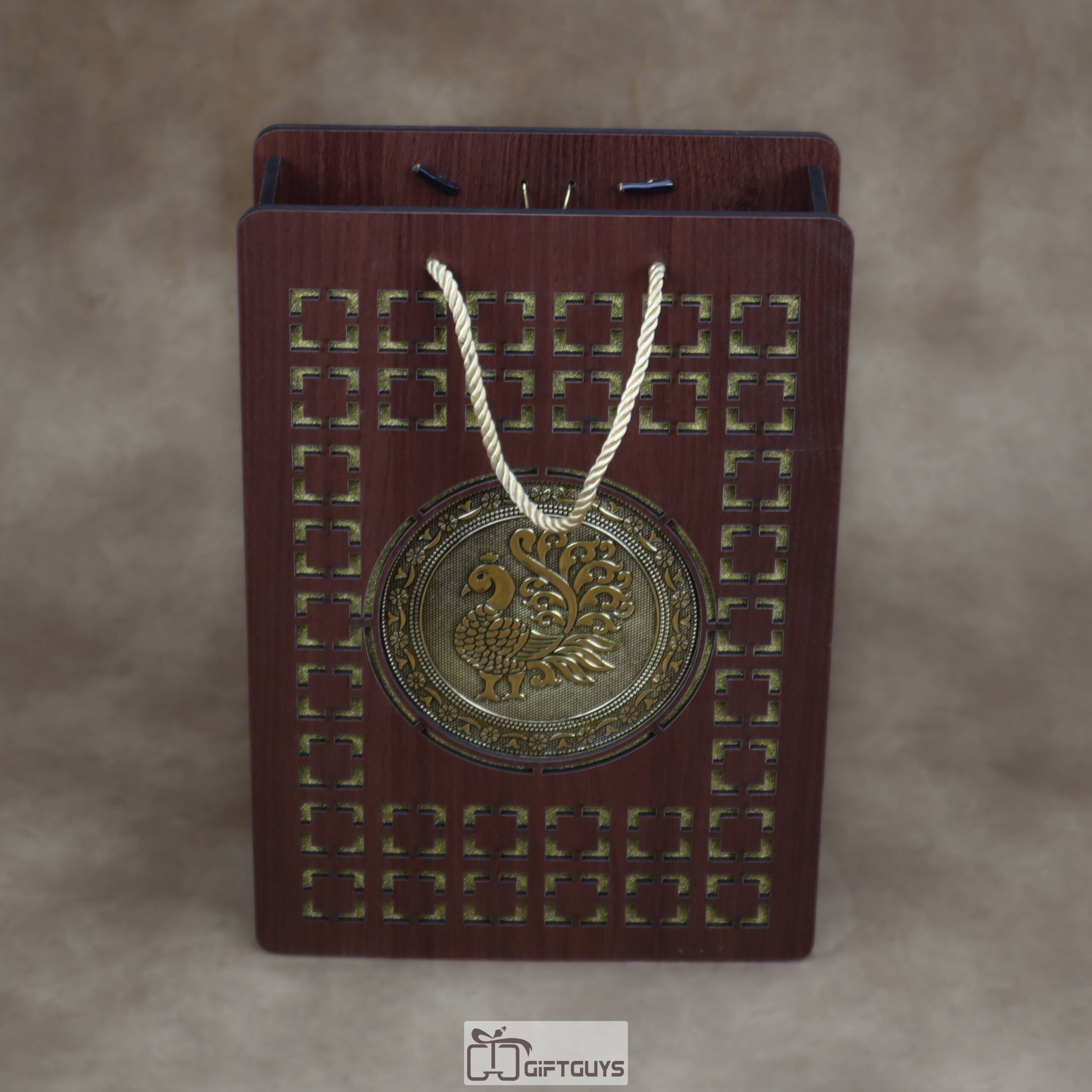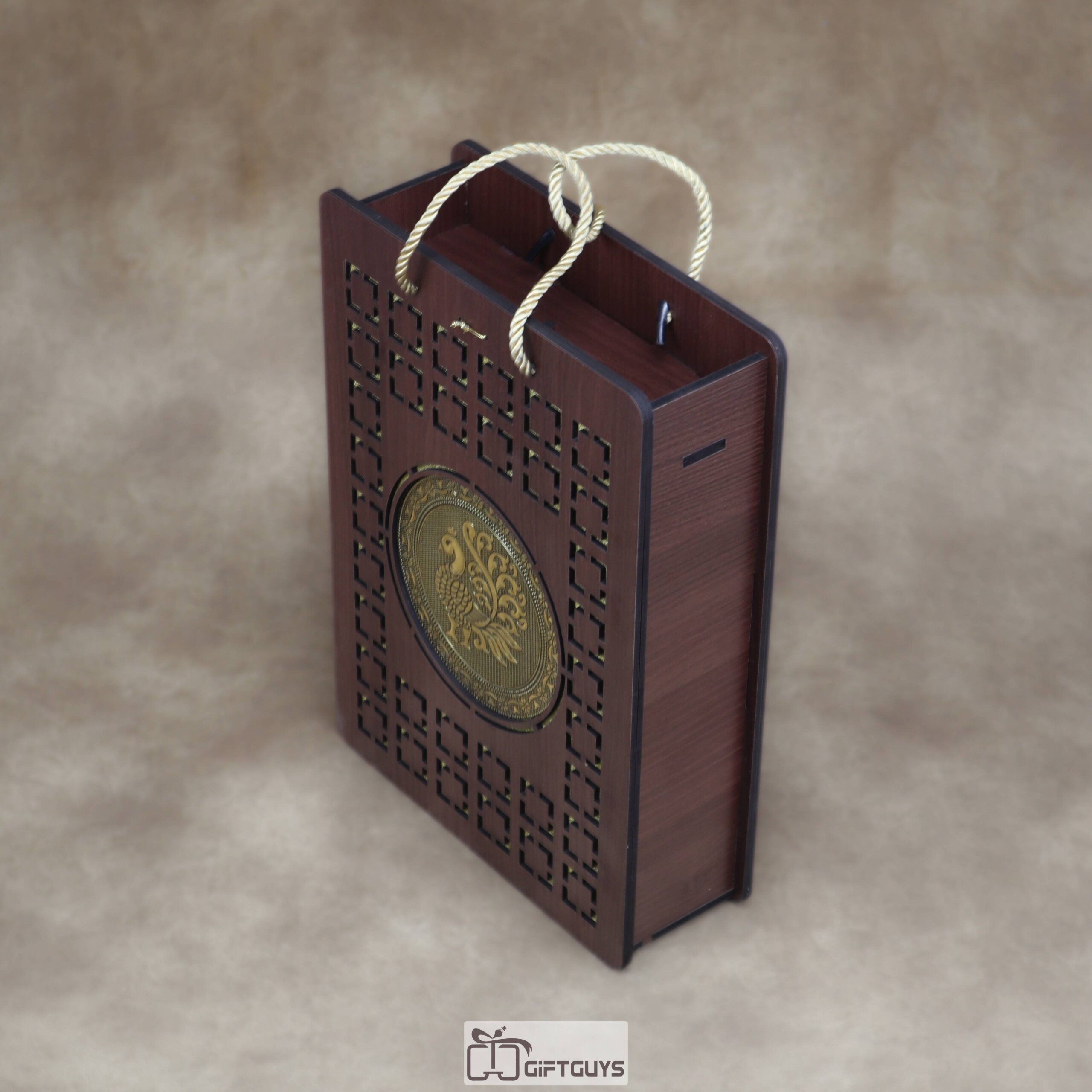 Artisan MDF Packaging: Presented in a luxury, laser-cut dark wood MDF box with a striking Golden-tone Peacock emblem and gold-rope handles for effortless carrying. 🦚