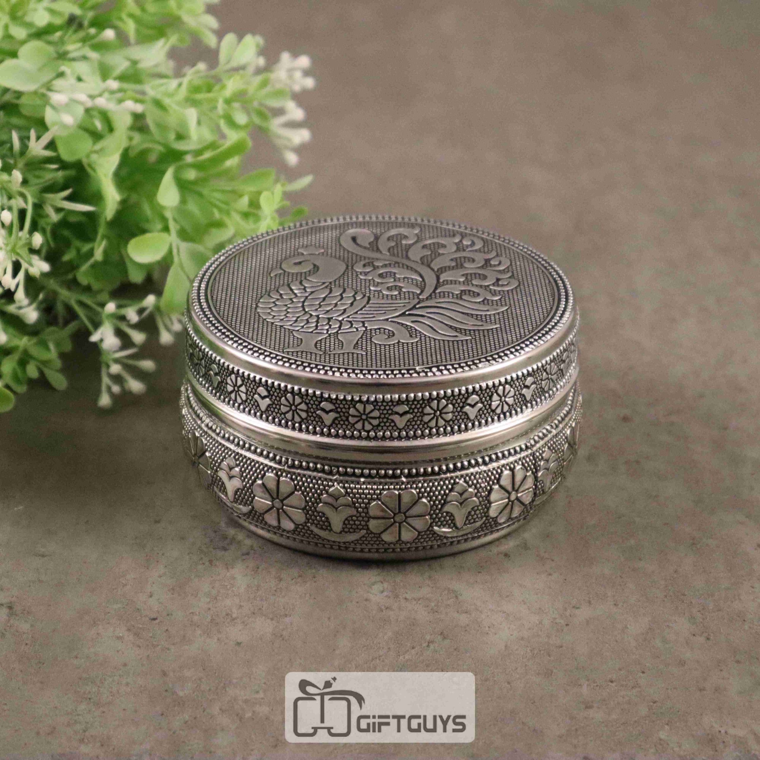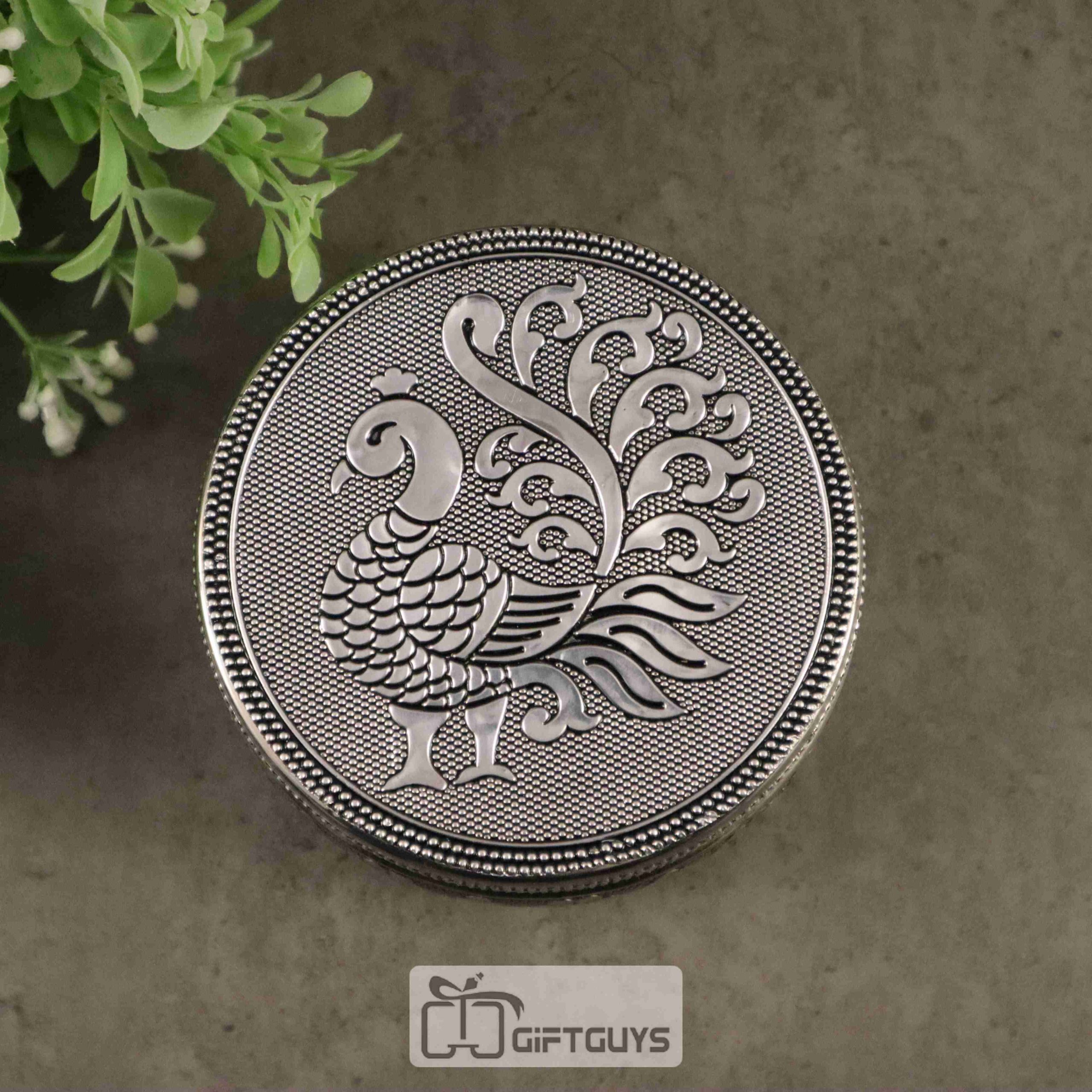 Silver Finish Peacock Design Steel Box – Decorative Storage Tin for Pooja & Return Gifts (4-Inch)
