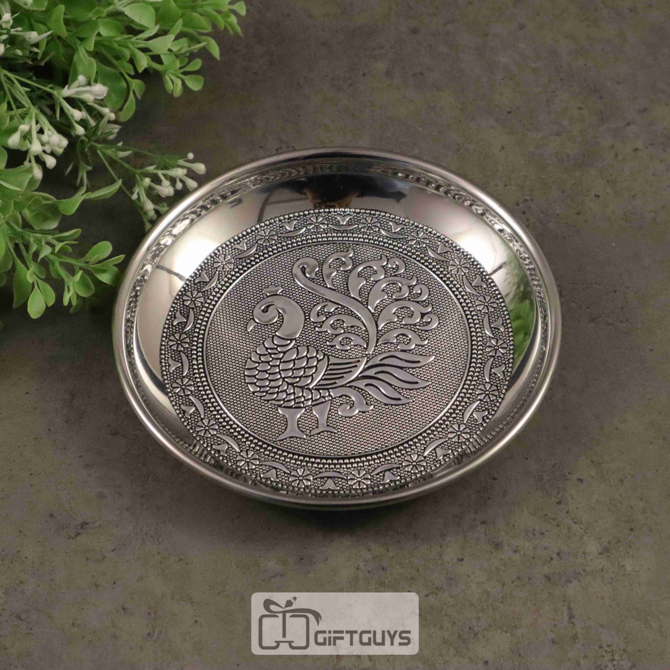 Silver oxidised peacock designed steel plate 6 inch