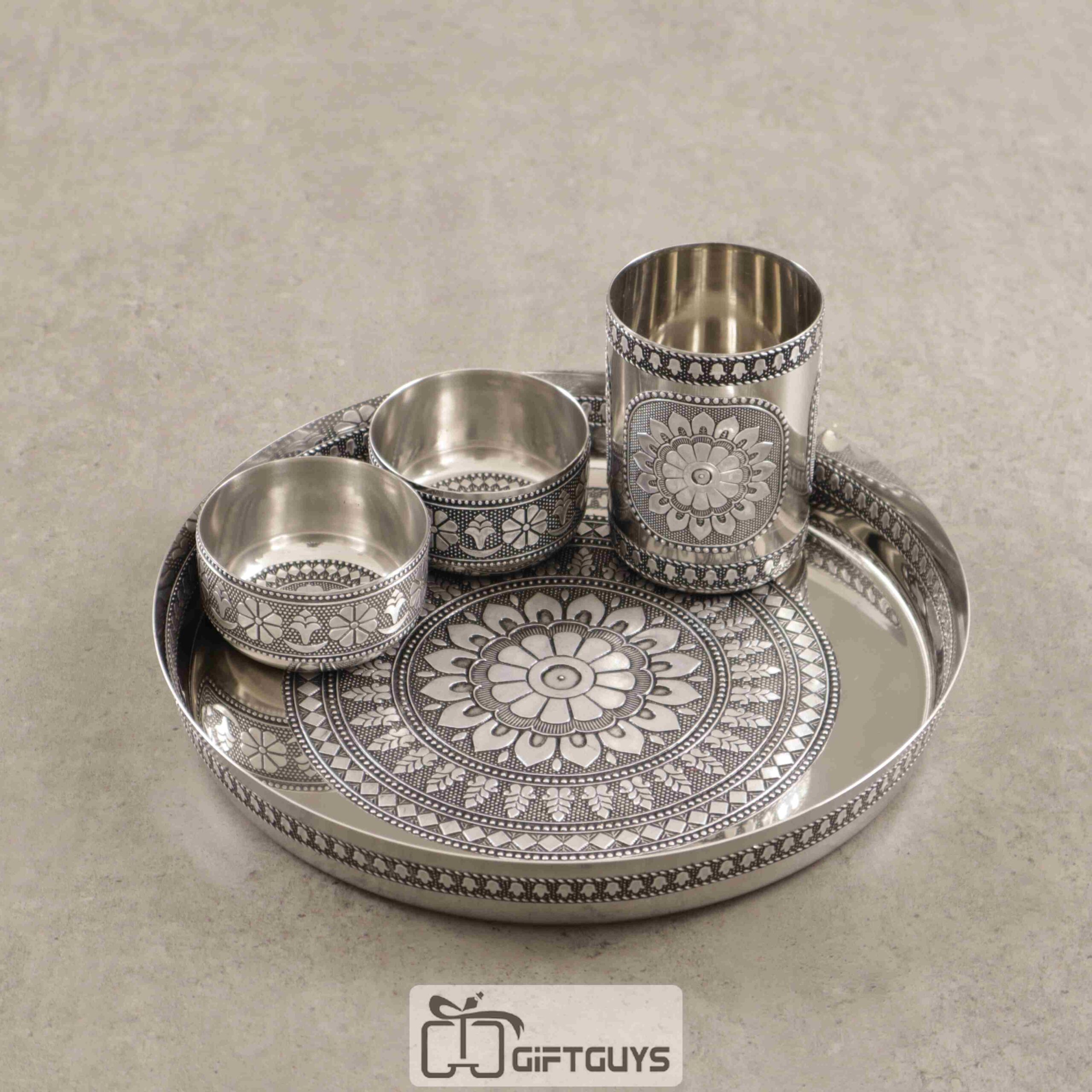 The Silver Oxidised finish imparts a sleek and modern look to the Thali set while still retaining a touch of traditional elegance. This finish offers durability and ease of maintenance, ensuring that your Thali set remains in excellent condition over time.