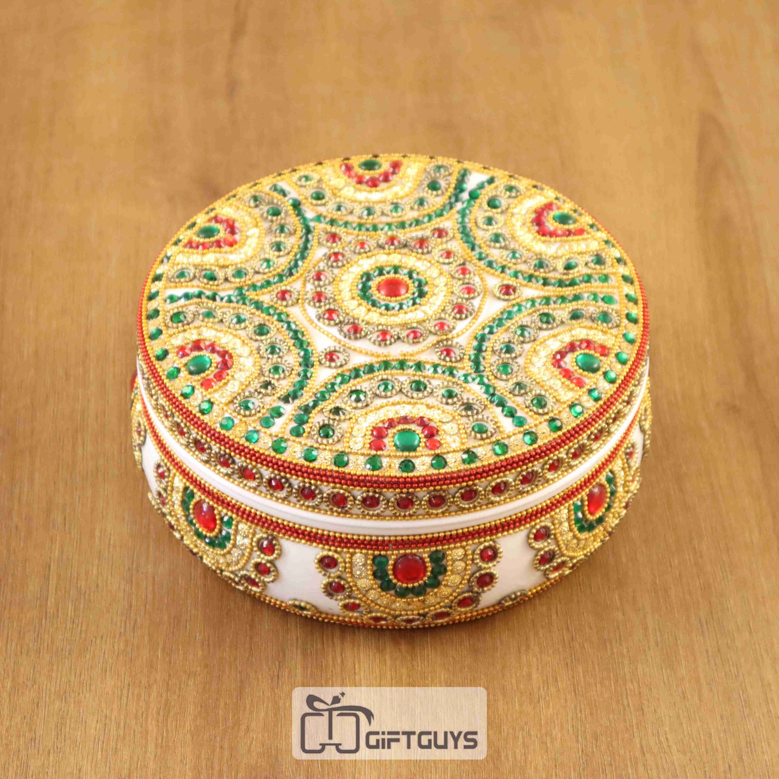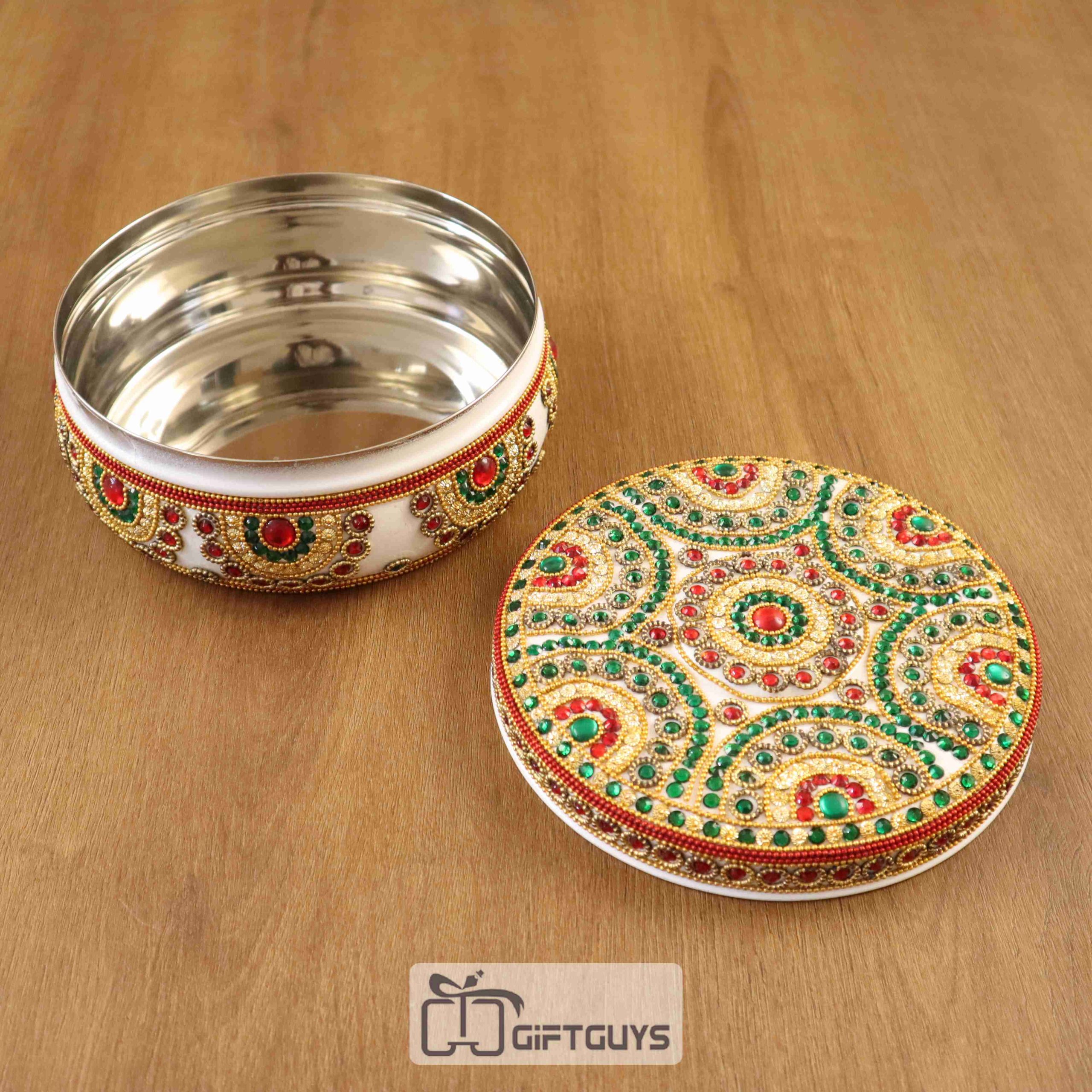 A Stone Worked Handcrafted Stainless Steel (SS) Lunch Box is a unique fusion of modern durability and traditional craftsmanship. Made from high-quality stainless steel, this lunch box is enhanced with intricate stone work, often featuring semi-precious stones like turquoise, onyx, or jade. The stone embellishments add a luxurious, artistic touch to the sturdy metal base. These lunch boxes are both functional and decorative, offering multiple compartments to store different foods. The combination of stone detailing and stainless steel ensures that the lunch box is not only durable and easy to clean but also a beautiful and distinctive accessory for everyday use.