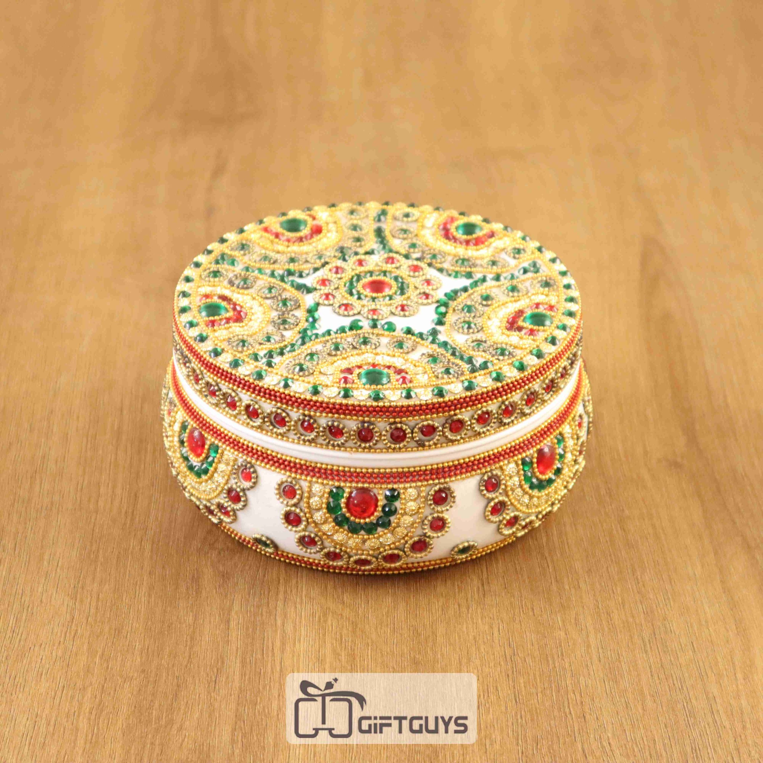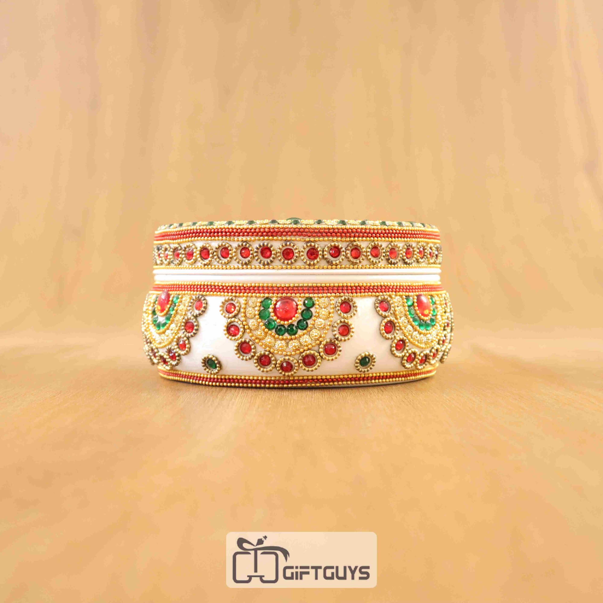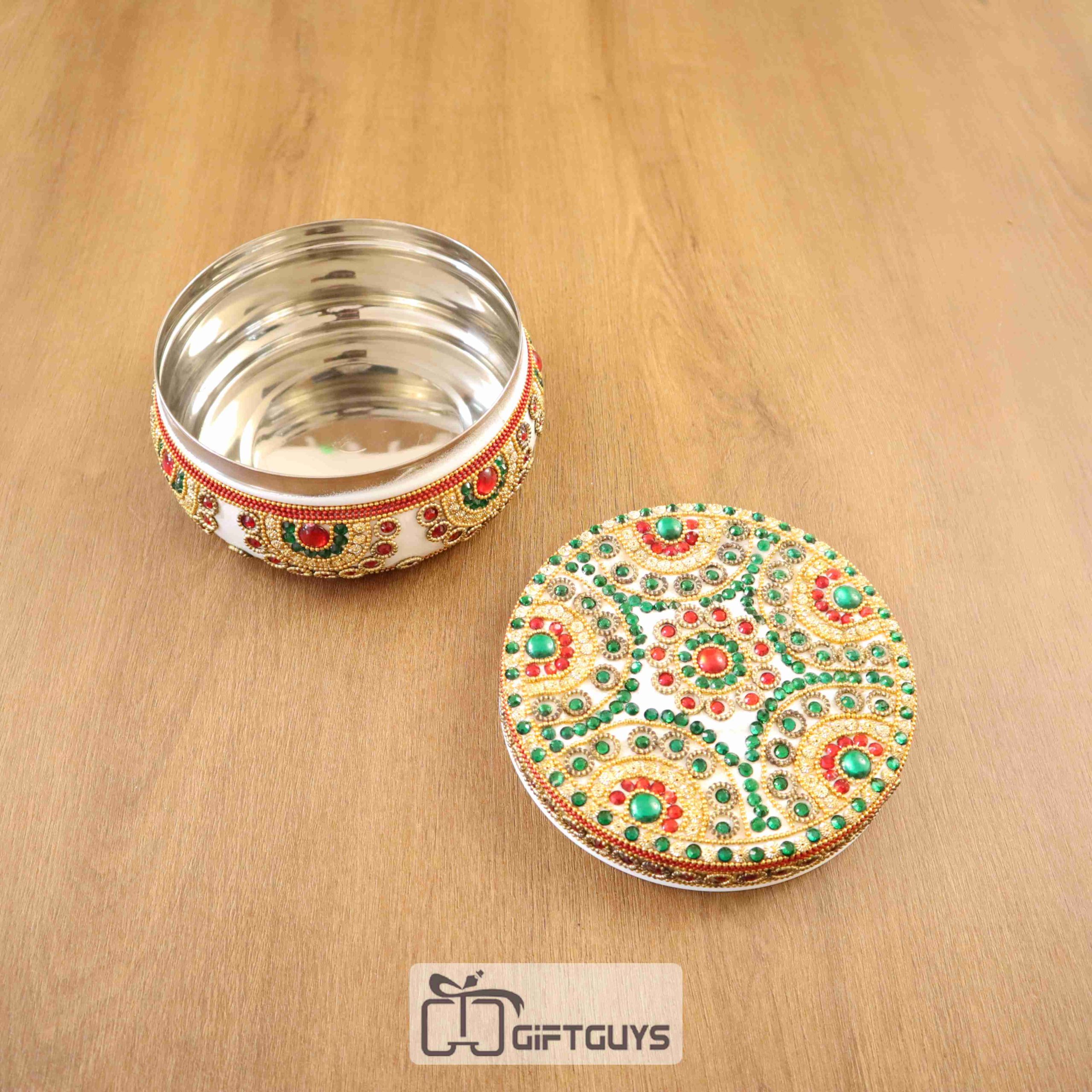 A Stone Worked Handcrafted Stainless Steel (SS) Lunch Box is a unique fusion of modern durability and traditional craftsmanship. Made from high-quality stainless steel, this lunch box is enhanced with intricate stone work, often featuring semi-precious stones like turquoise, onyx, or jade. The stone embellishments add a luxurious, artistic touch to the sturdy metal base. These lunch boxes are both functional and decorative, offering multiple compartments to store different foods. The combination of stone detailing and stainless steel ensures that the lunch box is not only durable and easy to clean but also a beautiful and distinctive accessory for everyday use.