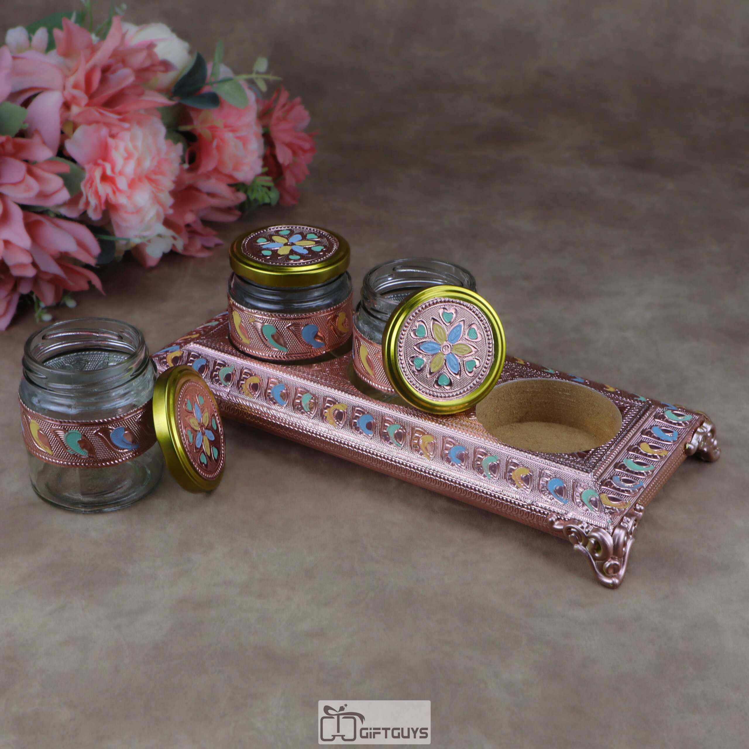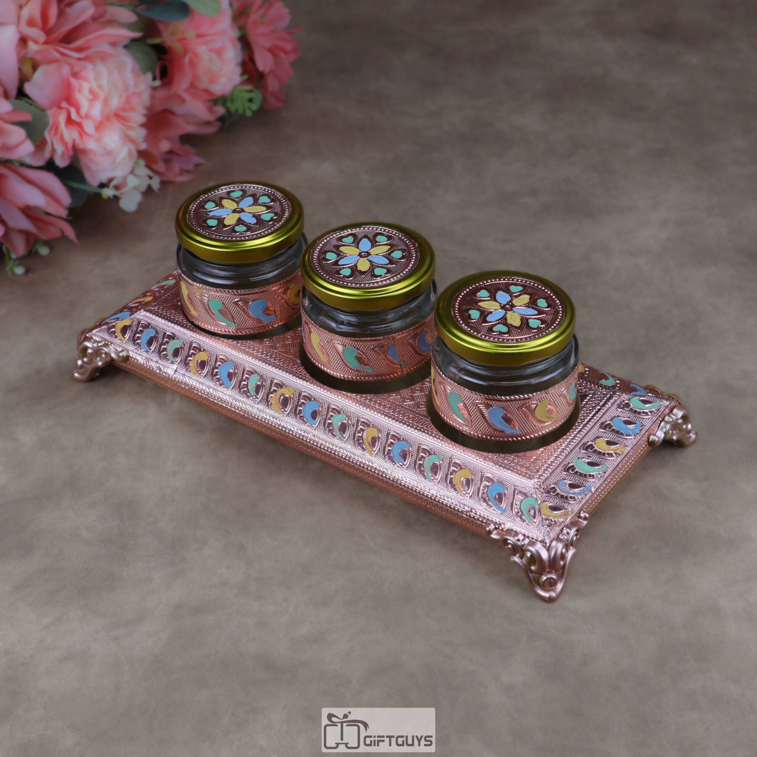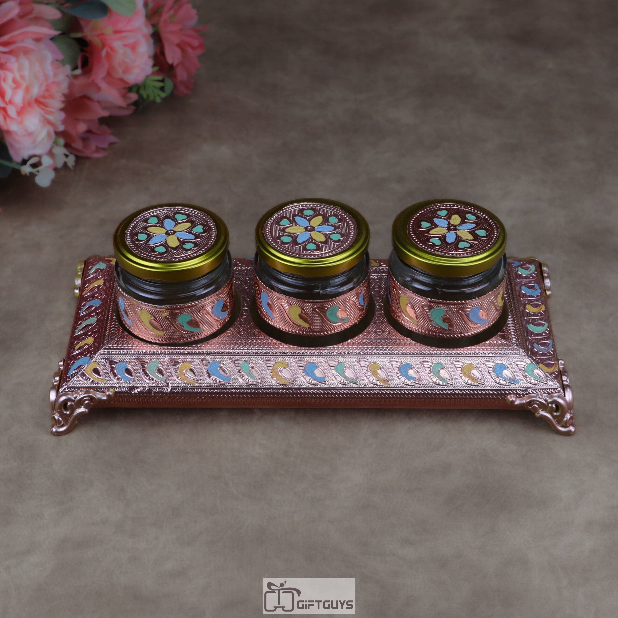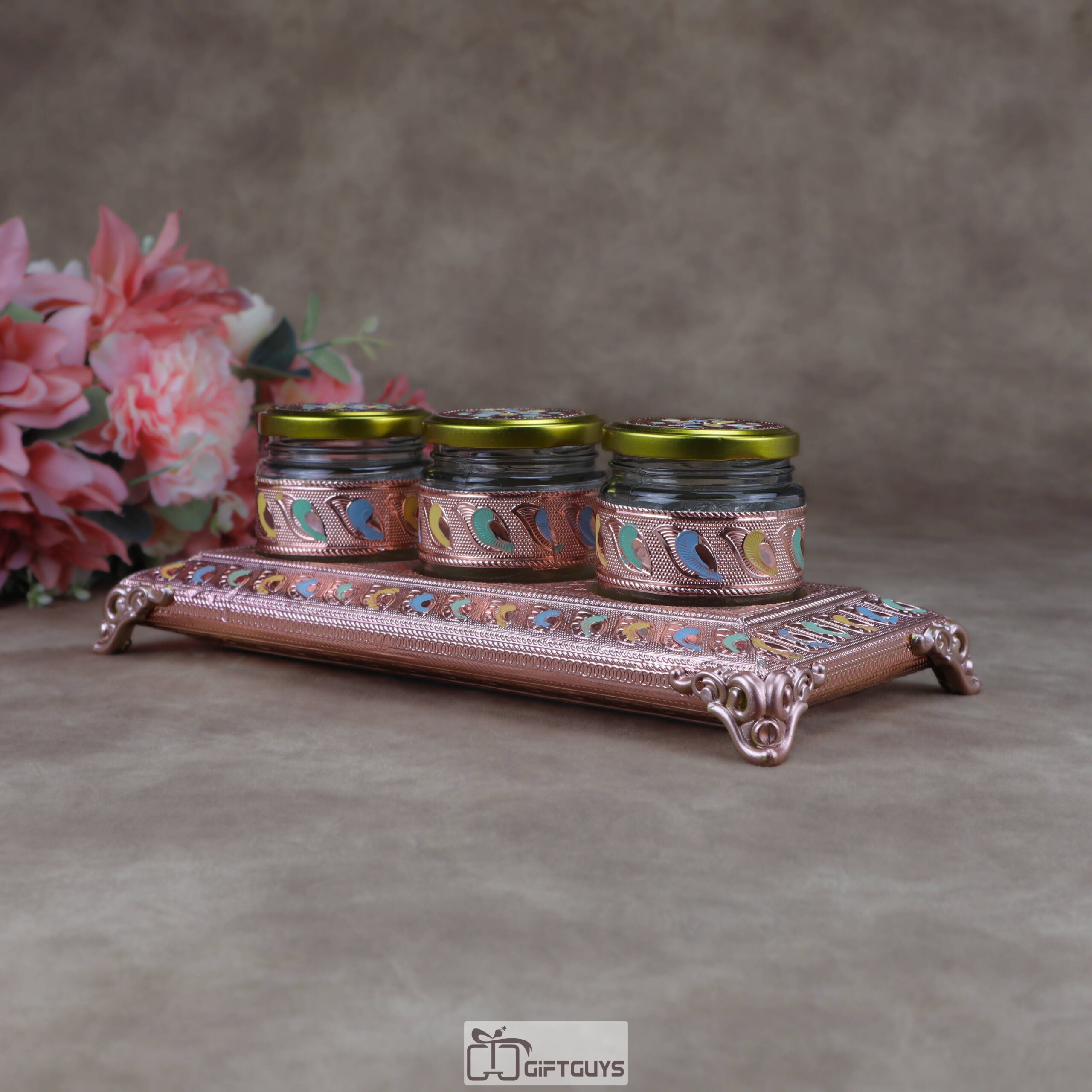 Traditional Rose-Gold Meenakari Wooden Serving Tray with 3 Glass Jars | Designer Dry Fruit & Mukhwas Organizer Set | Luxury Indian Festive Gift