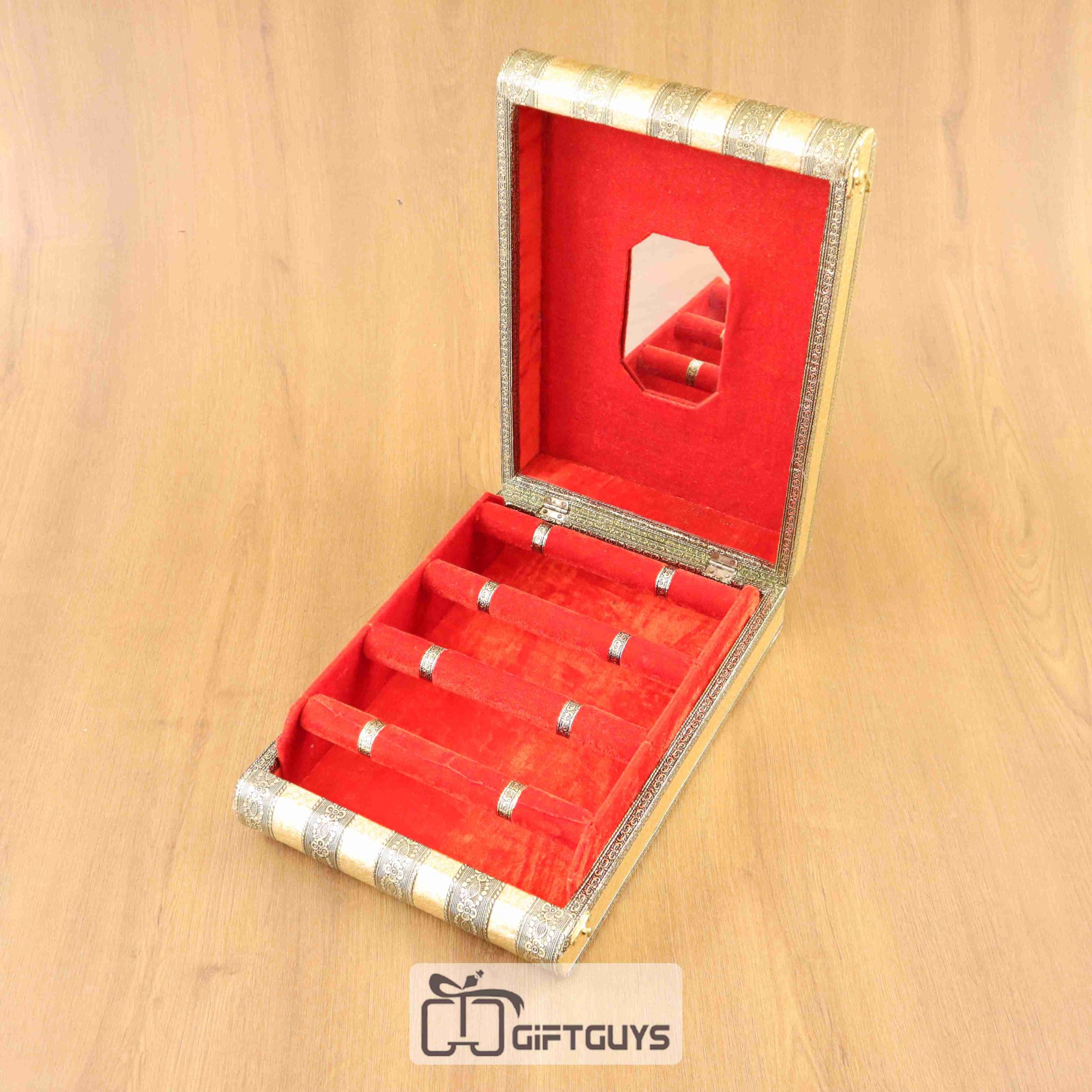 Be the first to review “Textured golden finish box with 4 red velvet roll for bangle storage.”