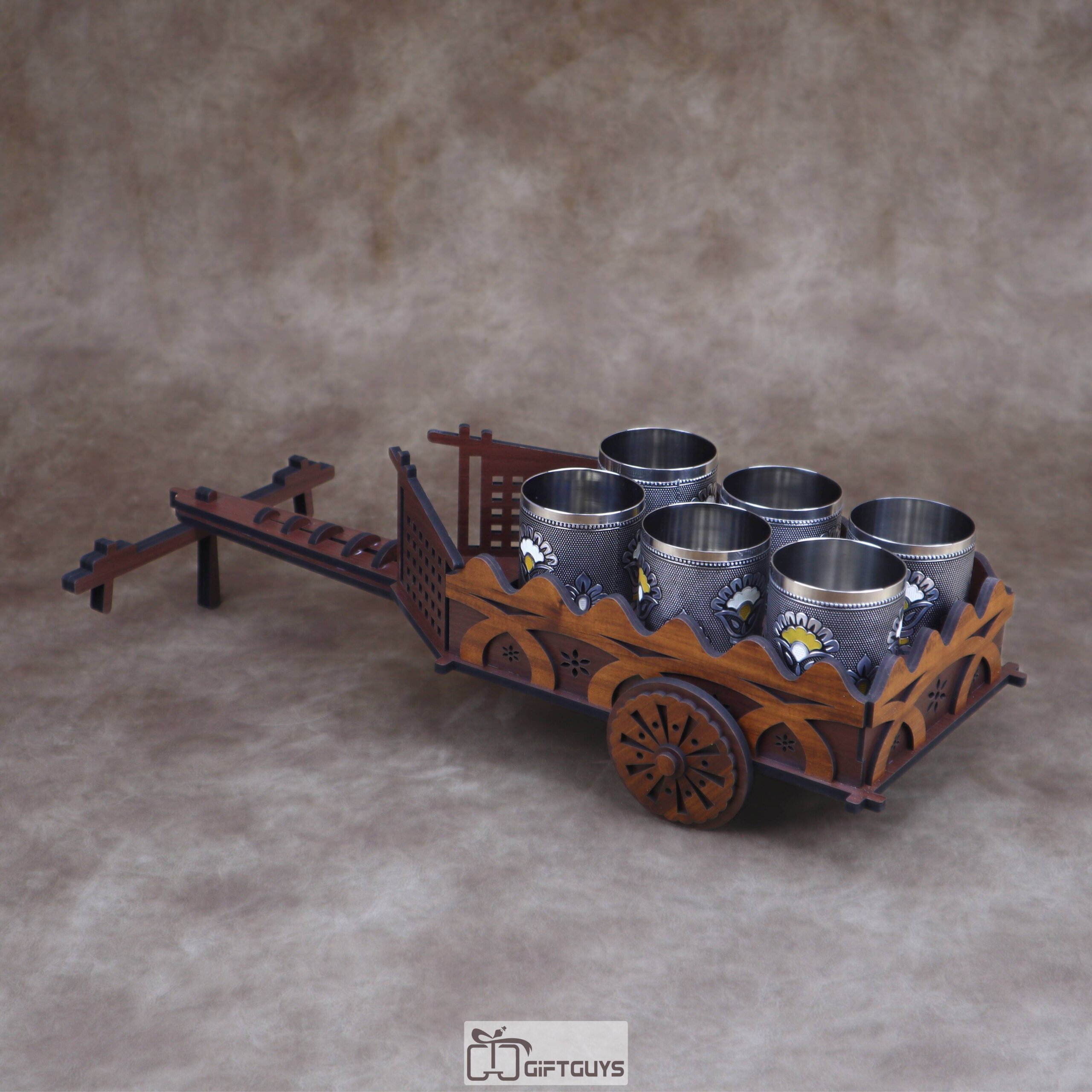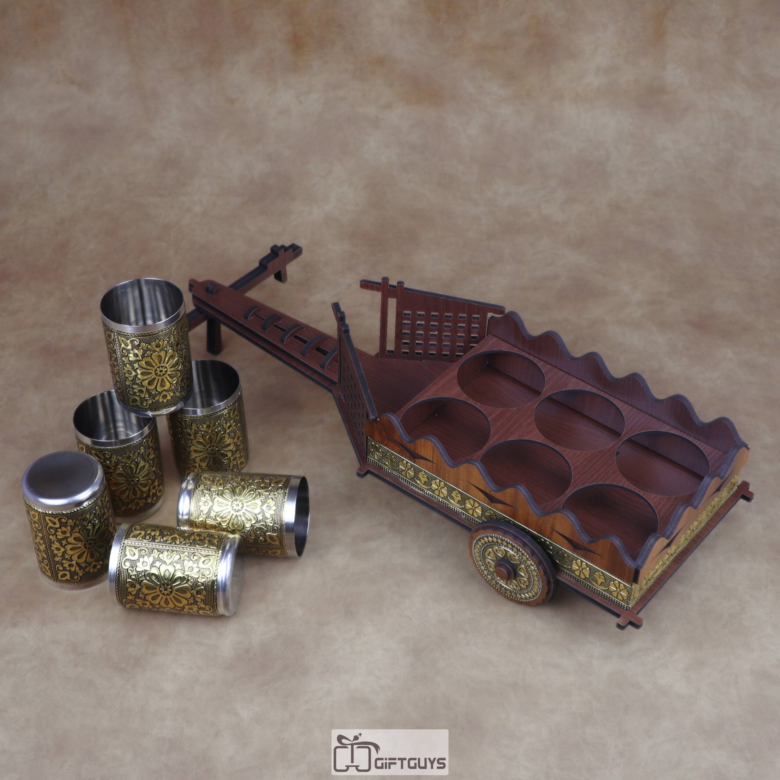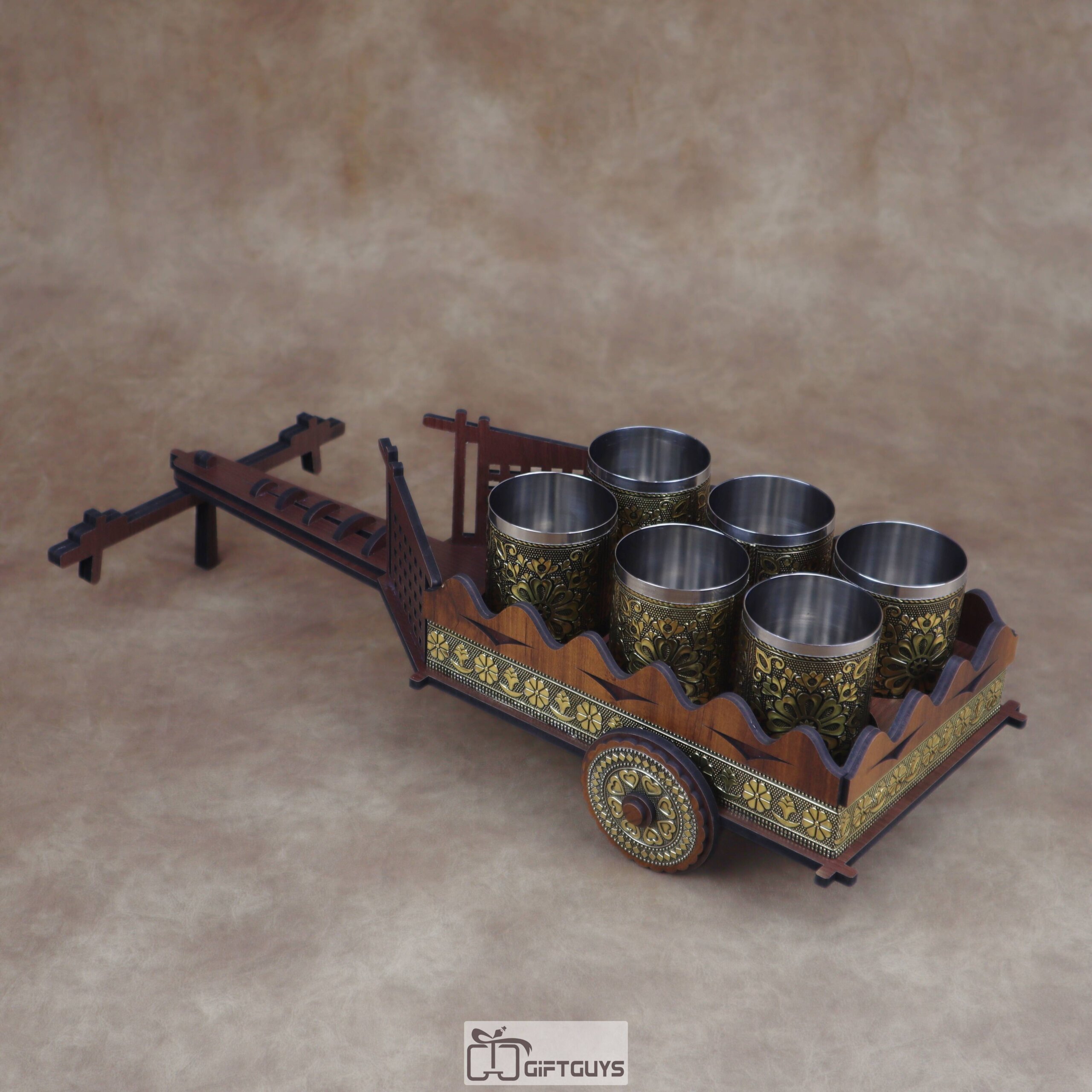 Traditional Wooden Bullock Cart Serving Tray with 6 Designer Stainless Steel Glasses | Ethnic Barware Gift